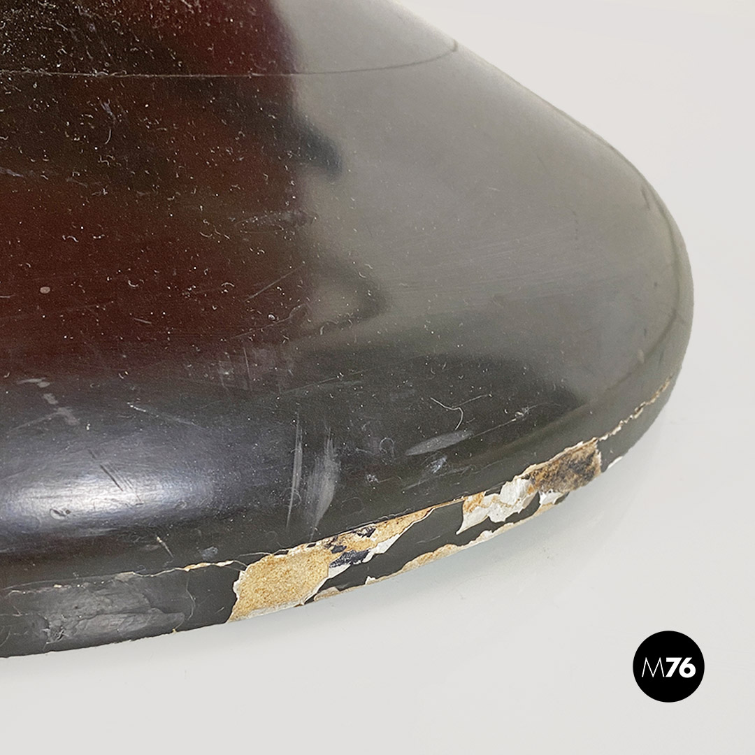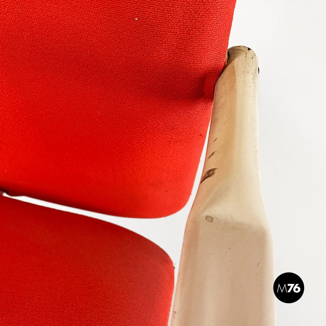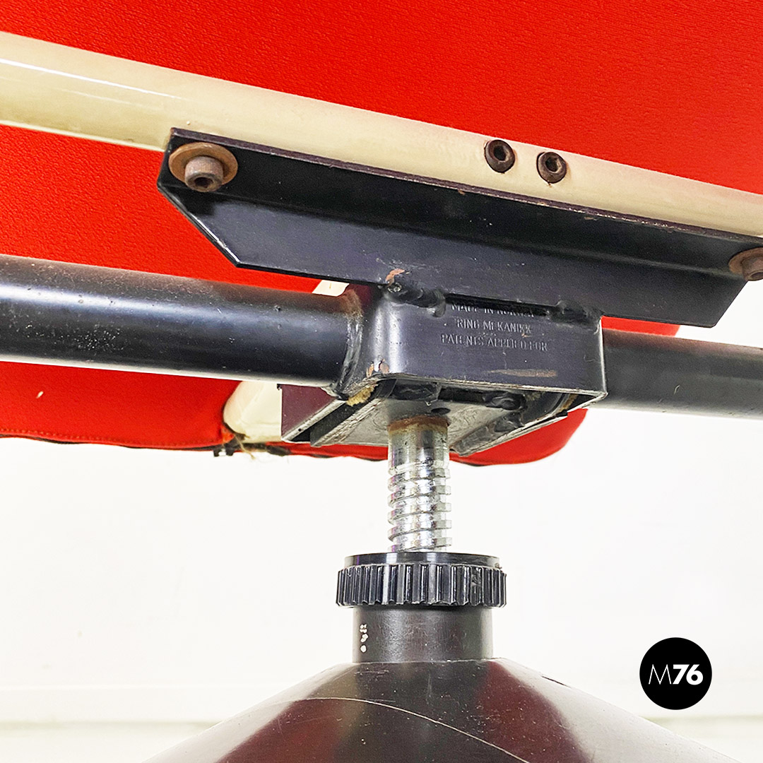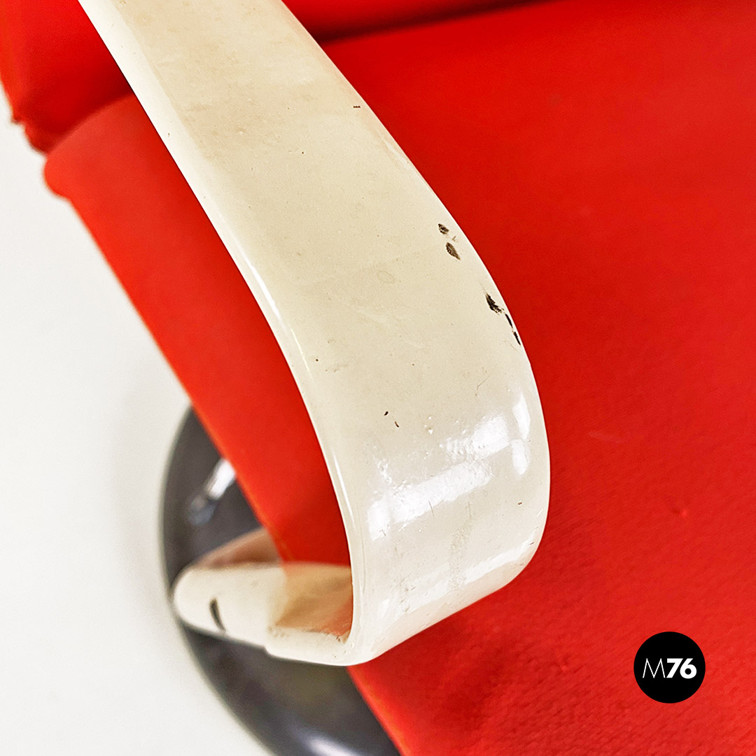 Poltrona con seduta curvata e imbottita rivestita in tessuto originale rosso così come lo schienale e con braccioli in metallo bianco in patina e base in legno con possibilità di regolare l’altezza.