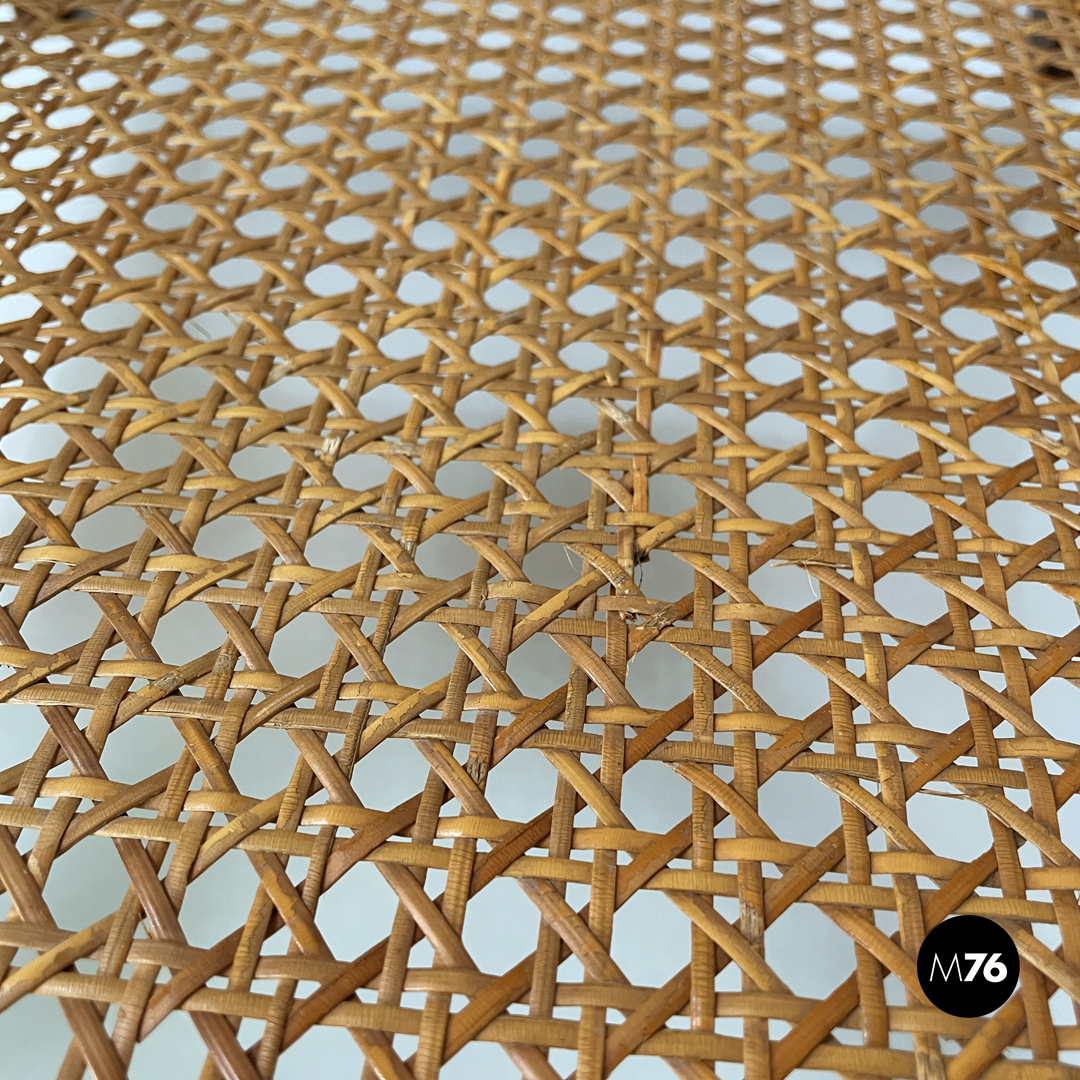 Poltrona a base rettangolare. La seduta e lo schienale sono rivestiti in paglia di Vienna. La struttura è interamente in legno a sezione rettangolare con lo schienale leggermente reclinato ed i braccioli dal profilo curvo. I quattro piedini sono anch’essi a sezione rettangolare.