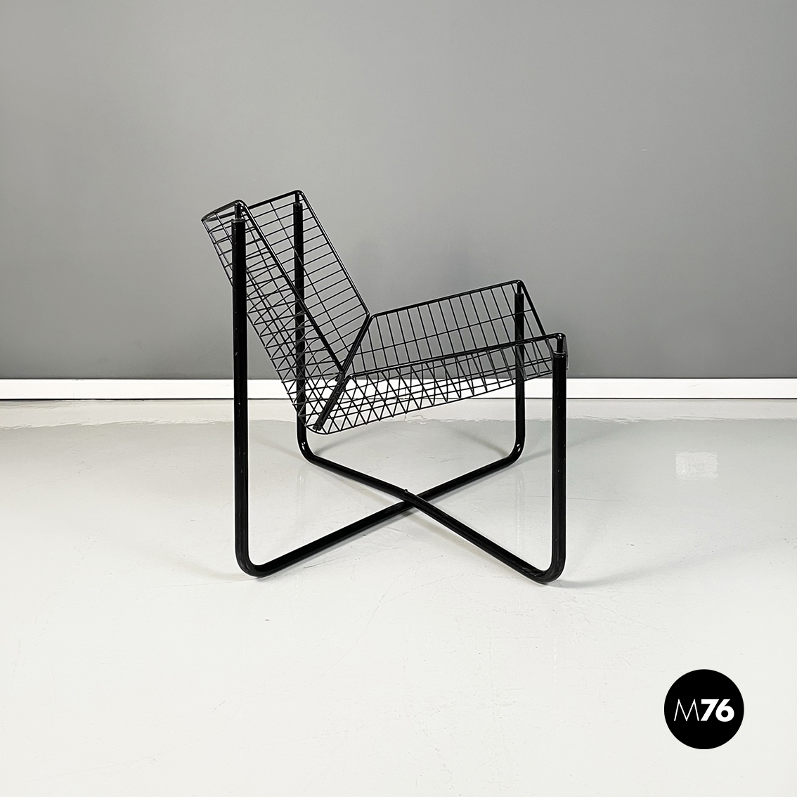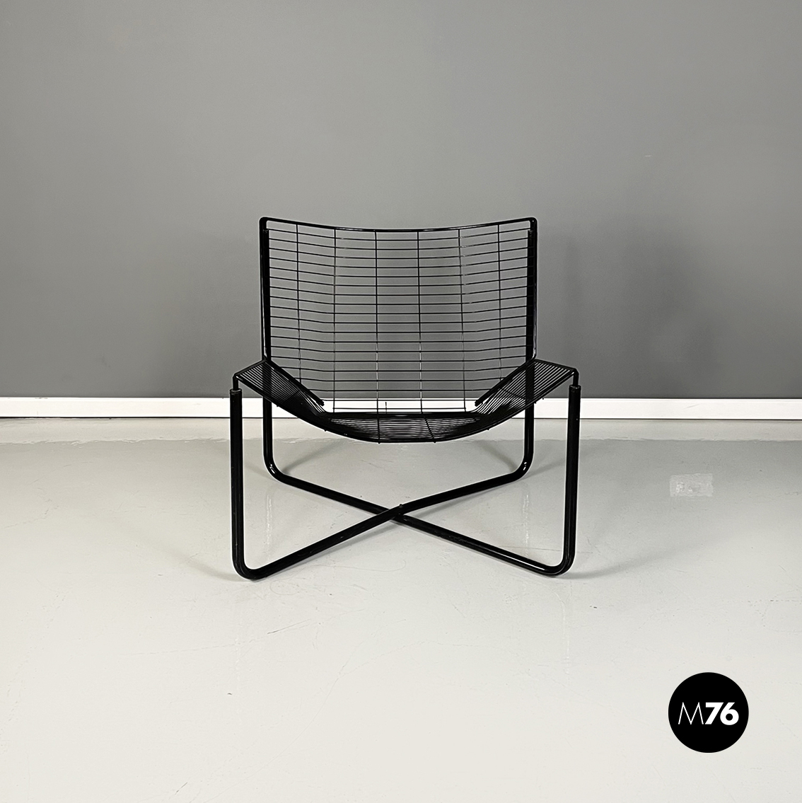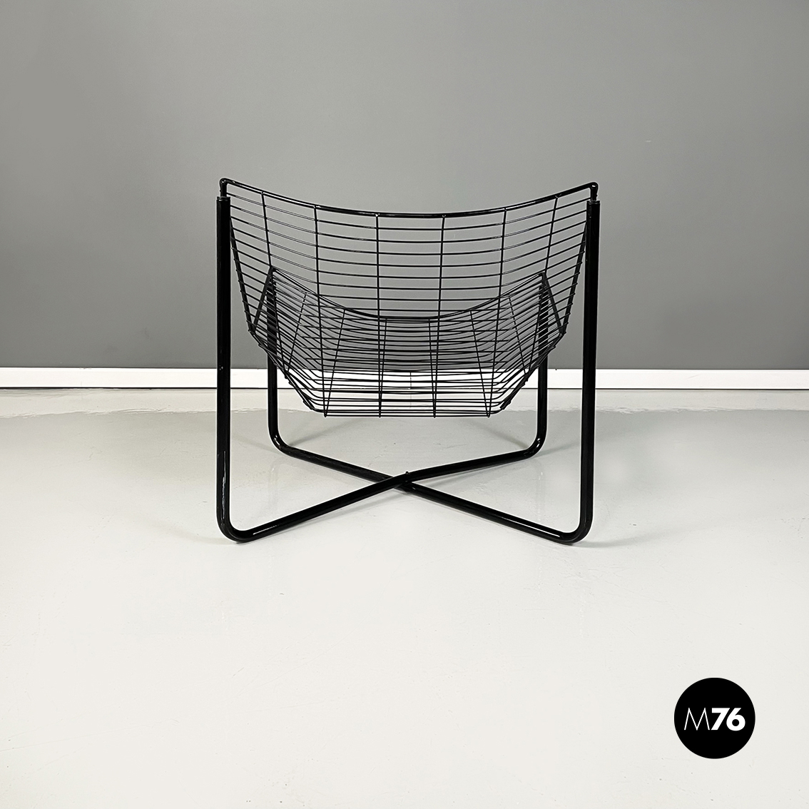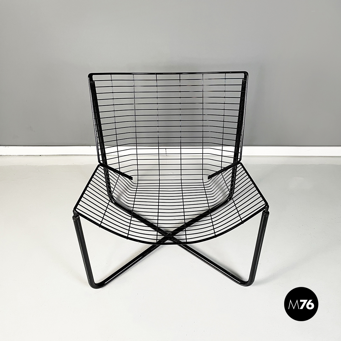 Poltrona in metallo verniciato nero. La struttura esterna è in tubolare nero mentre quella interna è composta da una serie di tondini sottili e curvati. Le quattro zampe a sezione tonda si incrociano sotto la seduta.