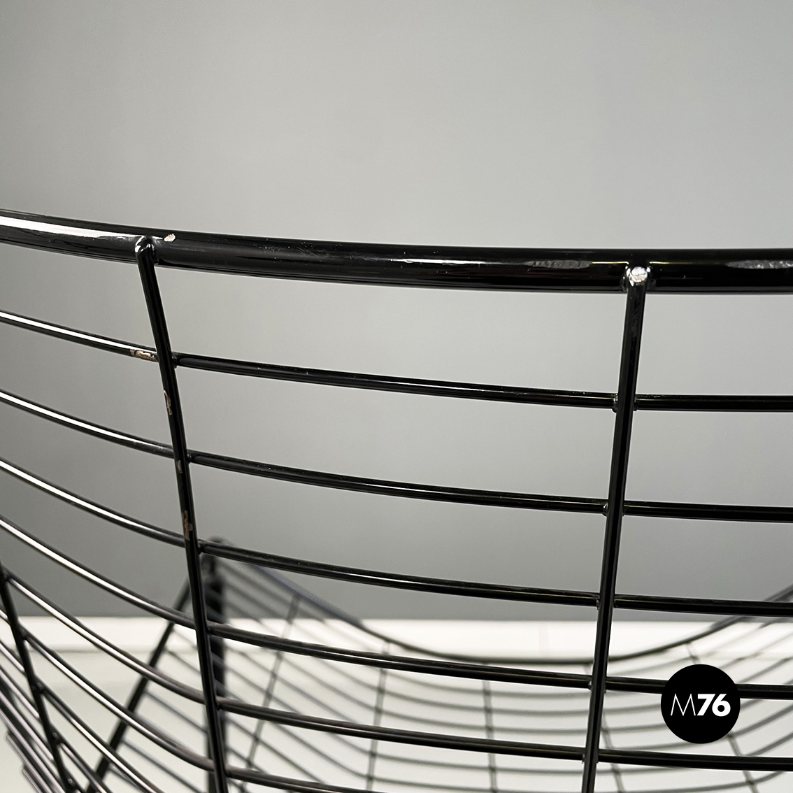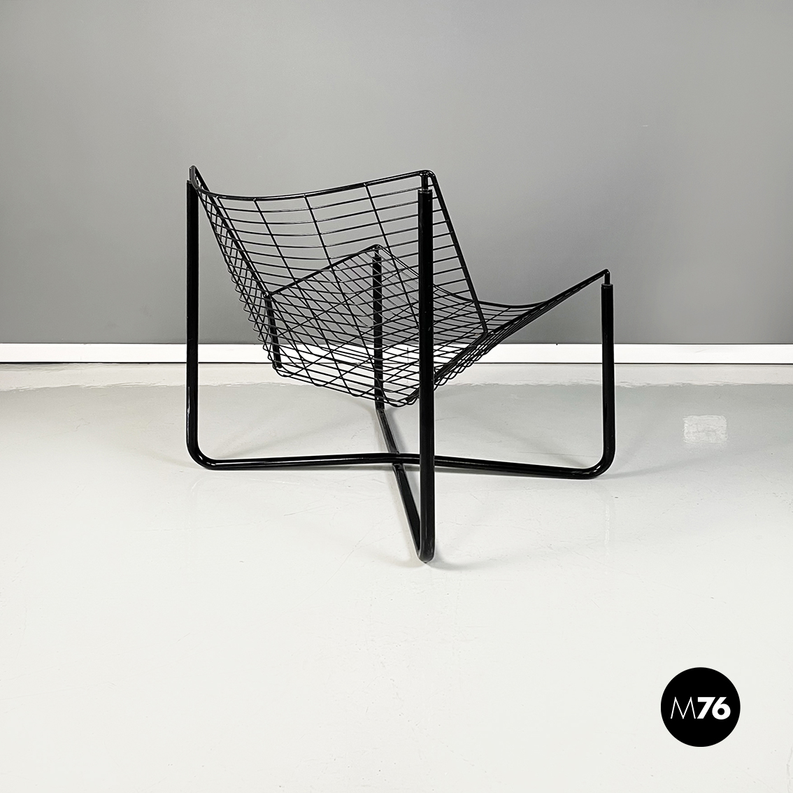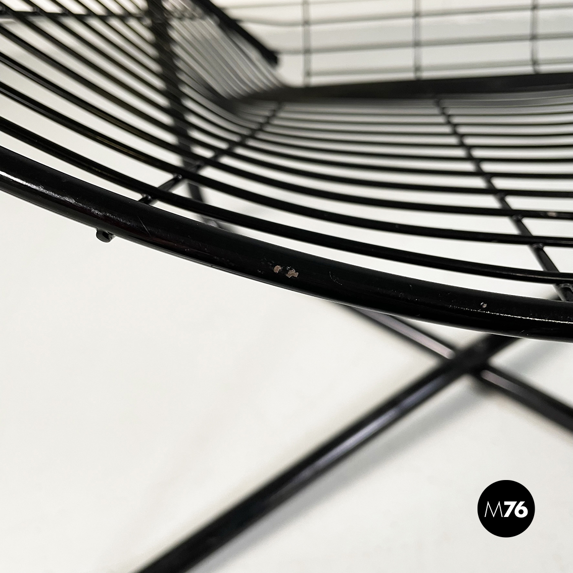 Poltrona in metallo verniciato nero. La struttura esterna è in tubolare nero mentre quella interna è composta da una serie di tondini sottili e curvati. Le quattro zampe a sezione tonda si incrociano sotto la seduta.
