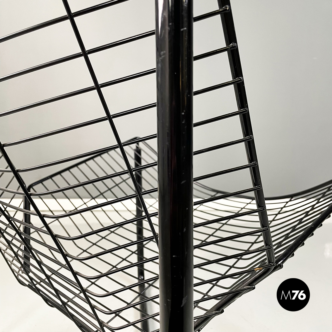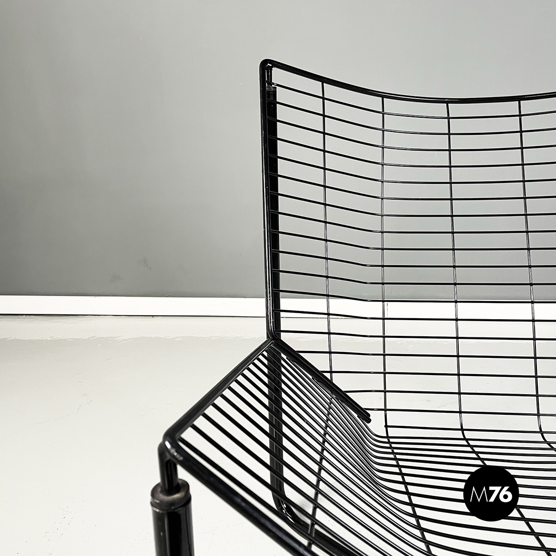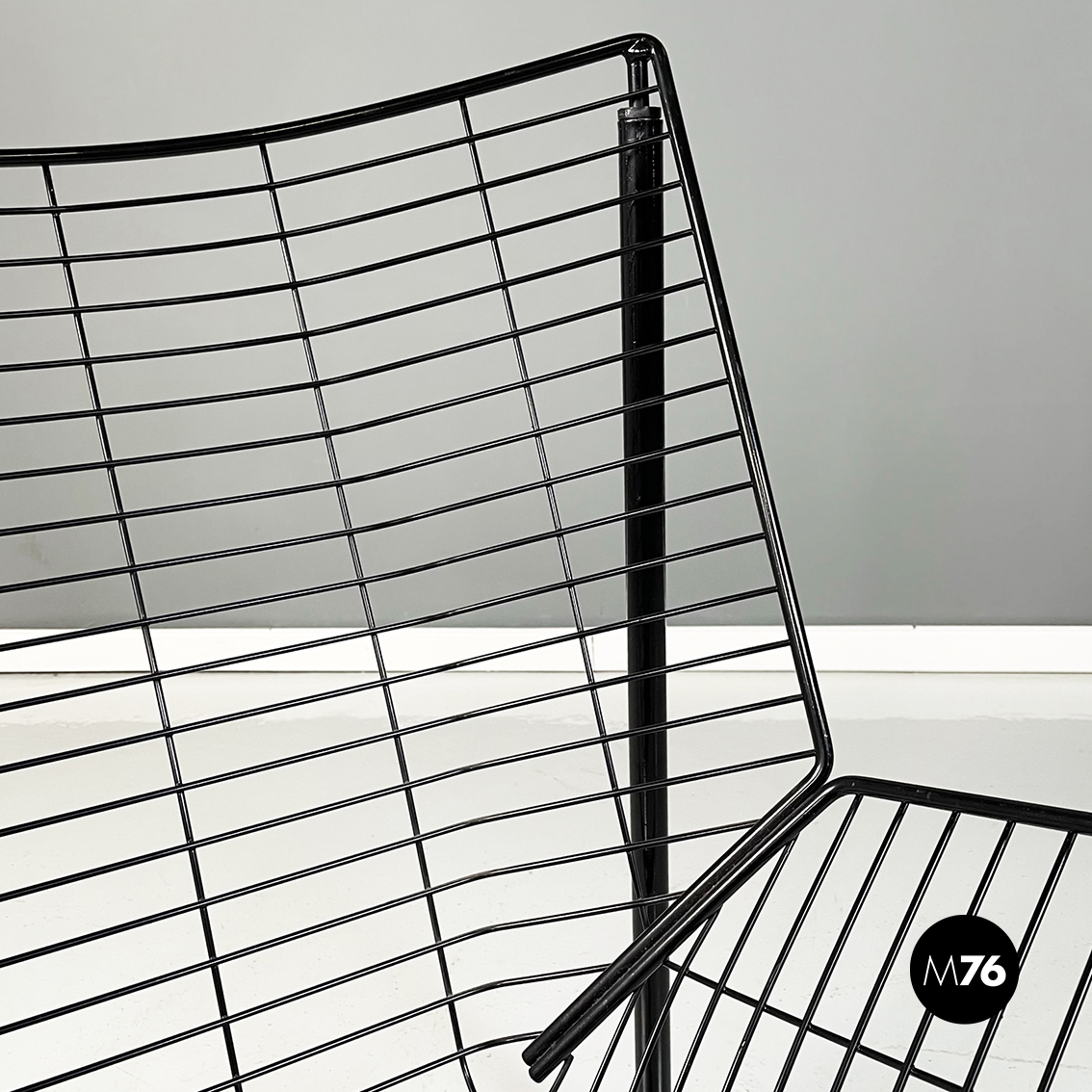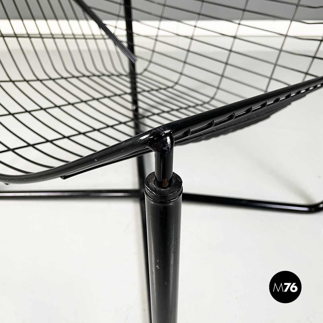 Poltrona in metallo verniciato nero. La struttura esterna è in tubolare nero mentre quella interna è composta da una serie di tondini sottili e curvati. Le quattro zampe a sezione tonda si incrociano sotto la seduta.