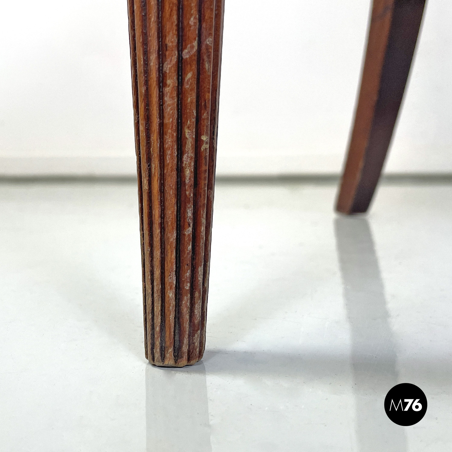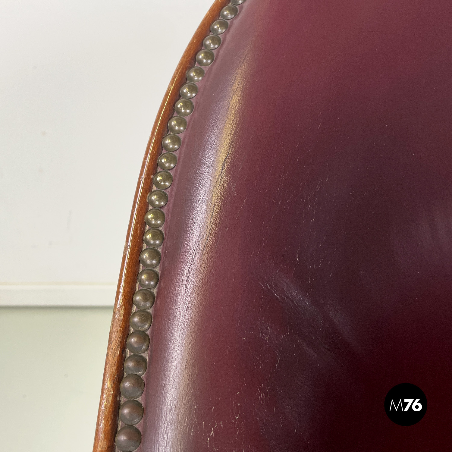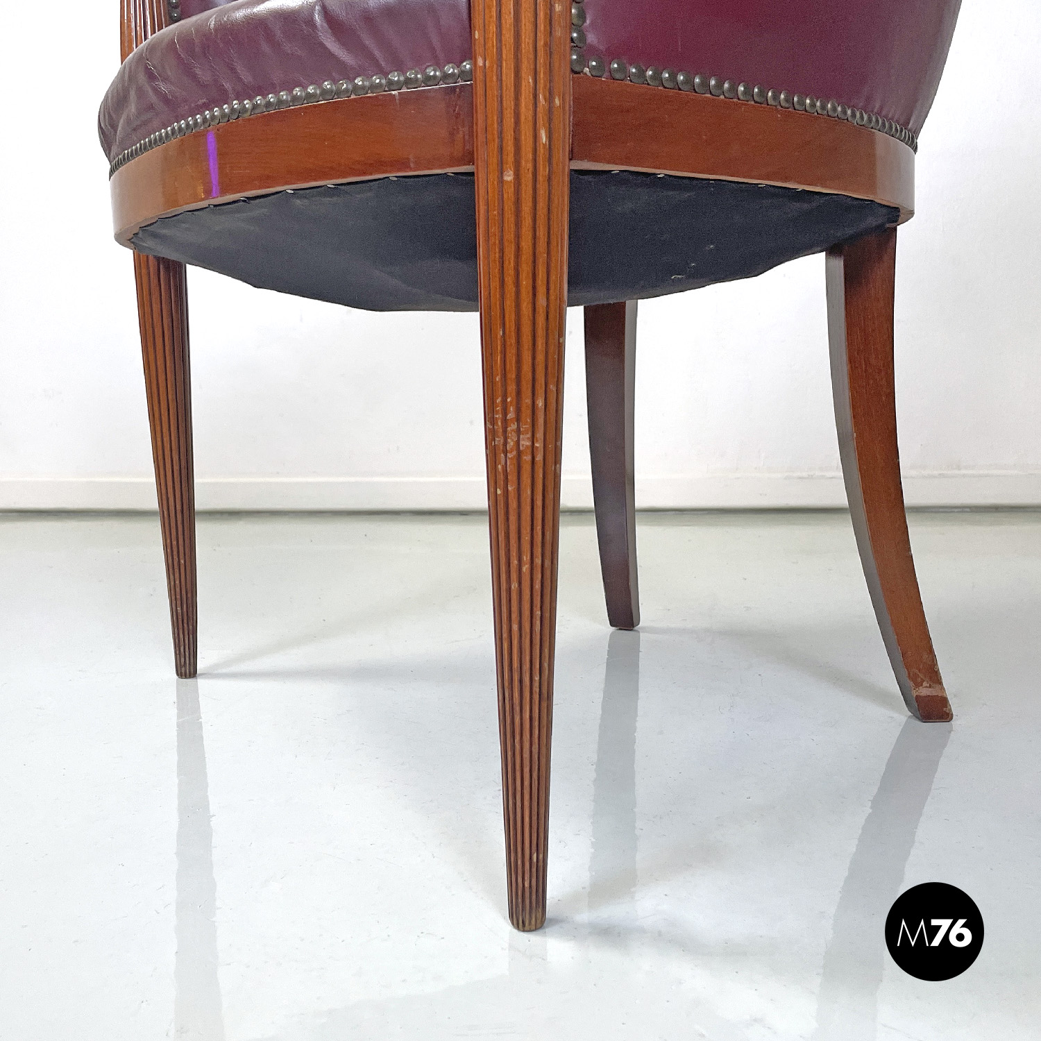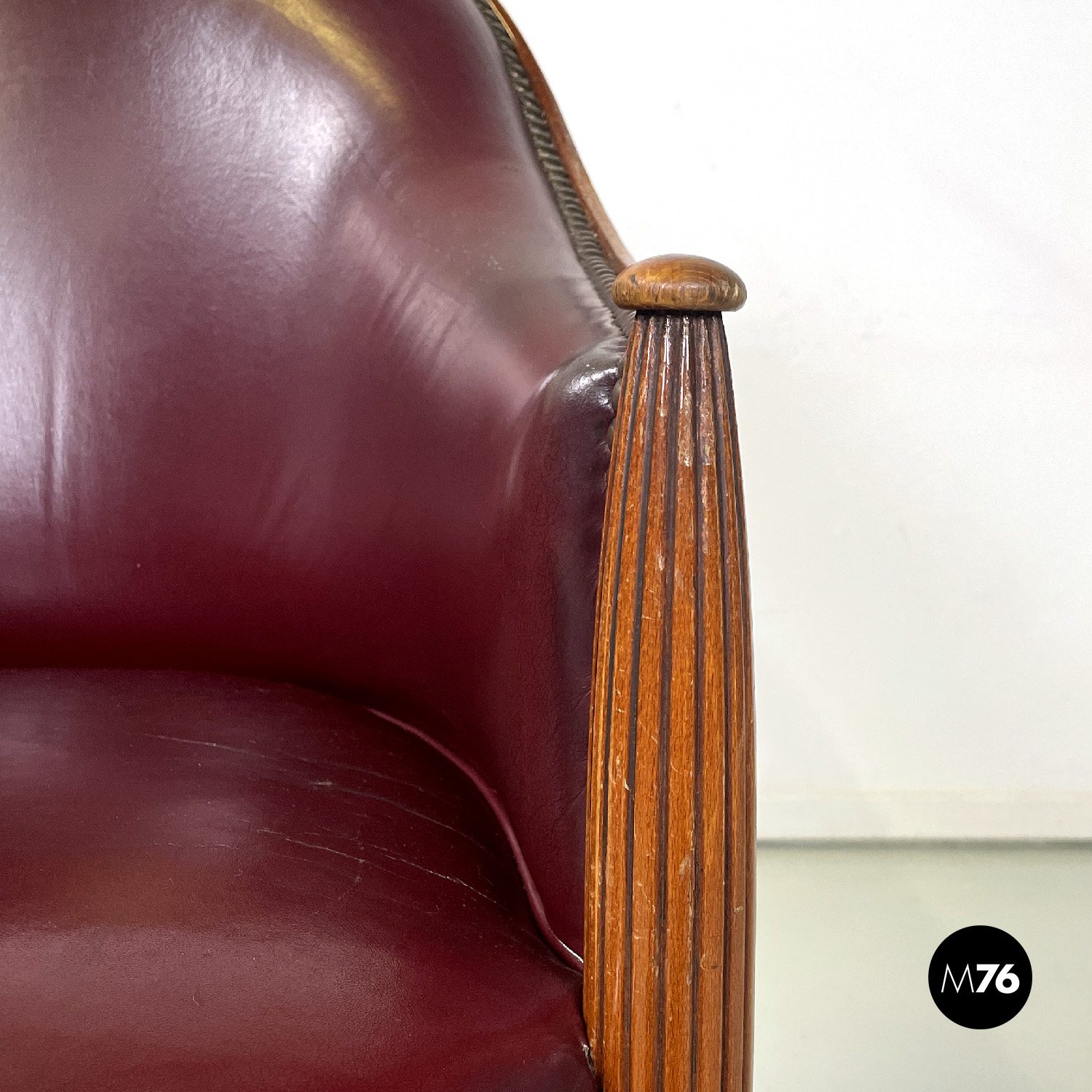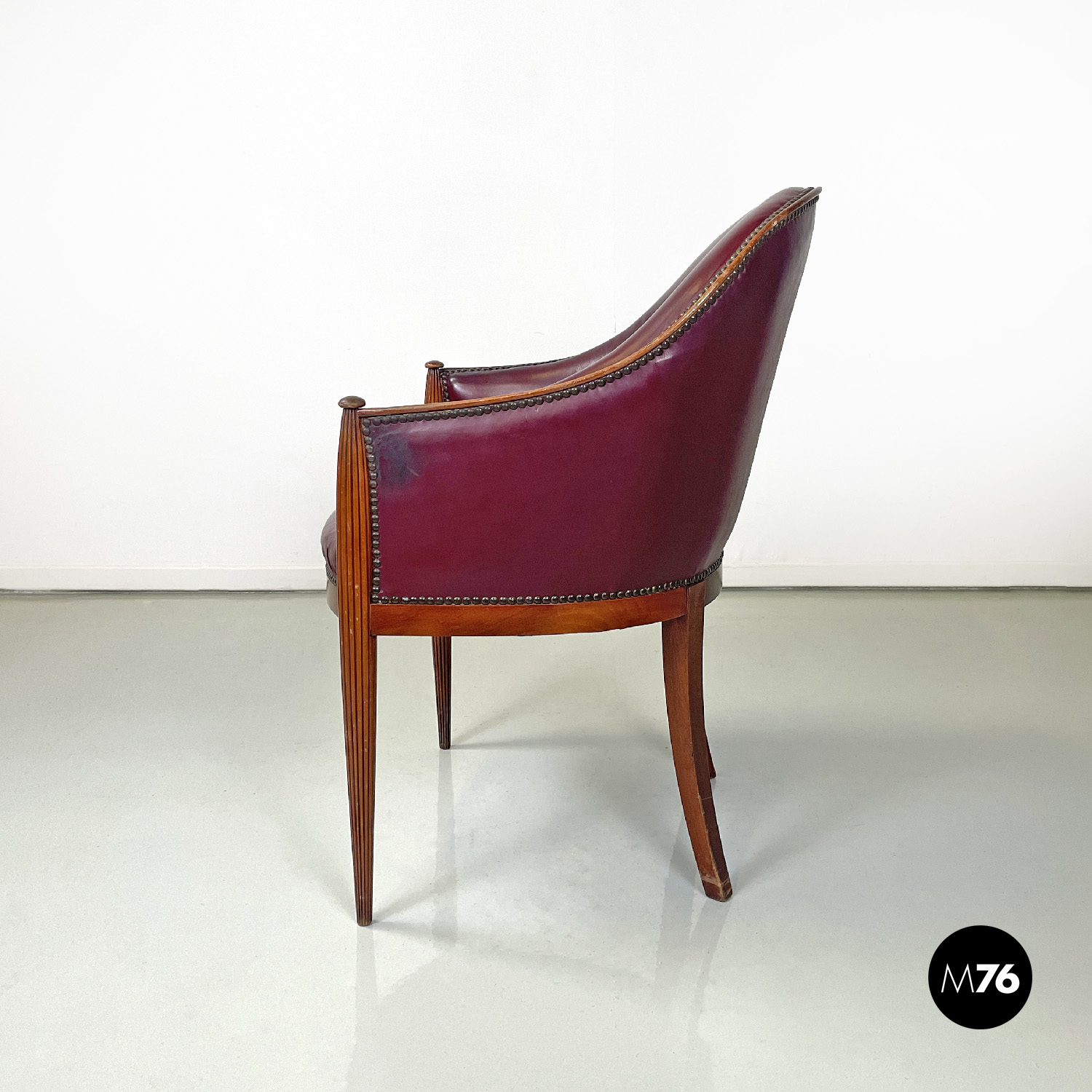 Poltrona a pozzetto in pelle color rosso vinaccia. La pelle si estende su tutta la superficie dello schienale e della seduta anche nella parte esterna. I profili della poltrona presentano delle borchie in bronzo. Le due gambe anteriori partono dal bracciolo per arrivare a terra e sono a sezione tonda decorate con linee verticali le due gambe posteriori sono lisce a sezione quadrata.