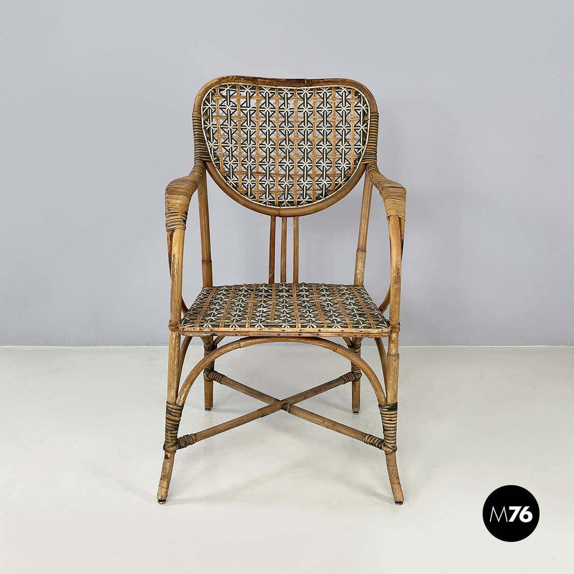 Poltrona da esterno interamente in rattan intrecciato. Lo schienale tondeggiante è in rattan con intrecci in vimini marrone bianco e verde con pattern a stelle. I braccioli curvati presentano un intreccio in vimini. La seduta presenta lo stesso pattern e colori. Le zampe curvate in rattan sono rifinite con parti in vimini verde e marrone. Questa sedia con braccioli è perfetta per il giardino.