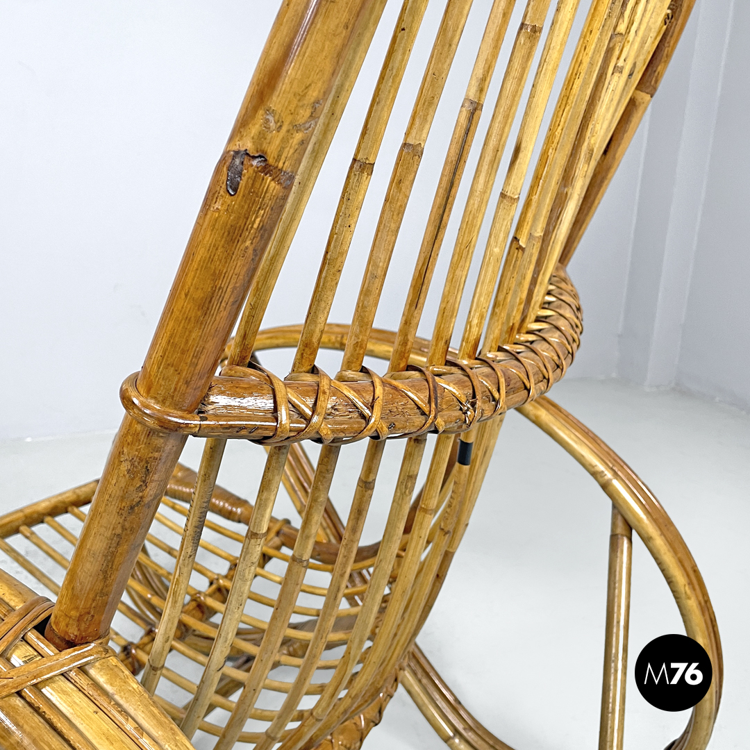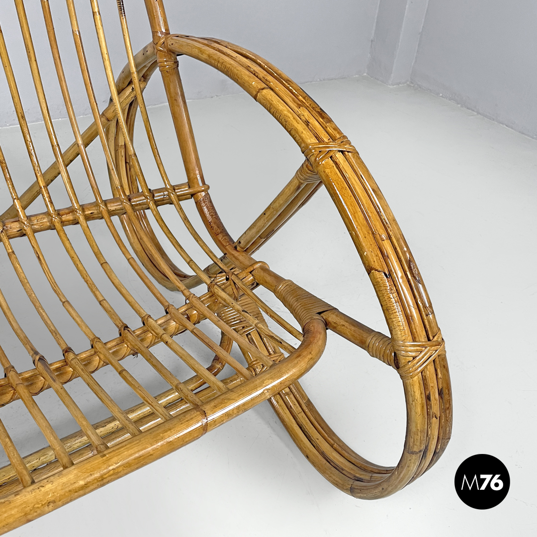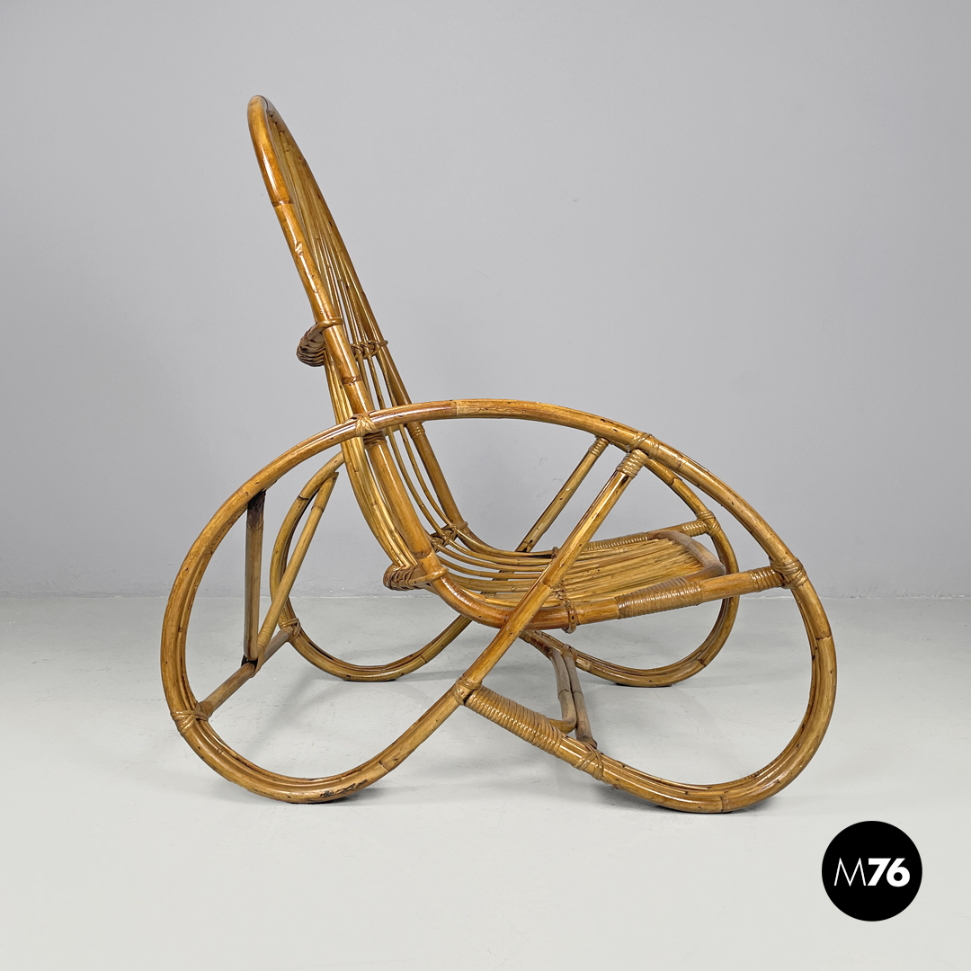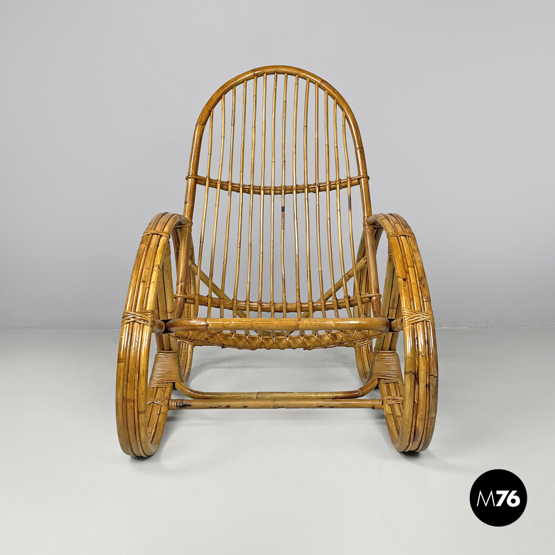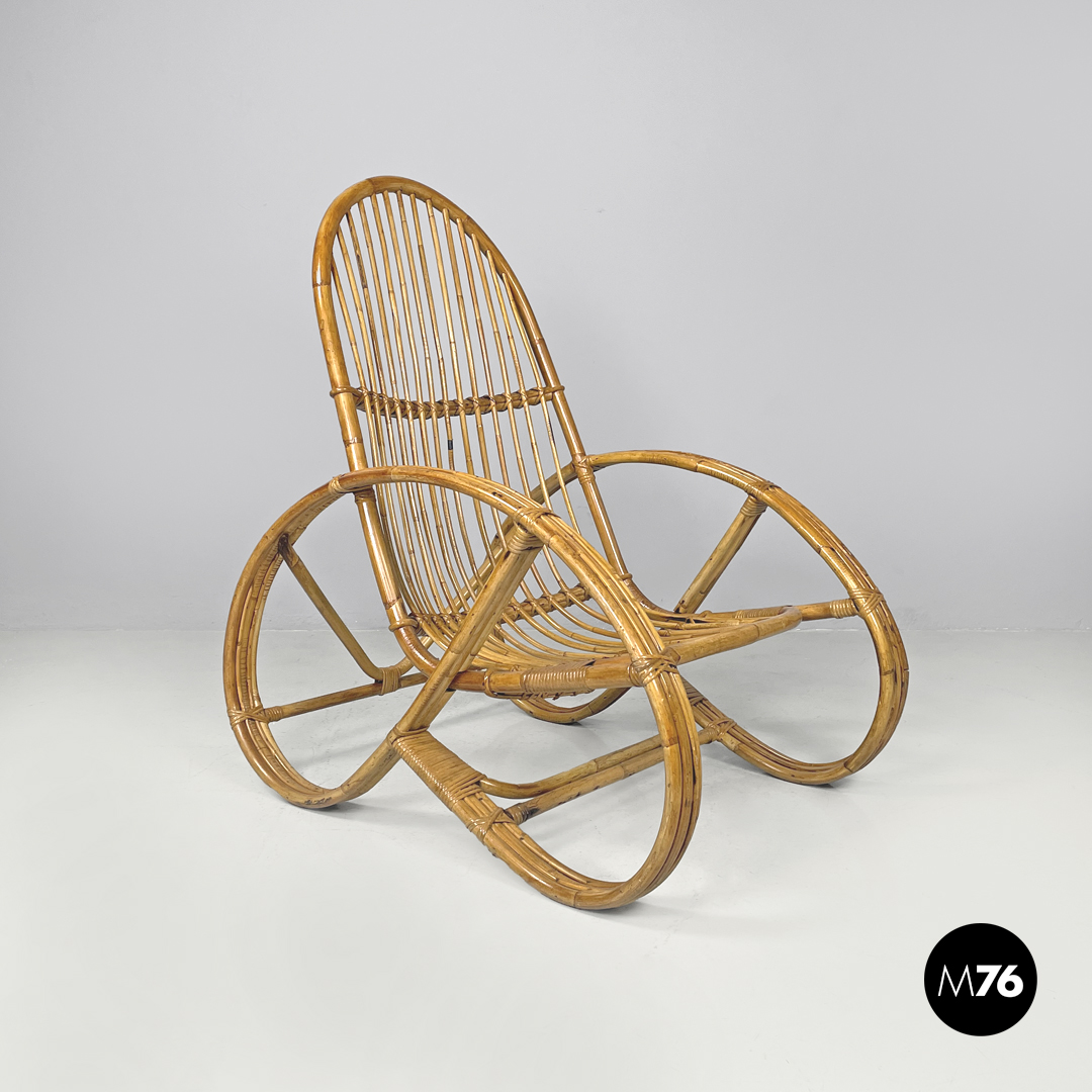 Armchair with armrests entirely in rattan. The seat and backrest are composed of a single shell with vertical components. The two armrests follow curved and rounded lines and also make up the four legs. Can also be used in an outdoor environment such as a garden or terrace.