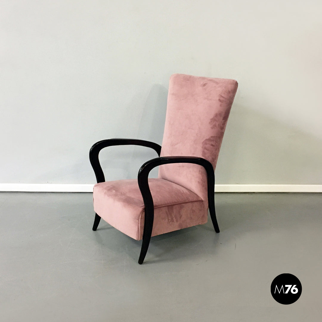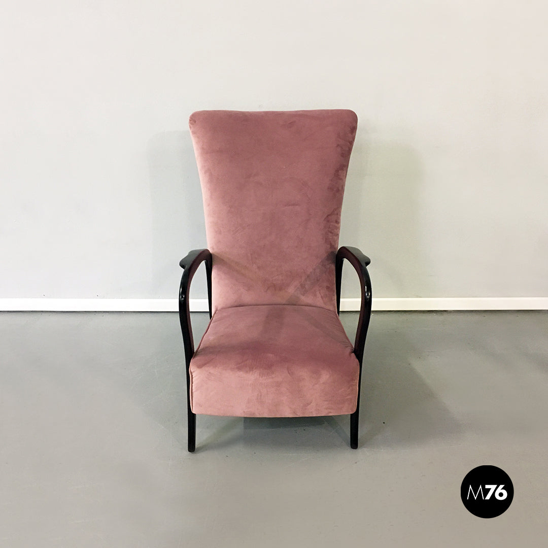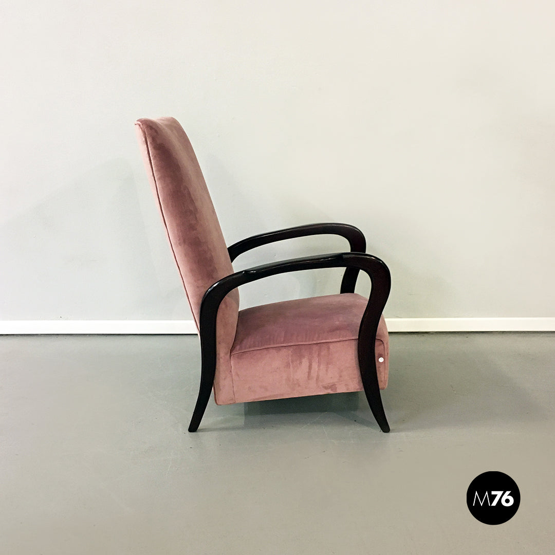 Poltrona in velluto rosa e legno, 1950 ca.
