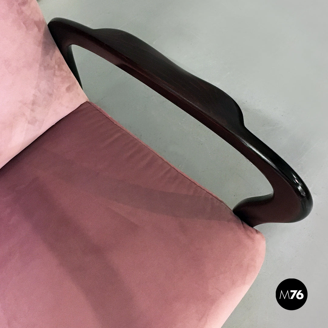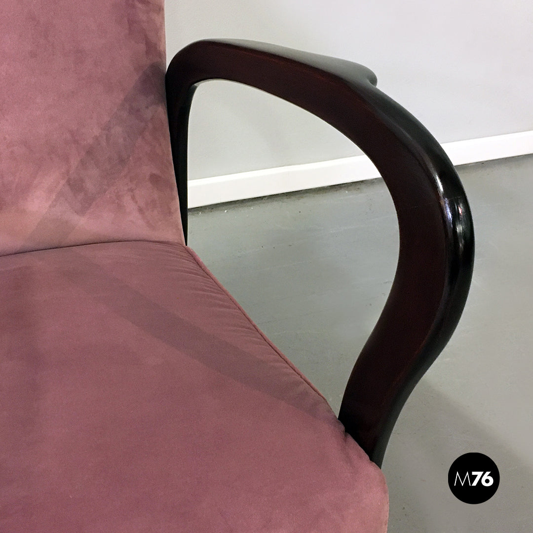 Poltrona con struttura in legno massello seduta e schienale imbottiti e tappezzati a nuovo in velluto rosa e con braccioli curvati in tinta scura.