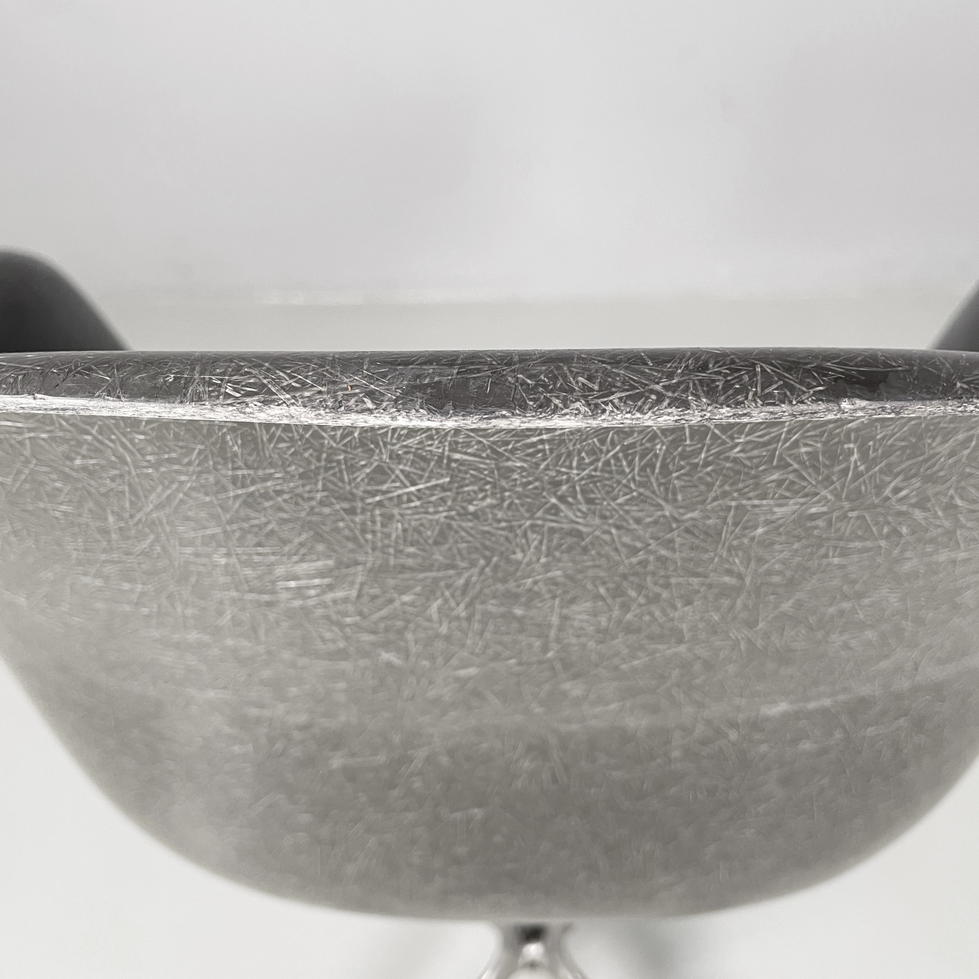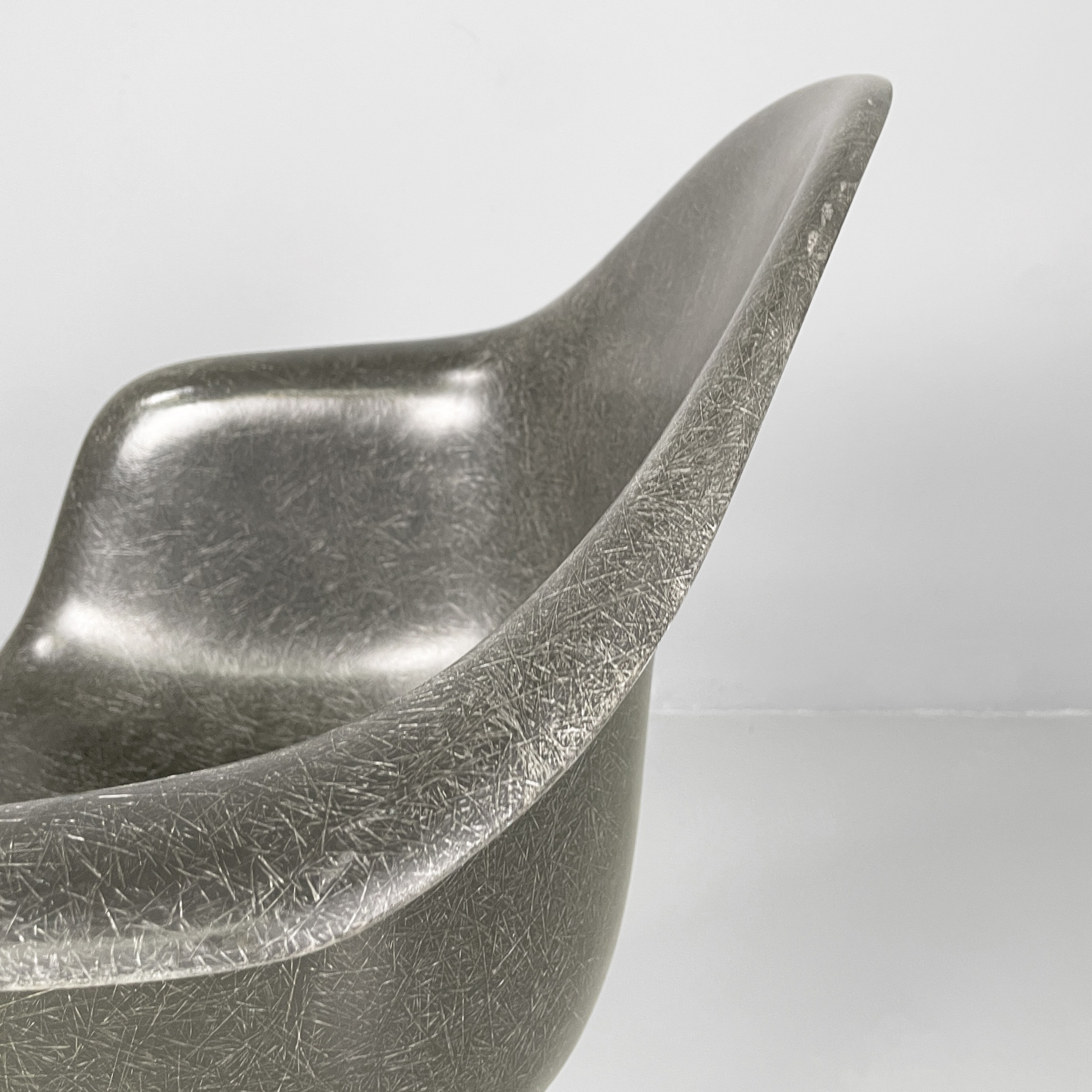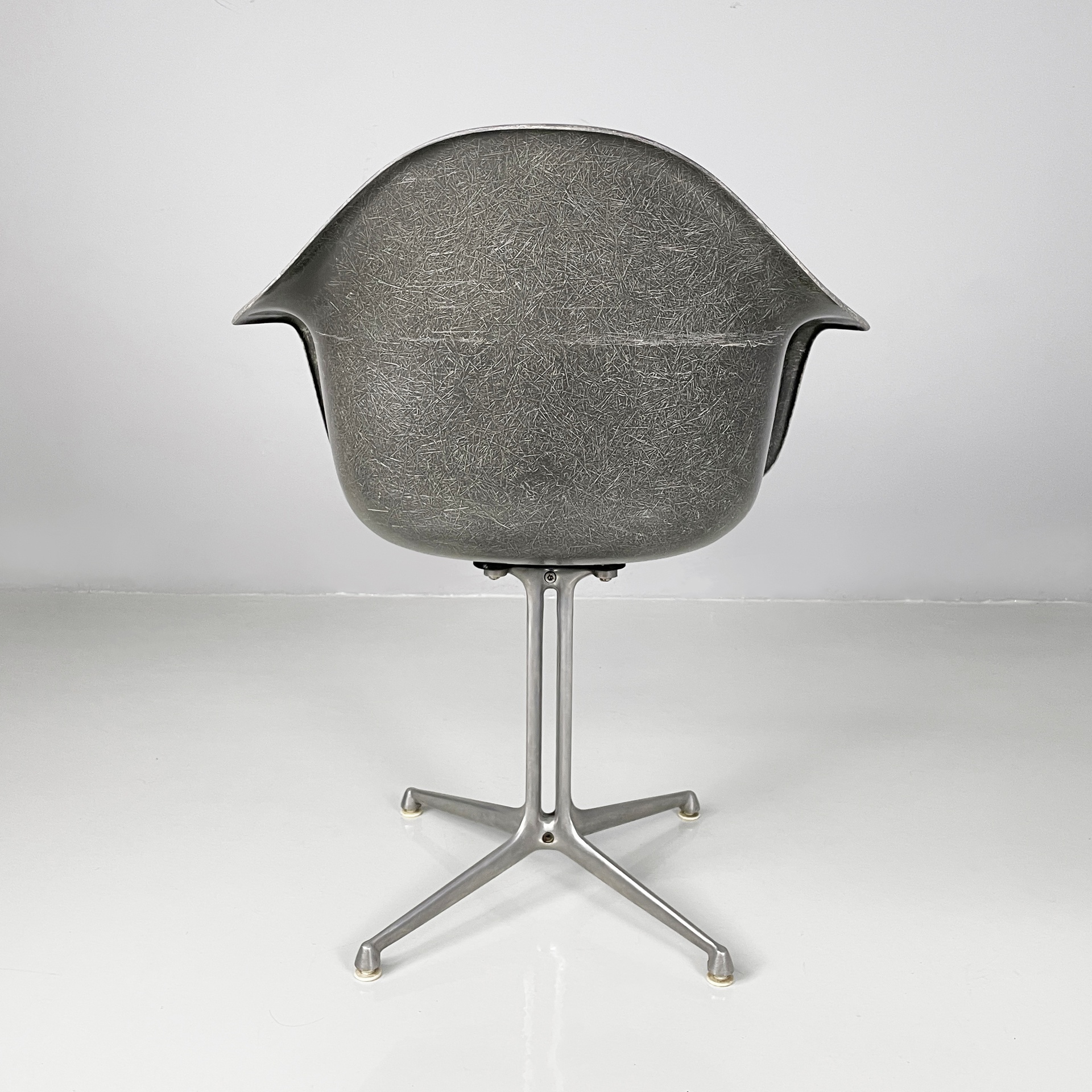 Poltrona modello La Fonda con seduta e schienale monoscocca curvata in vetroresina griga. Braccioli presenti. La base in alluminio è formata da quattro razze con piedini tondi. Può essere usata come sedia da ufficio.