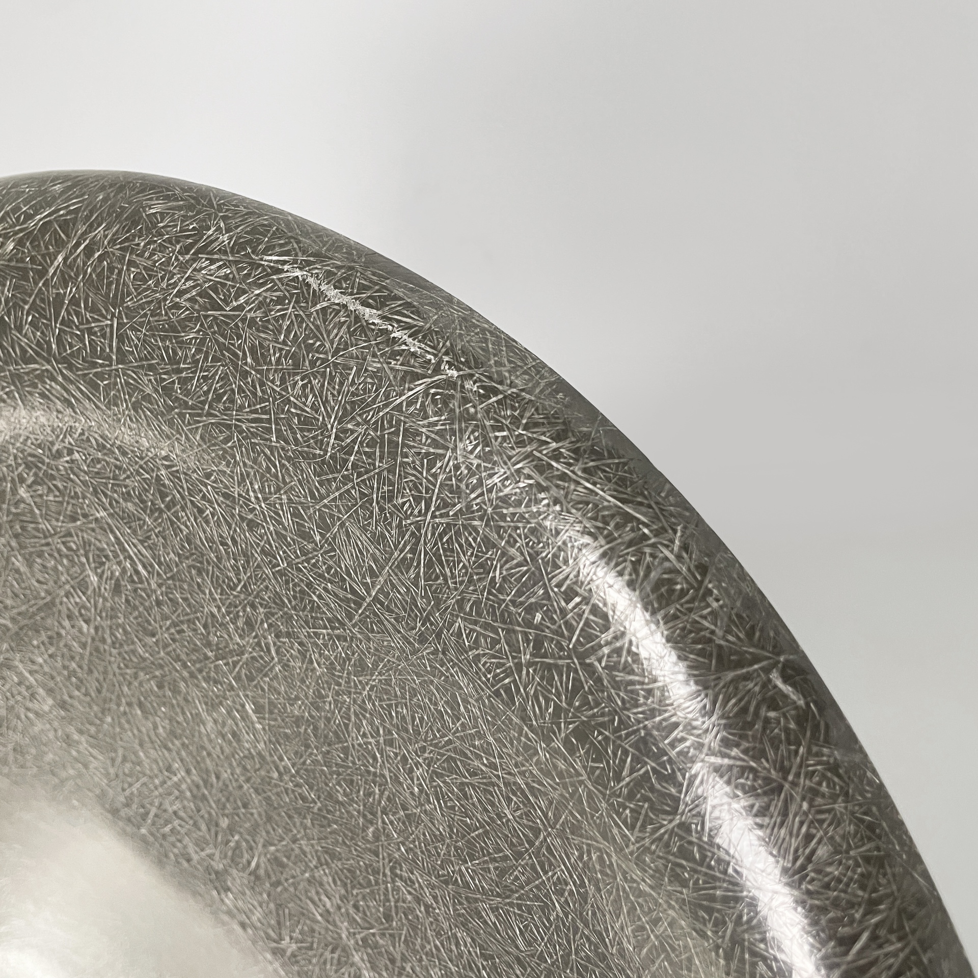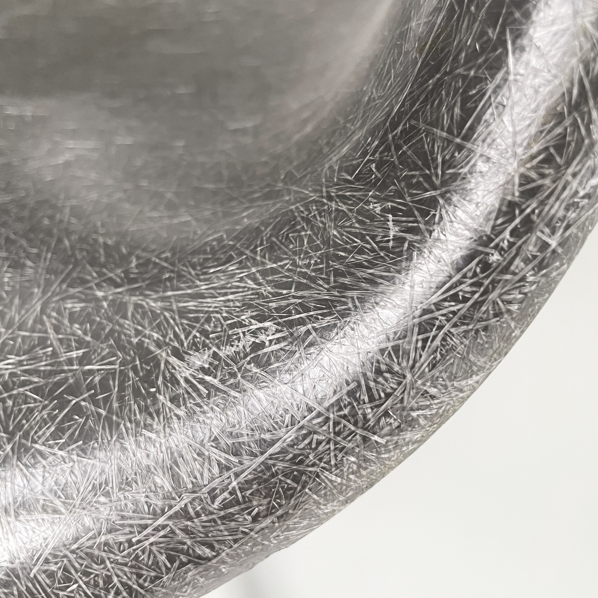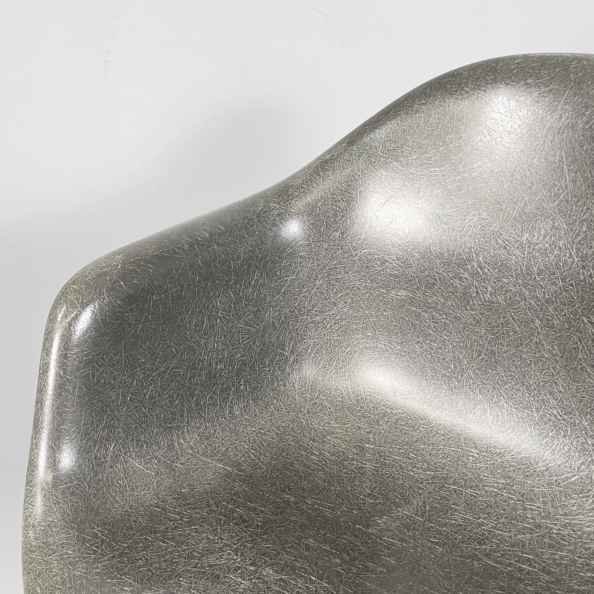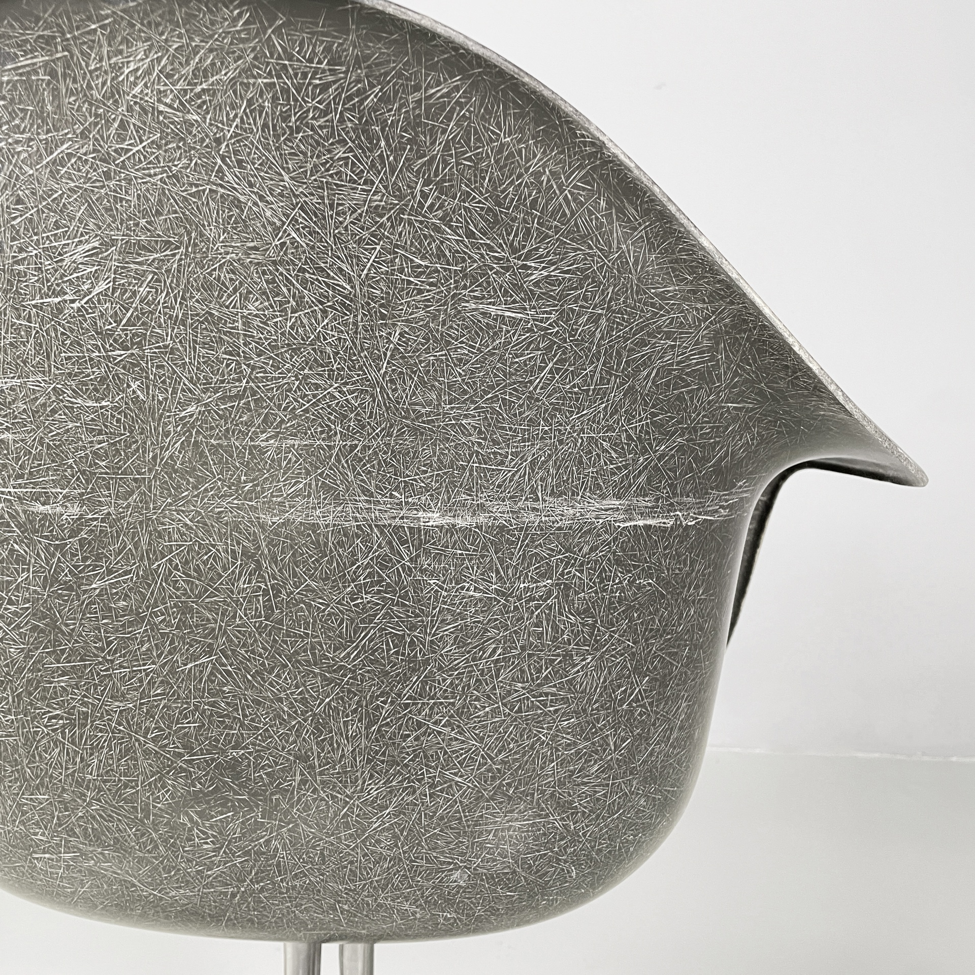 Poltrona modello La Fonda con seduta e schienale monoscocca curvata in vetroresina griga. Braccioli presenti. La base in alluminio è formata da quattro razze con piedini tondi. Può essere usata come sedia da ufficio.