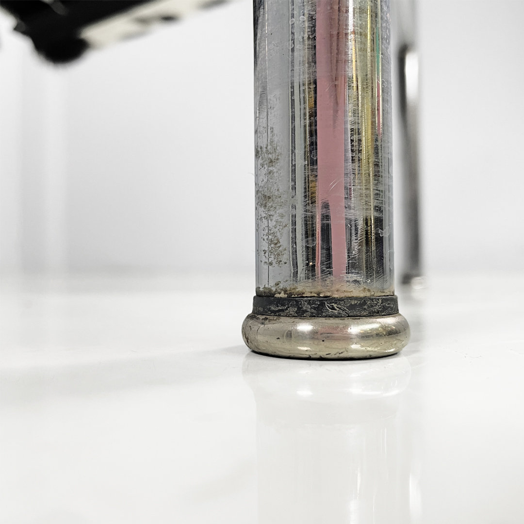 Buone condizioni, la pelle della seduta e dello schienale presentano segni dell’uso, del tempo e macchie. Il metallo presenta ossidazioni. Il cuoio dei braccioli è nuovo.