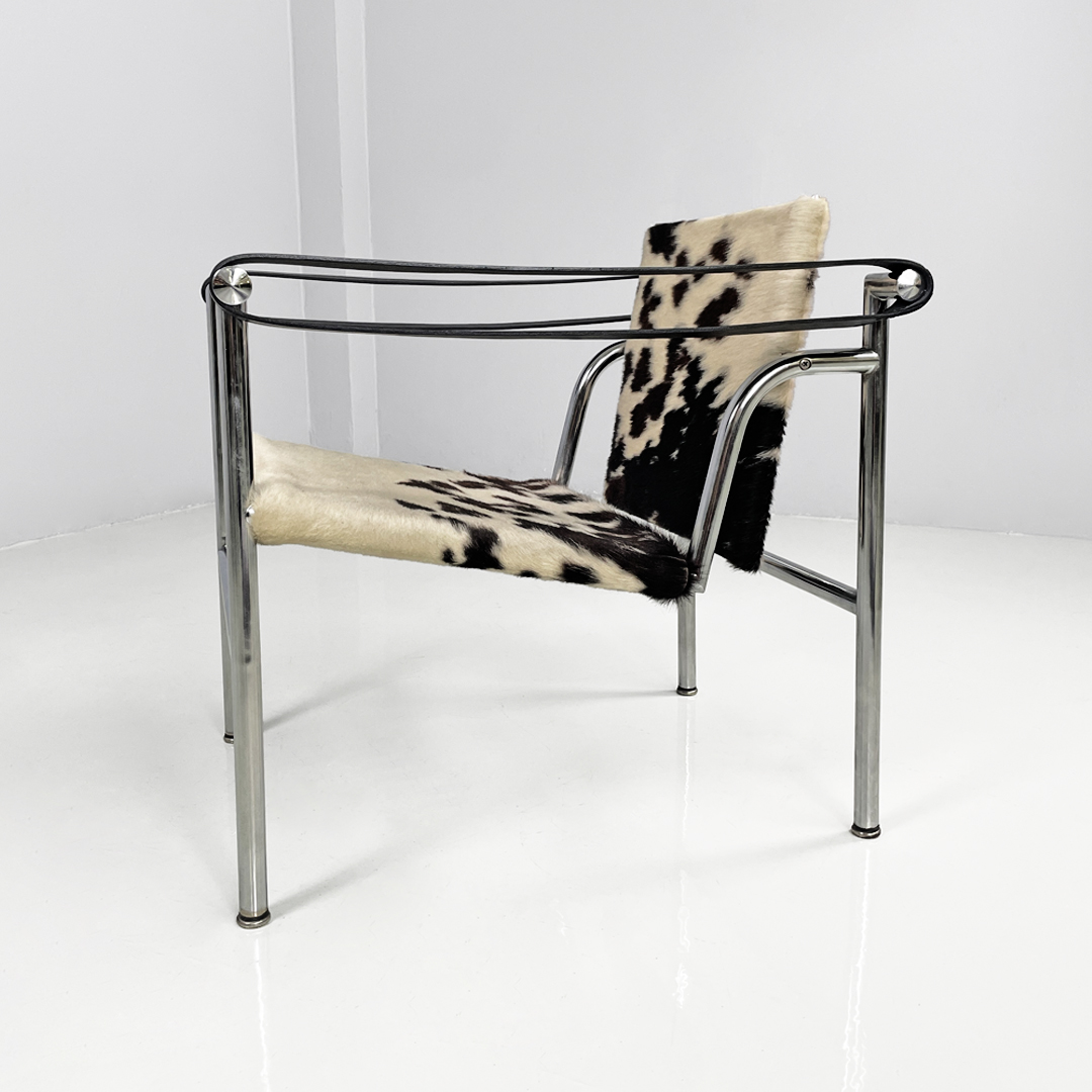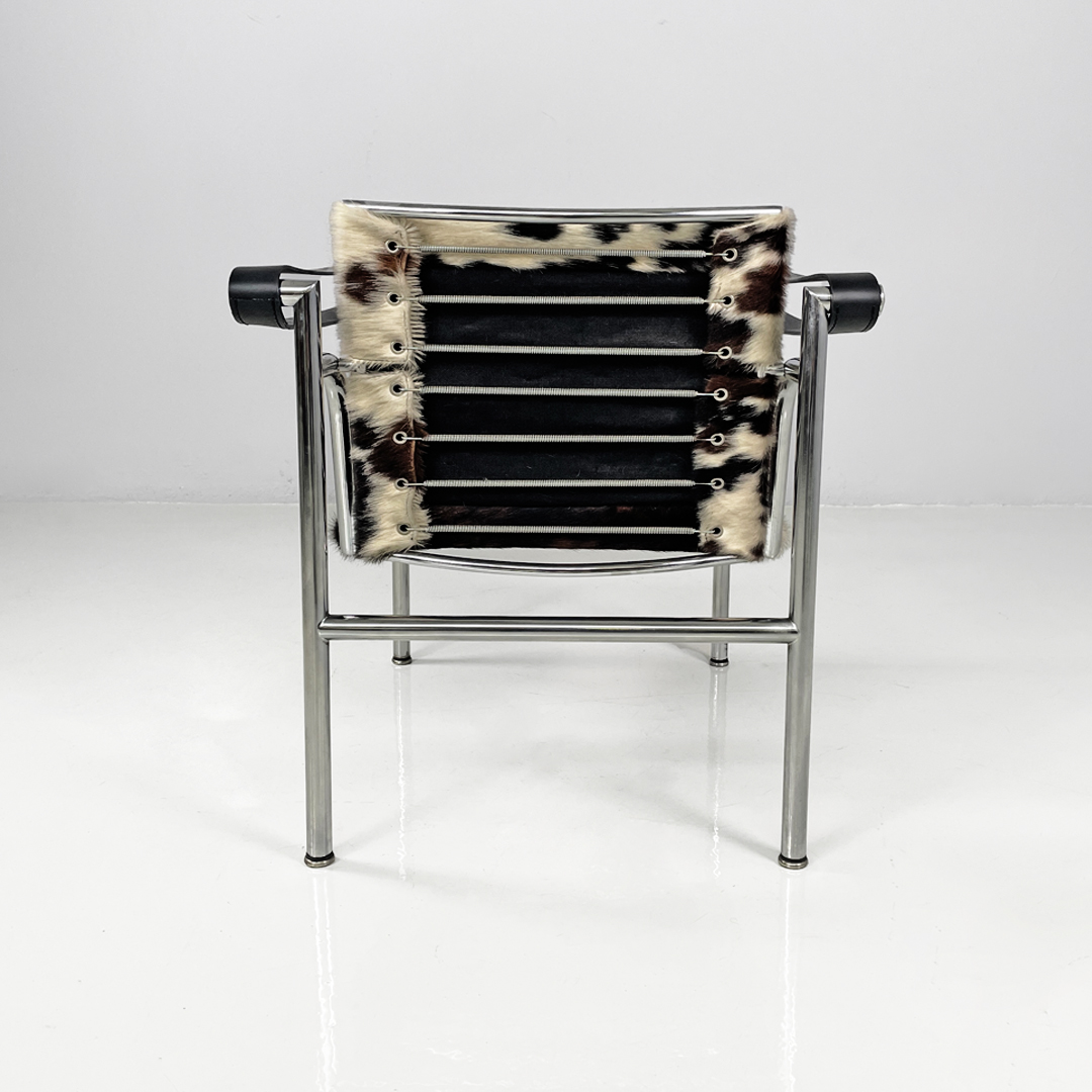 Poltrona modello LC1 o Fauteuil à dossier basculant con schienale basculante. Lo schienale e la seduta sono in pelle di cavallino sui toni del bianco e del marrone, mentre i braccioli sono composti da una fascia di pelle nera. Struttura in metallo.