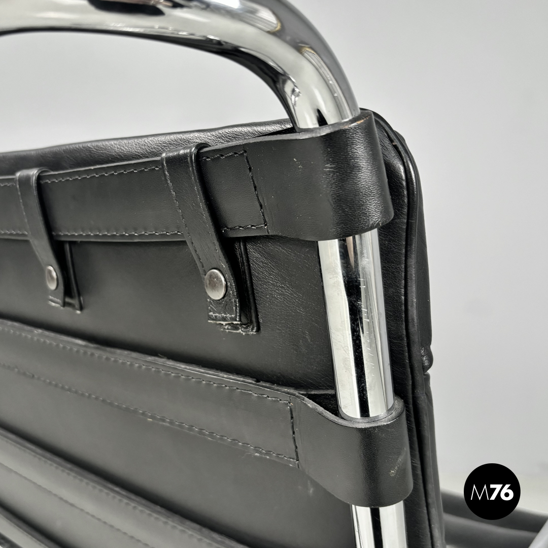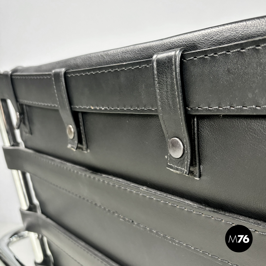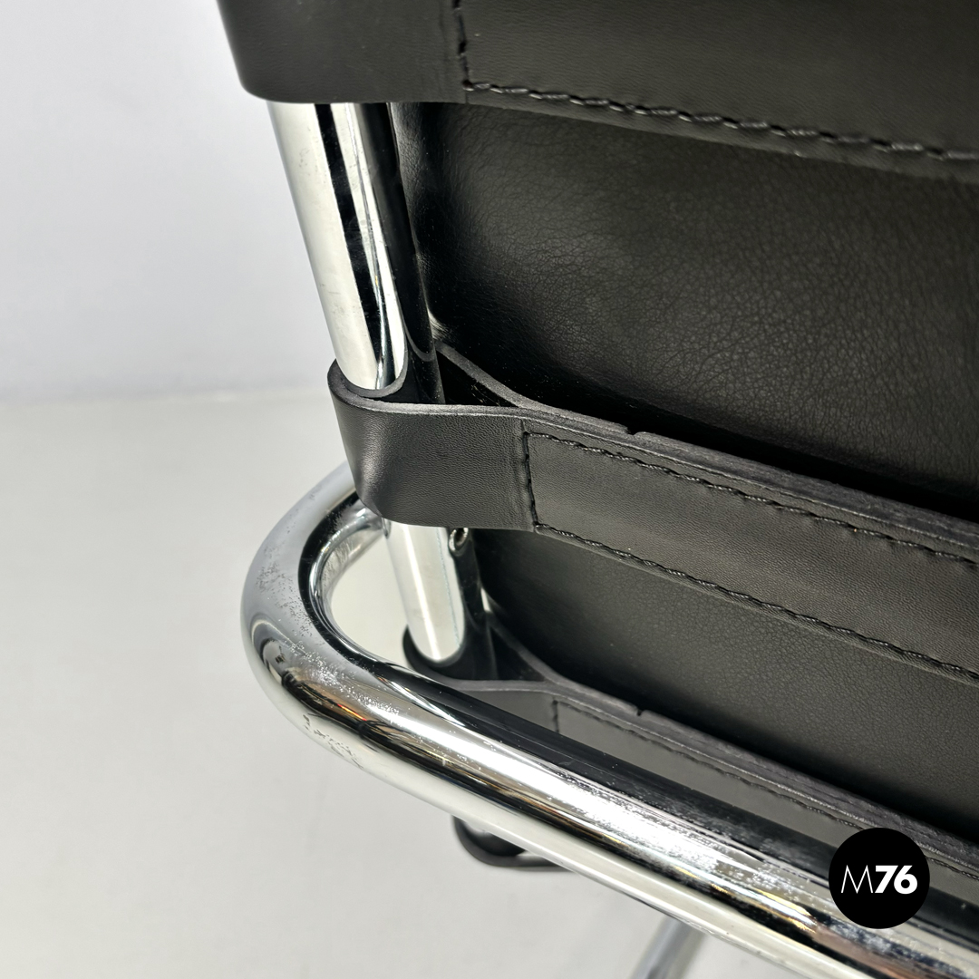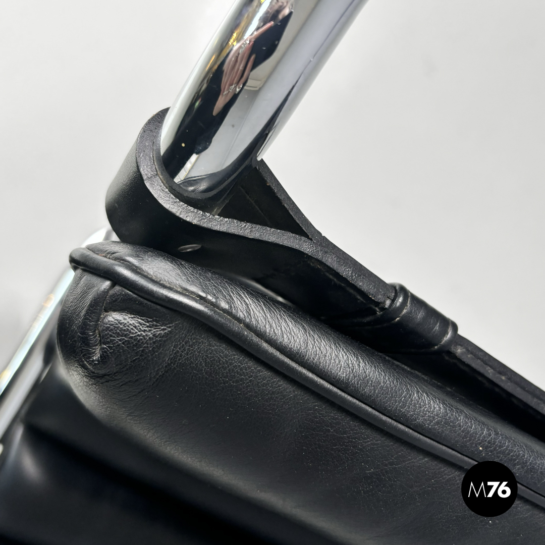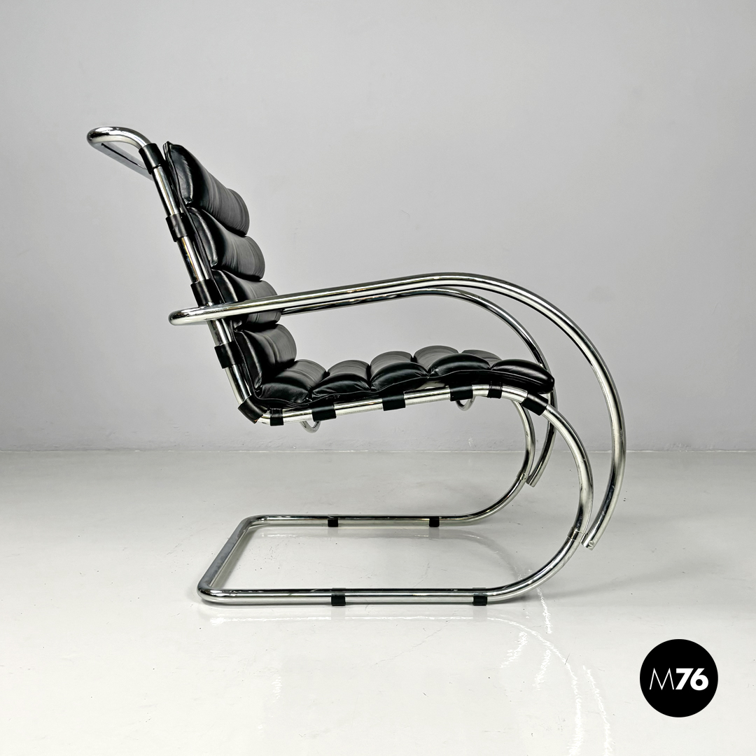 Poltrona modello MR40 in pelle nera. La seduta e lo schienale sono composti da un’unico cuscino con cuciture orizzontali. La struttura è in tubolare di metallo cromato e segue linee curve e tondeggianti formando una maniglia dietro lo schienale i due braccioli e le gambe.
