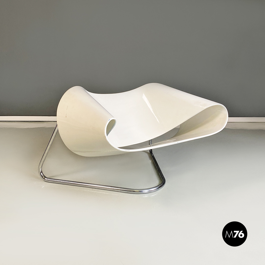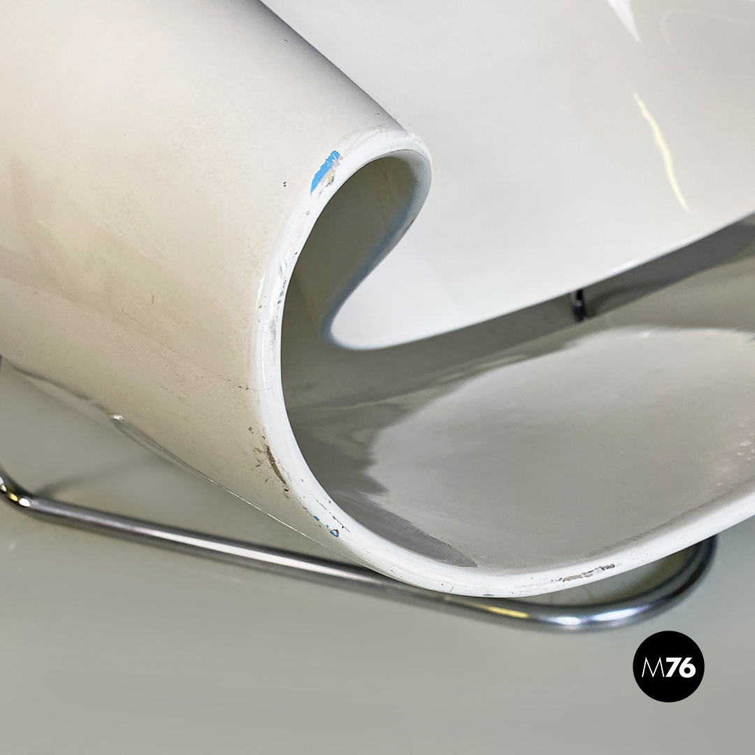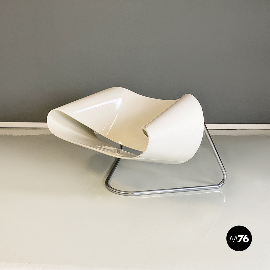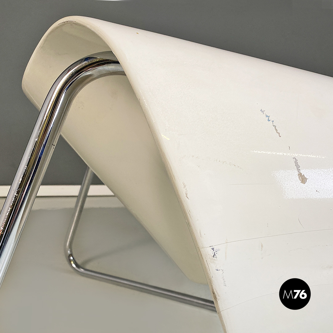 Poltrona modello Nastro CL9 bianca composta da un unico nastro in fibra di vetro che funge da seduta e si blocca liberamente su una struttura in tubolare di acciaio tramite un attacco per supporti antiurto.