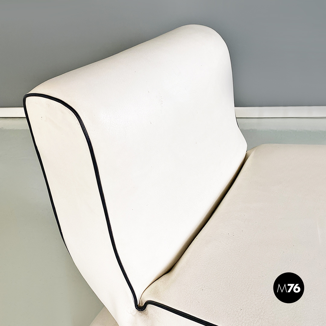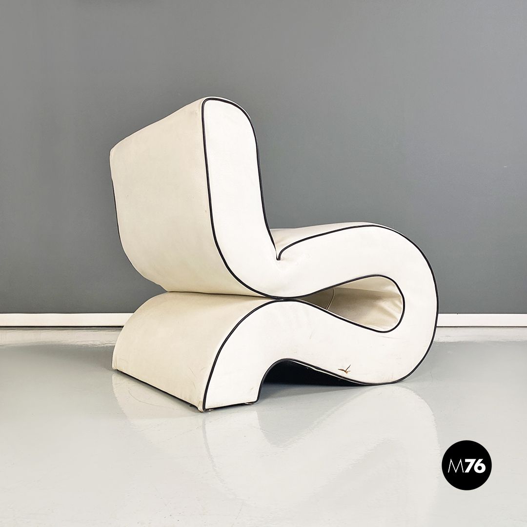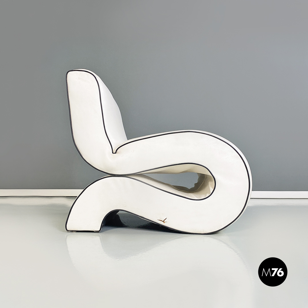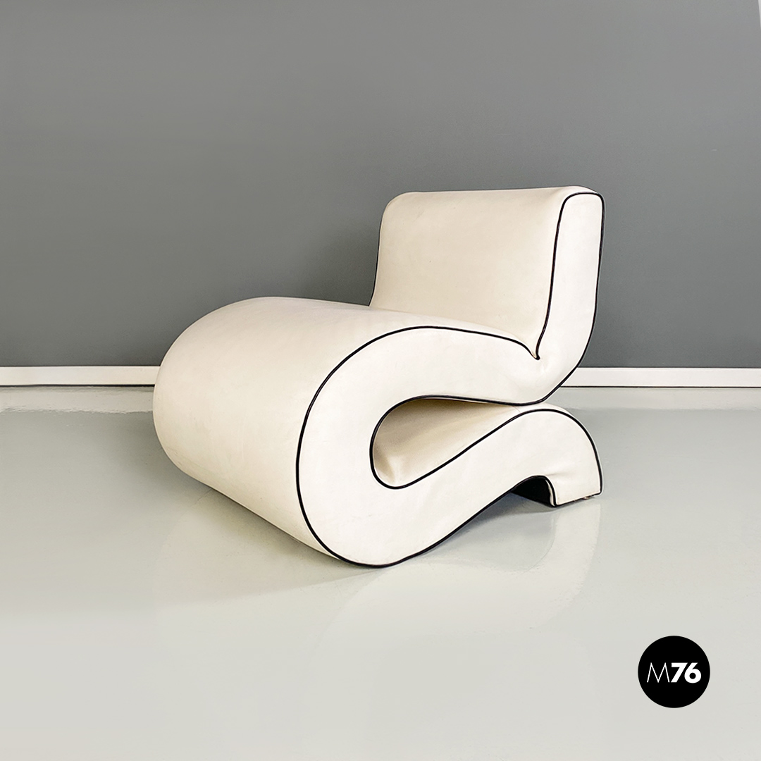 Poltrona modello Noodle con monoscocca curvilinea in poliuretano espanso rivestita in pelle bianca e con cordino nero su tutti i profili.