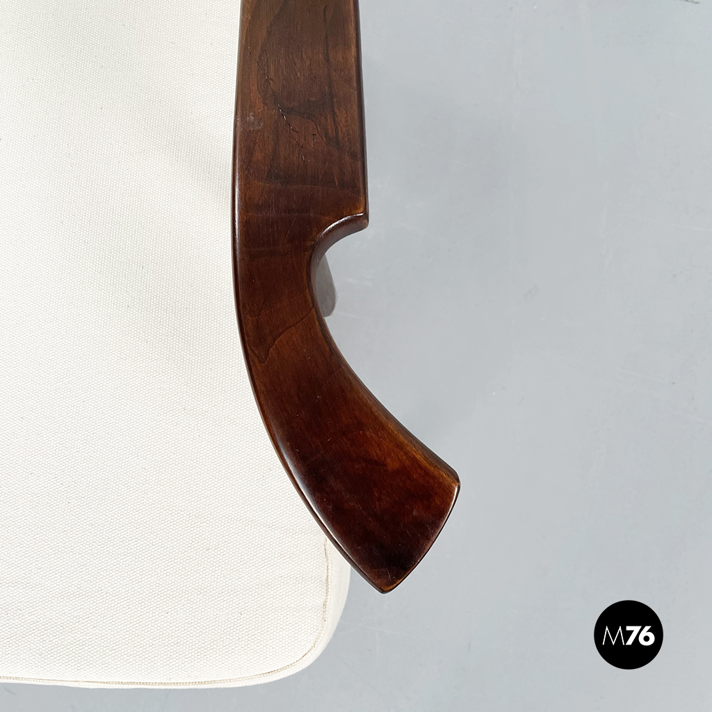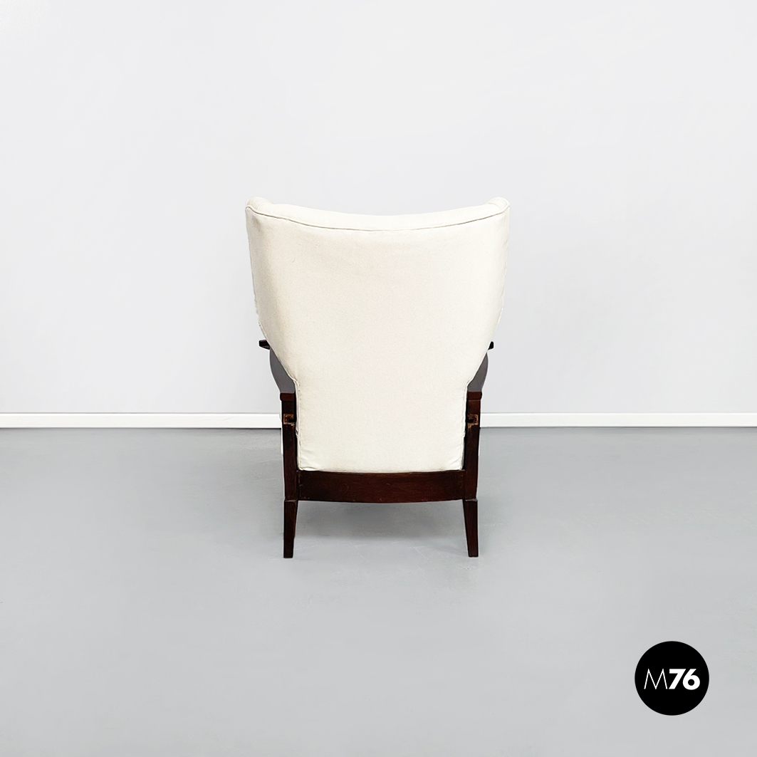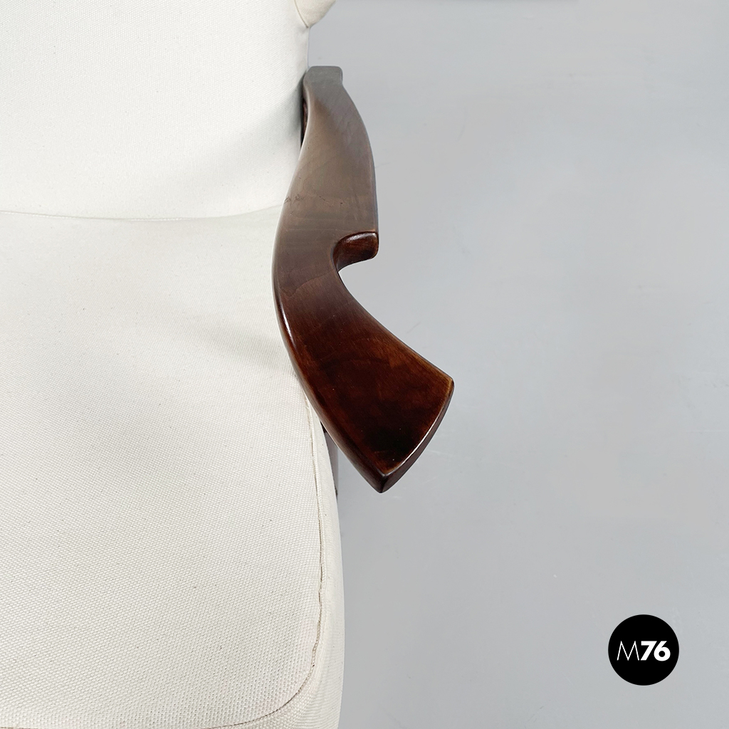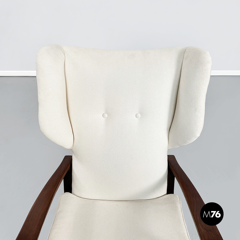 Poltrona con struttura in legno con seduta composta da un cuscino imbottito in tessuto bianco sostenuto da una struttura metallica collegata alla struttura principale. I braccioli sono di forma irregolare ricurva in legno e lo schienale imbottito e rivestito in tessuto bianco presenta due alette laterali all’altezza della testa. La particolarità di questa poltrona sta nello schienale infatti questo può essere altazato e riposizionato con angolature diverse.