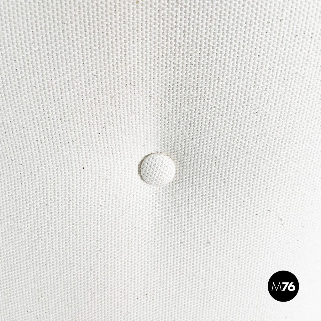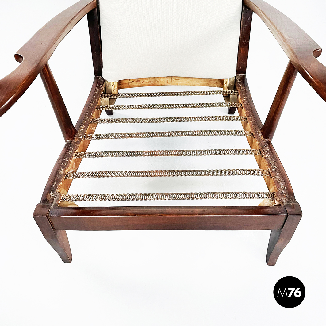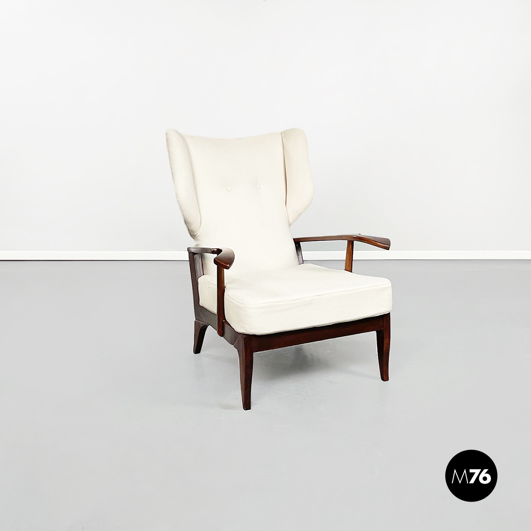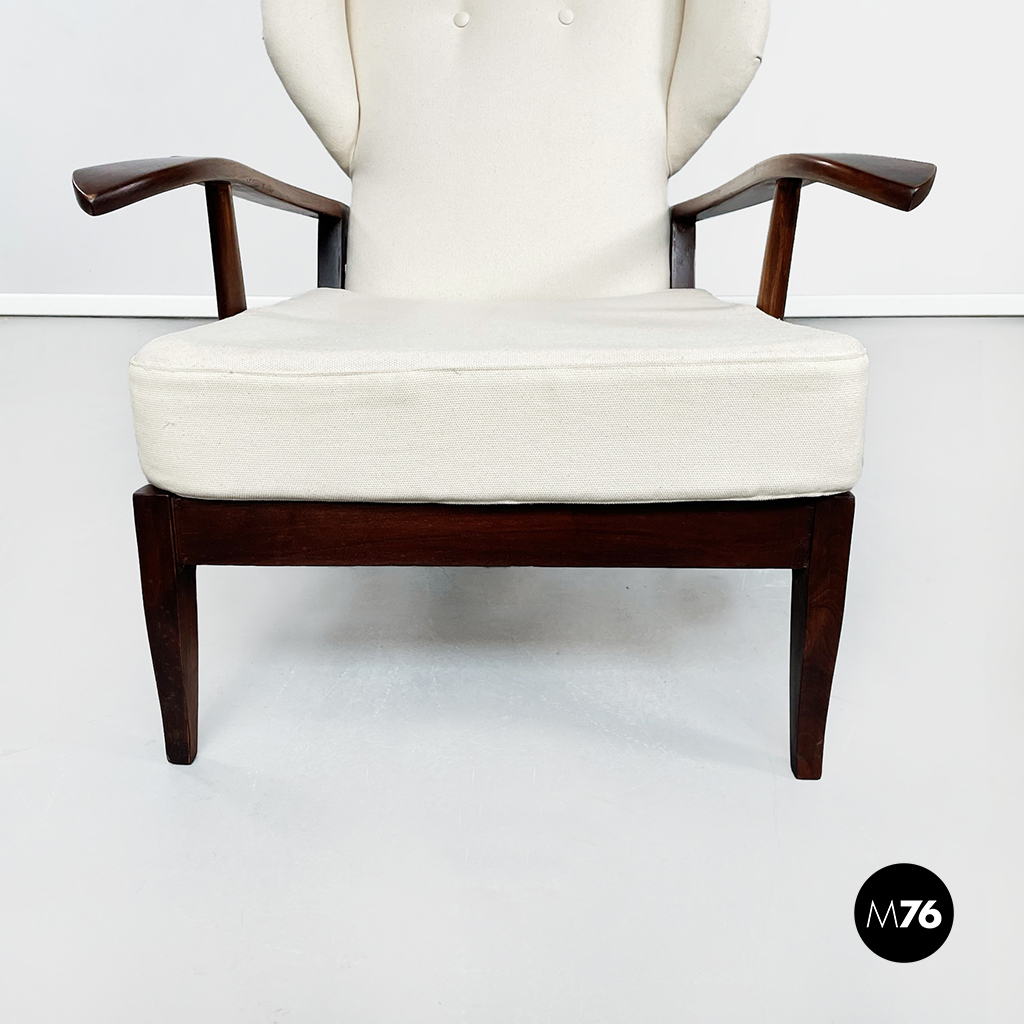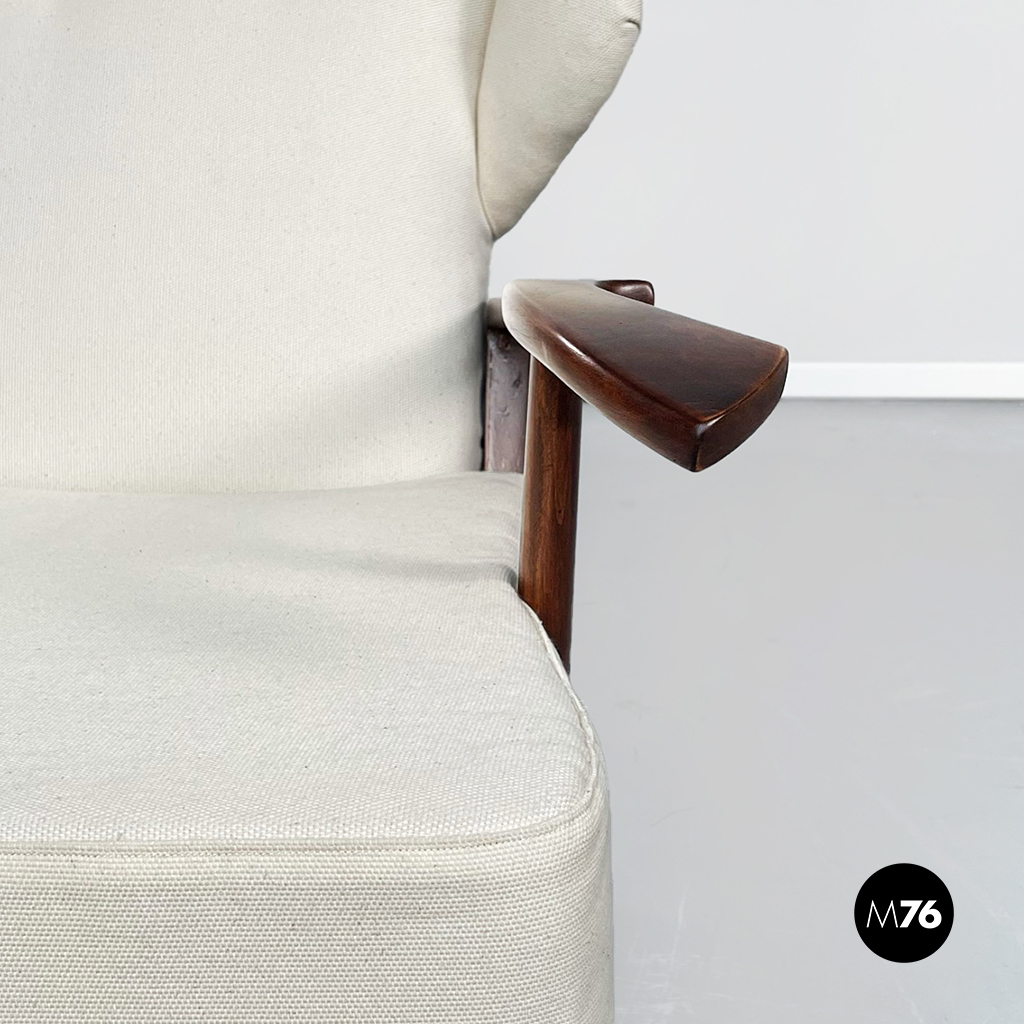Poltrona con struttura in legno con seduta composta da un cuscino imbottito in tessuto bianco sostenuto da una struttura metallica collegata alla struttura principale. I braccioli sono di forma irregolare ricurva in legno e lo schienale imbottito e rivestito in tessuto bianco presenta due alette laterali all’altezza della testa. La particolarità di questa poltrona sta nello schienale infatti questo può essere altazato e riposizionato con angolature diverse.