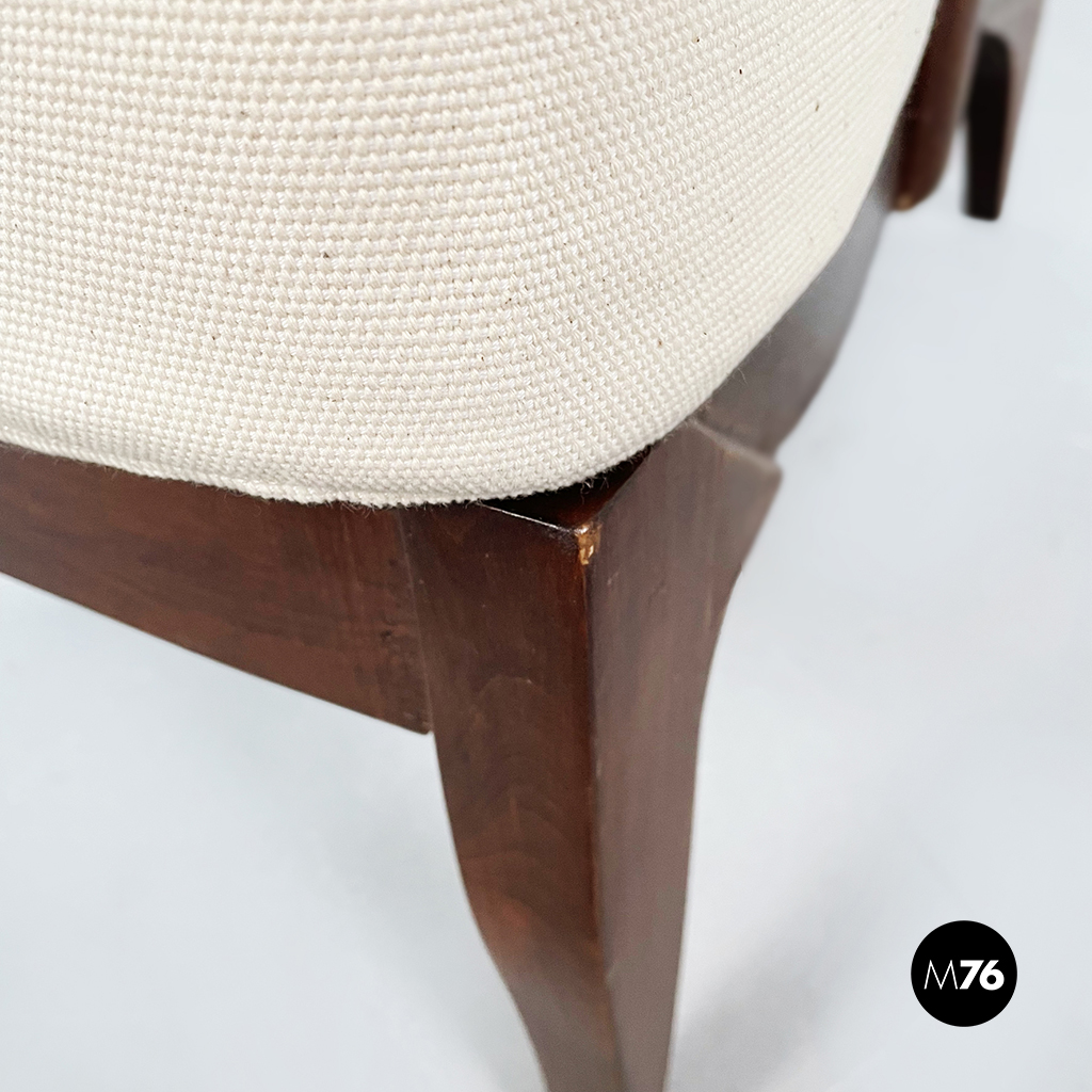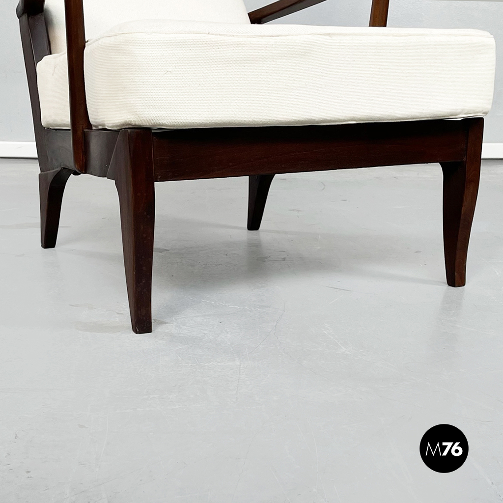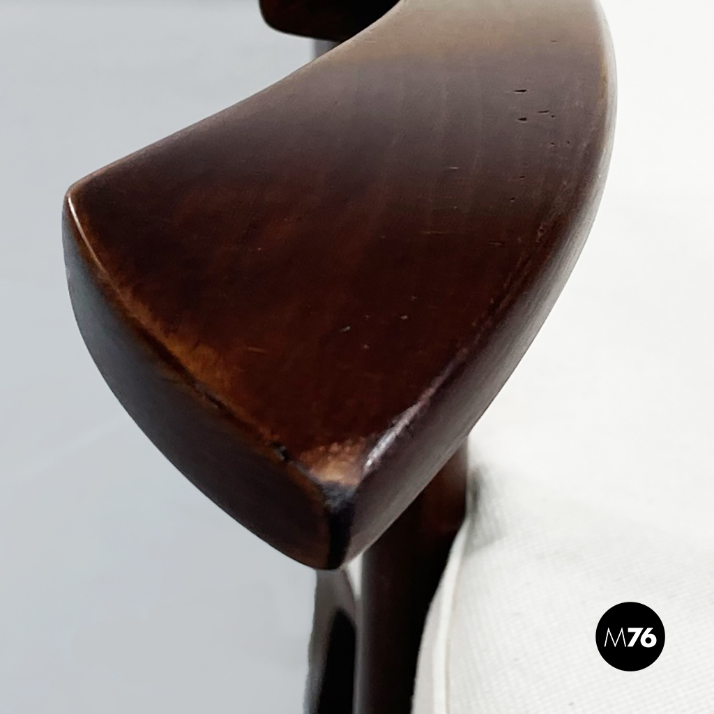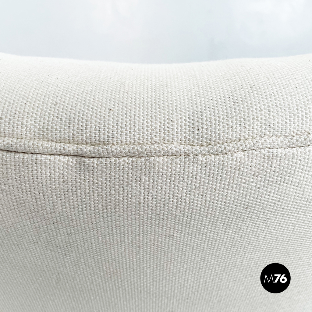Poltrona con struttura in legno con seduta composta da un cuscino imbottito in tessuto bianco sostenuto da una struttura metallica collegata alla struttura principale. I braccioli sono di forma irregolare ricurva in legno e lo schienale imbottito e rivestito in tessuto bianco presenta due alette laterali all’altezza della testa. La particolarità di questa poltrona sta nello schienale infatti questo può essere altazato e riposizionato con angolature diverse.