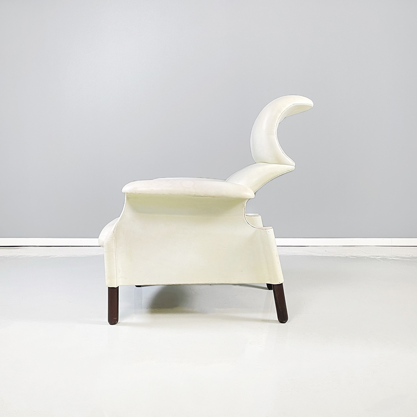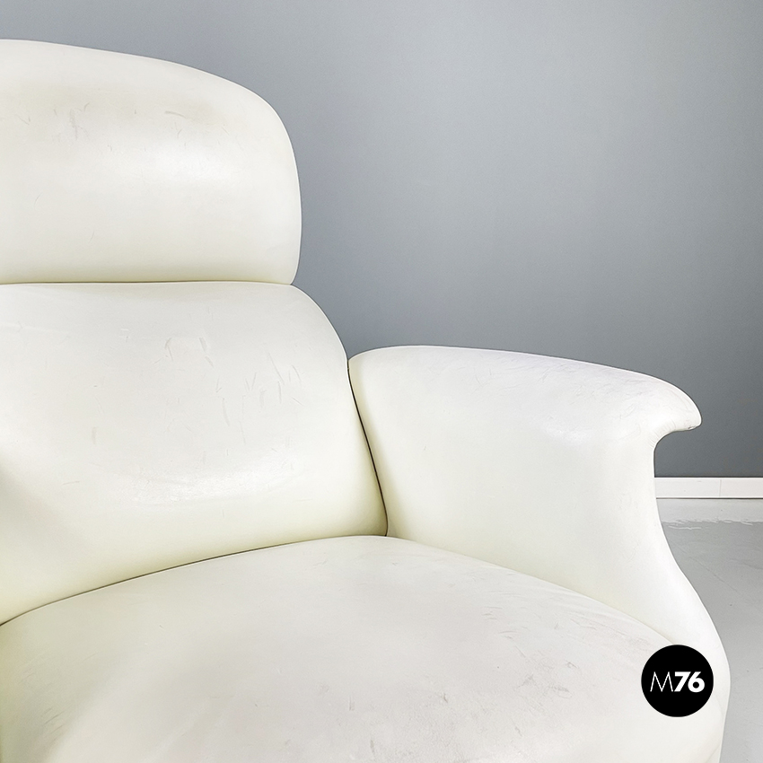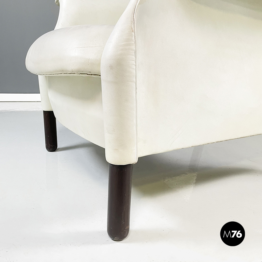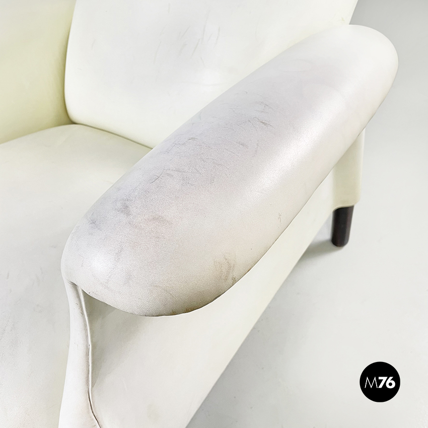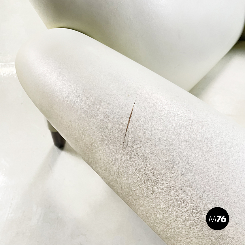 Poltrona model Sanluca in pelle bianca. Seduta squadrata imbottita. L’iconico schienale è composto da due archi. Braccioli ricurvi. Piedini cilindrici in legno.