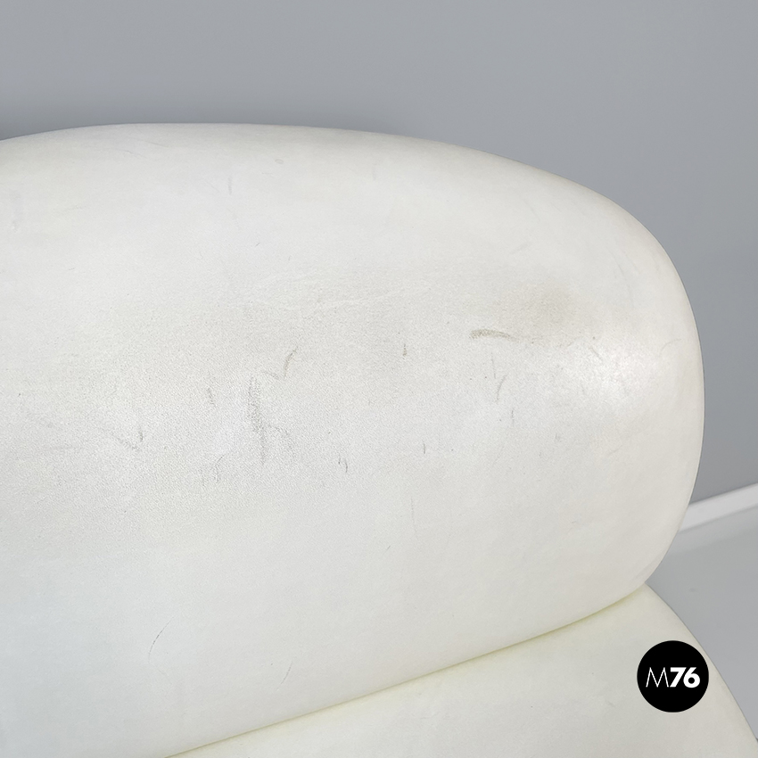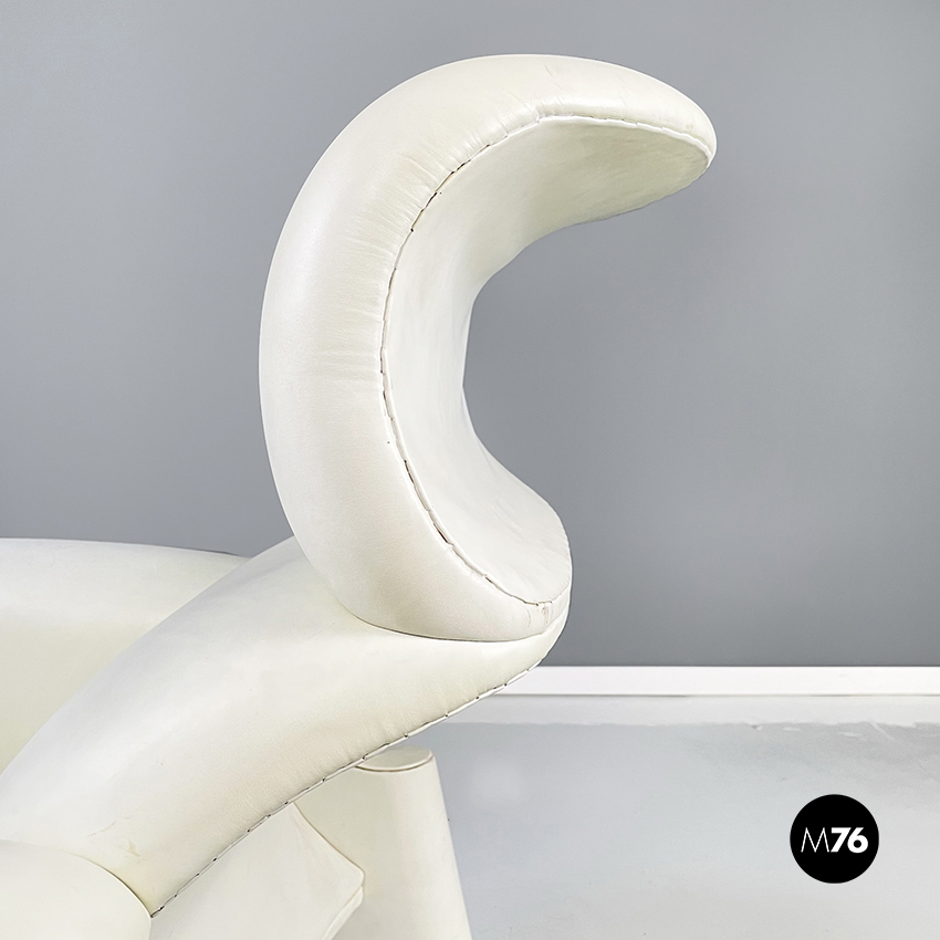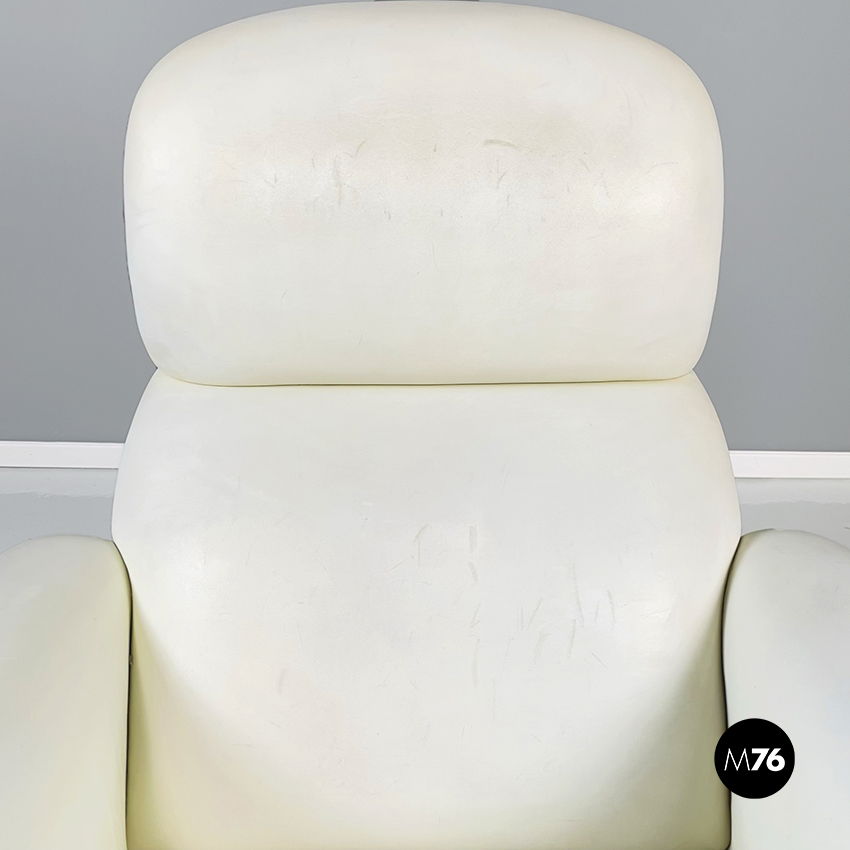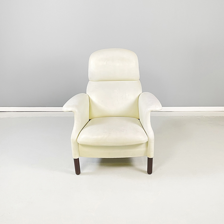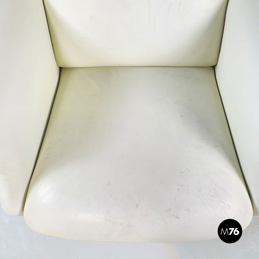 Poltrona model Sanluca in pelle bianca. Seduta squadrata imbottita. L’iconico schienale è composto da due archi. Braccioli ricurvi. Piedini cilindrici in legno.