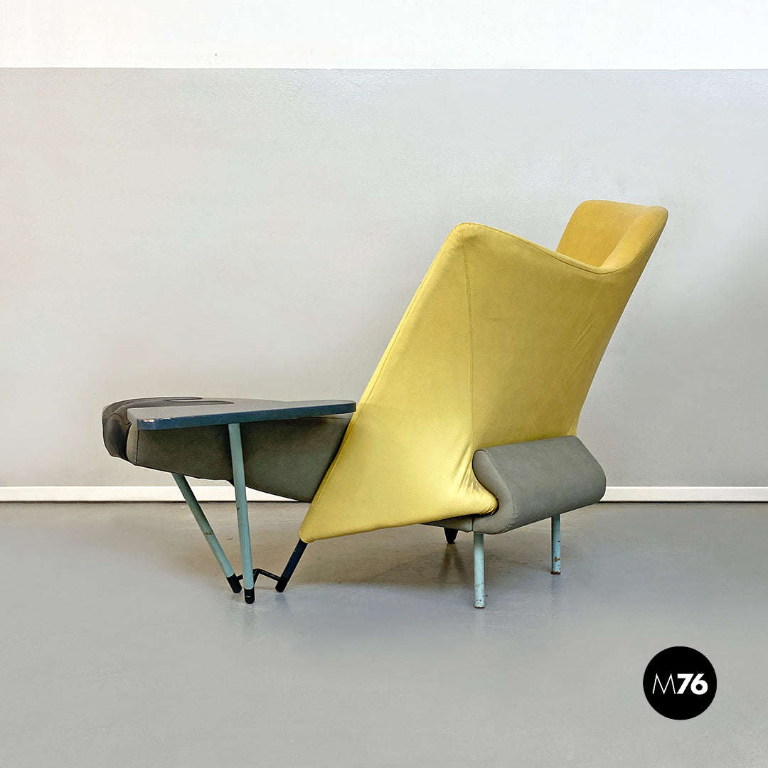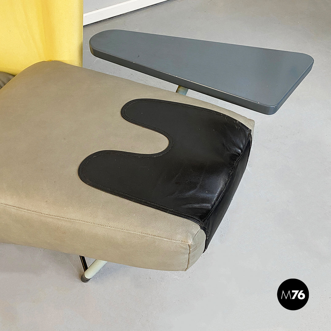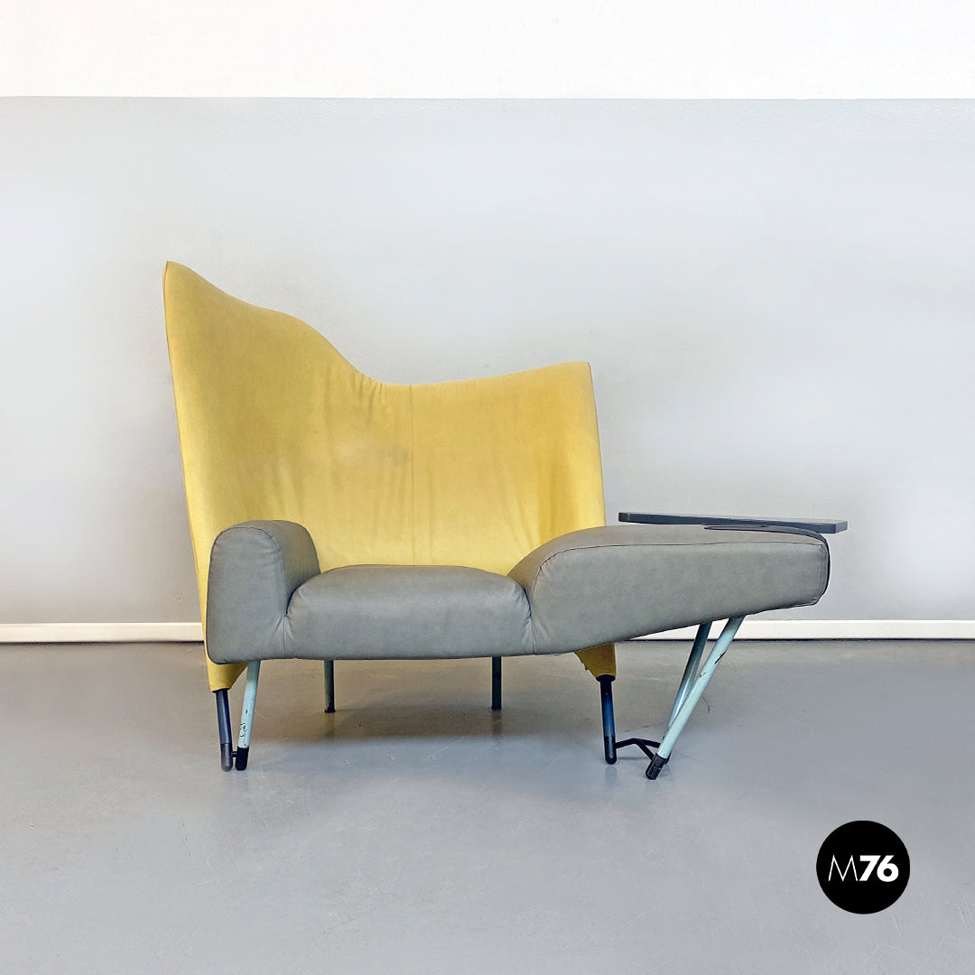 Chaise longue asimmetrica modello Torso con seduta in tessuto e pelle imbottita di forma irregolare e di colore grigio e giallo con annesso tavolino triangolare e zampe in metallo bianche.