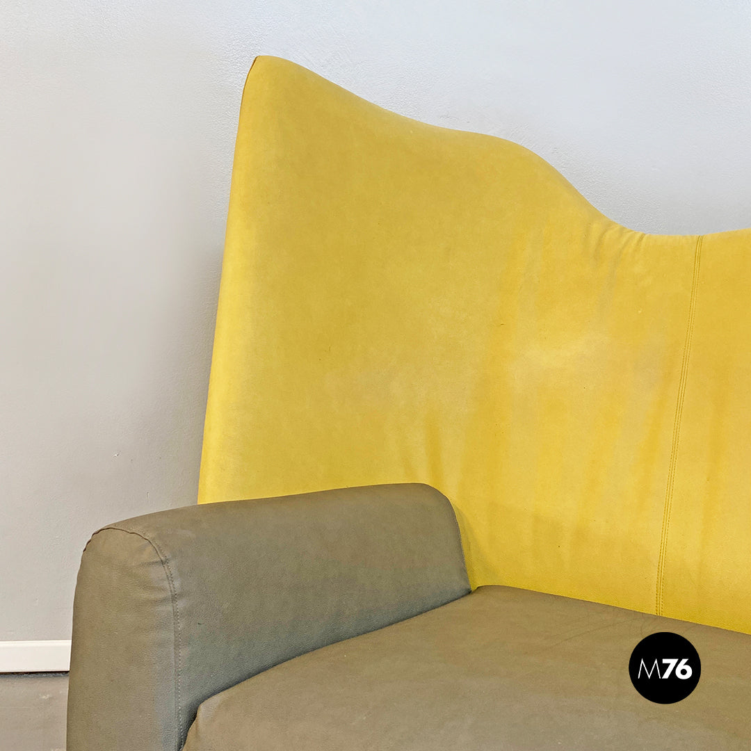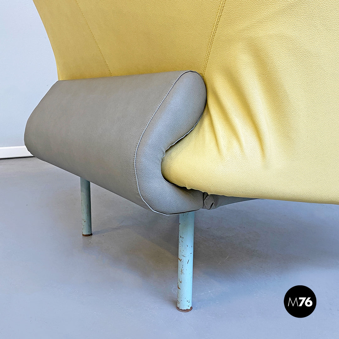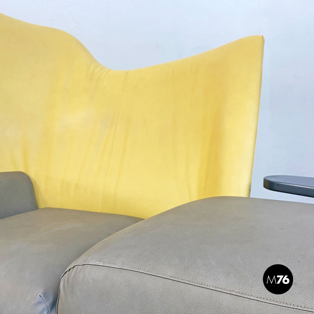 Chaise longue asimmetrica modello Torso con seduta in tessuto e pelle imbottita di forma irregolare e di colore grigio e giallo con annesso tavolino triangolare e zampe in metallo bianche.