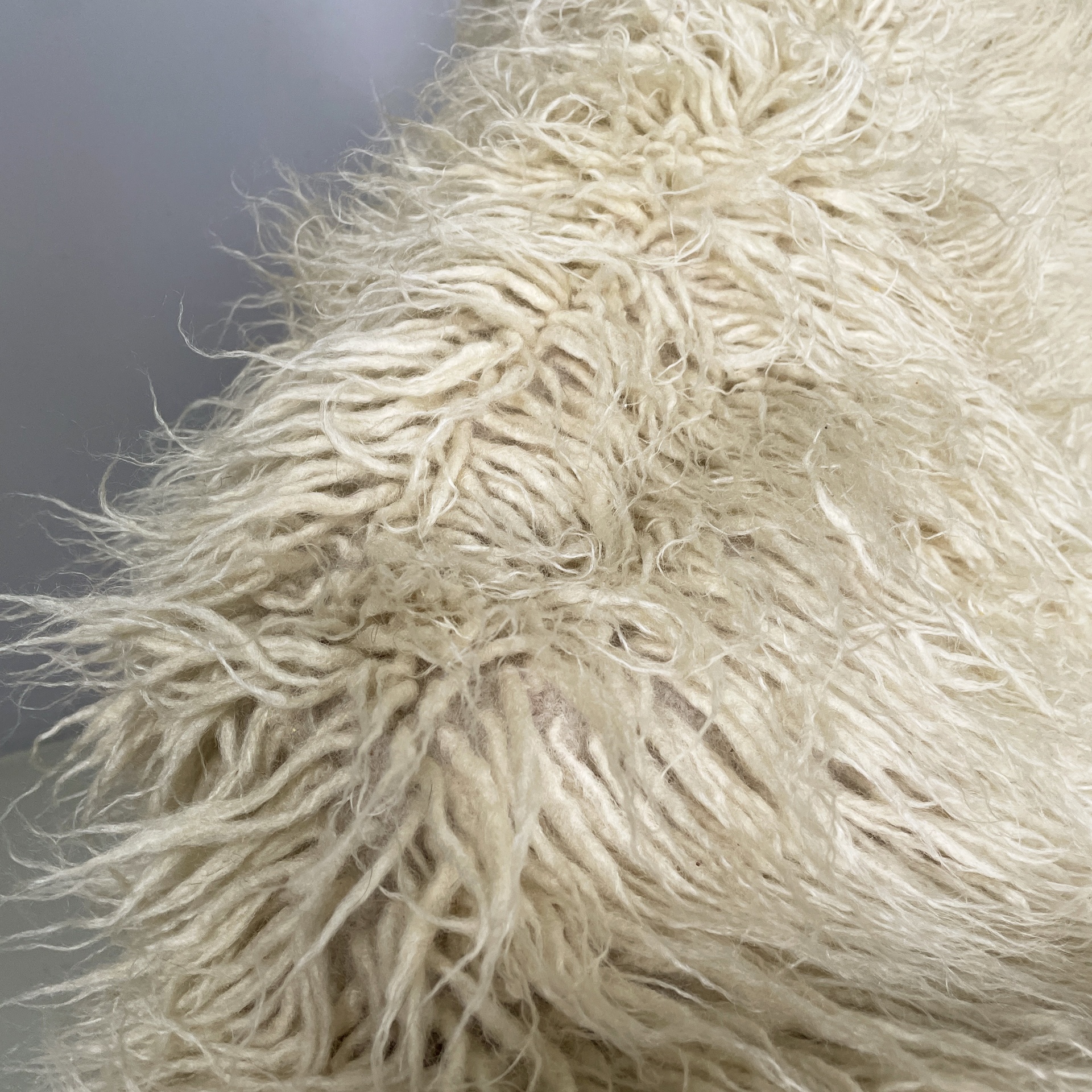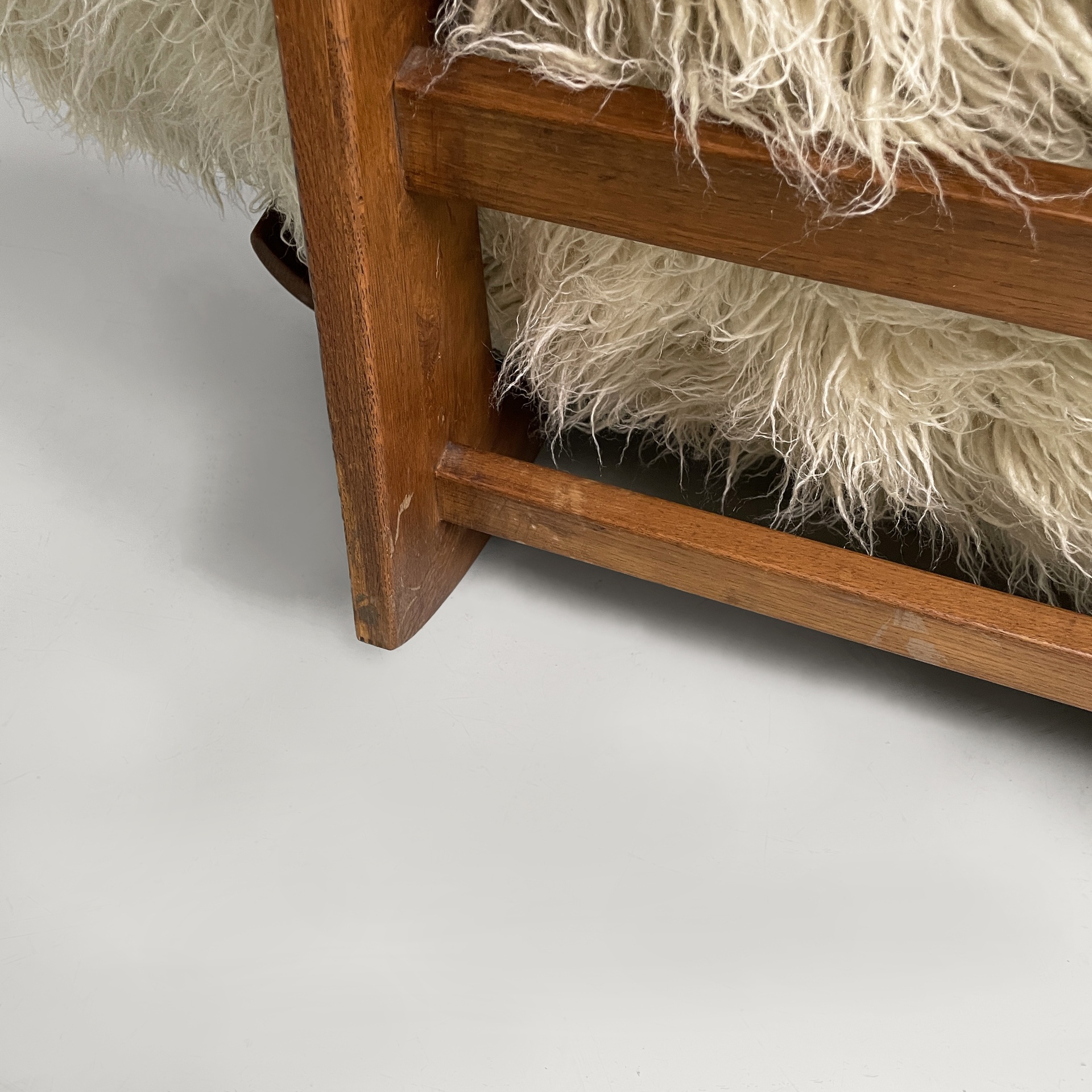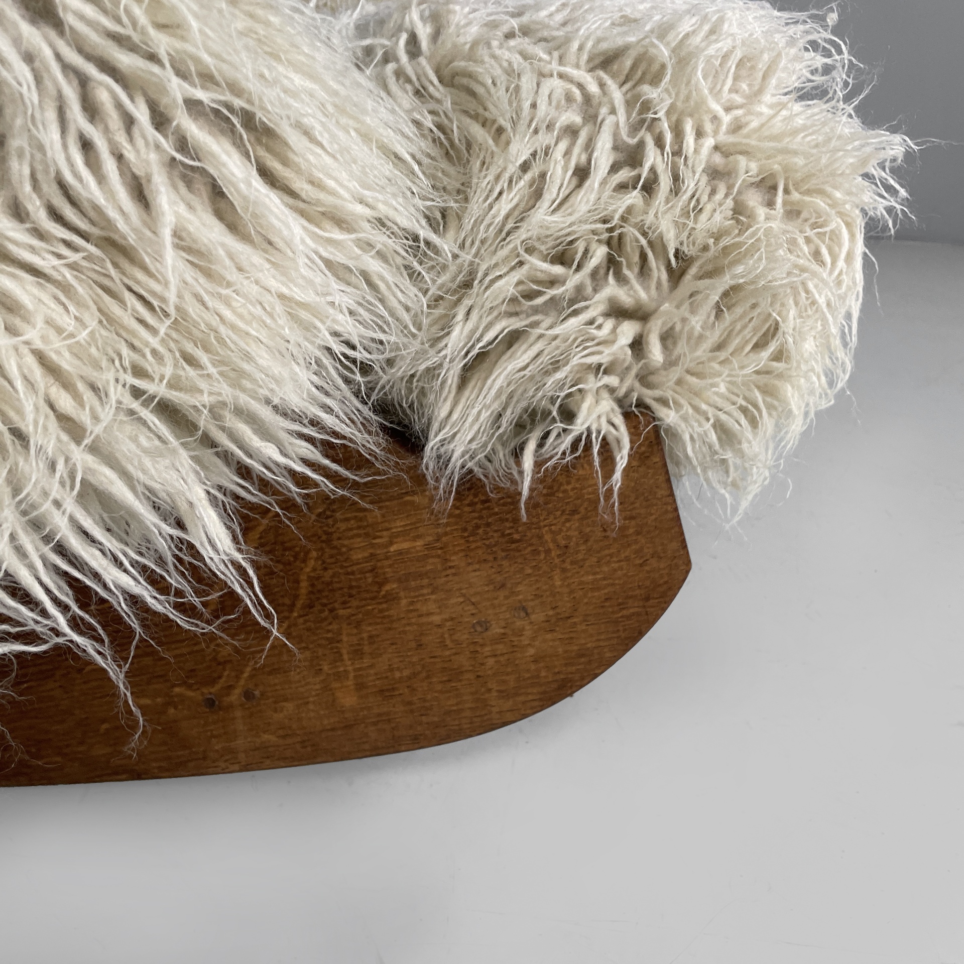 Poltrona a dondolo modello Yeti con seduta, schienale e braccioli composti da un unico cuscino a forma umana, imbottito e rivestito in tessuto a pelo lungo bianco-beige. Struttura in legno.