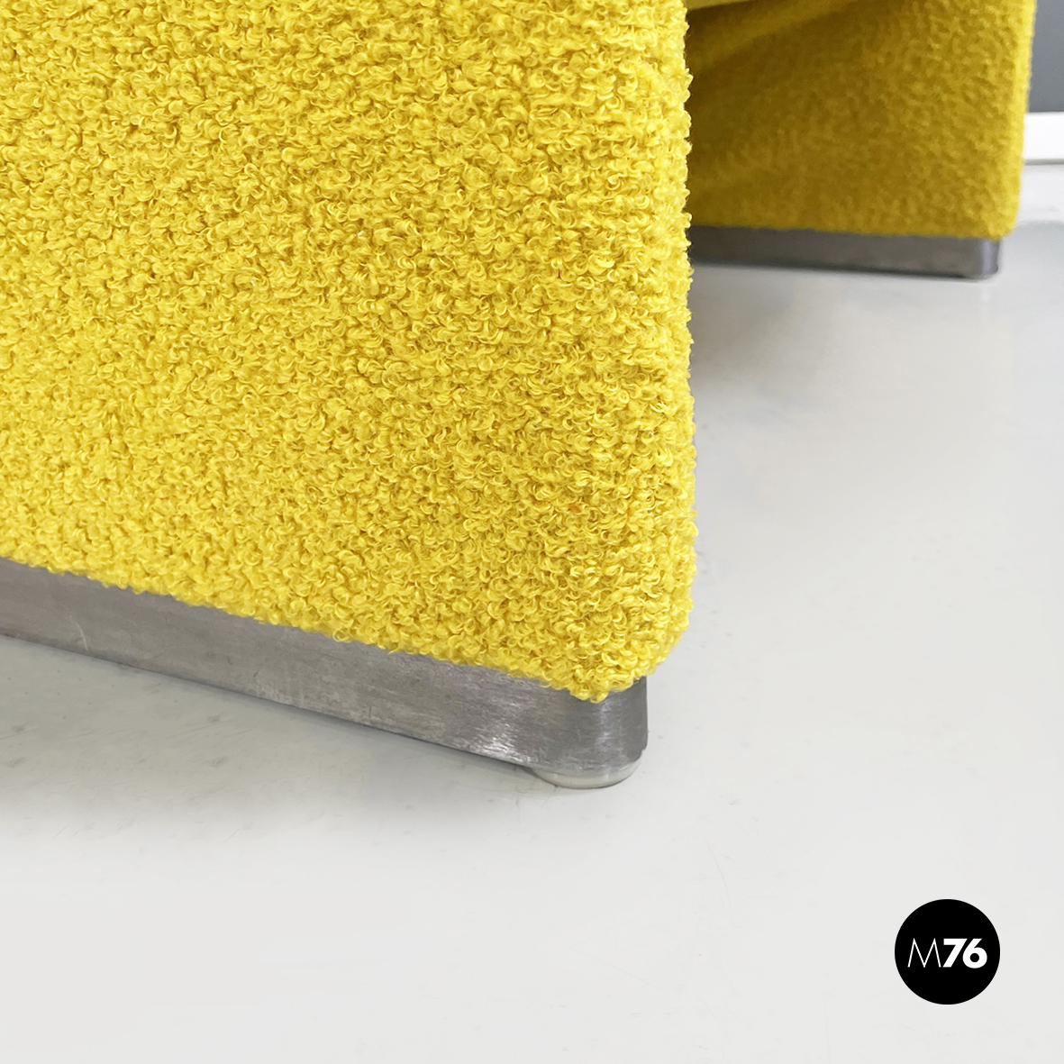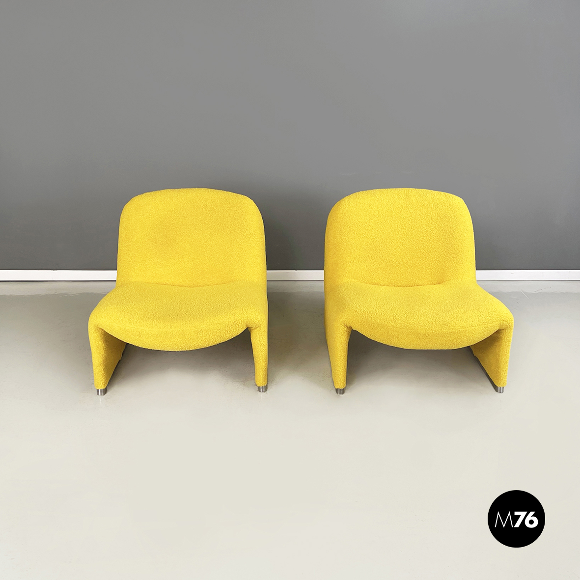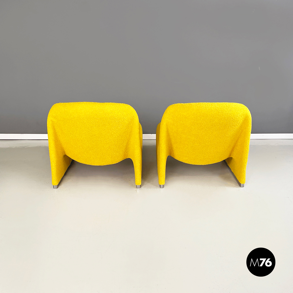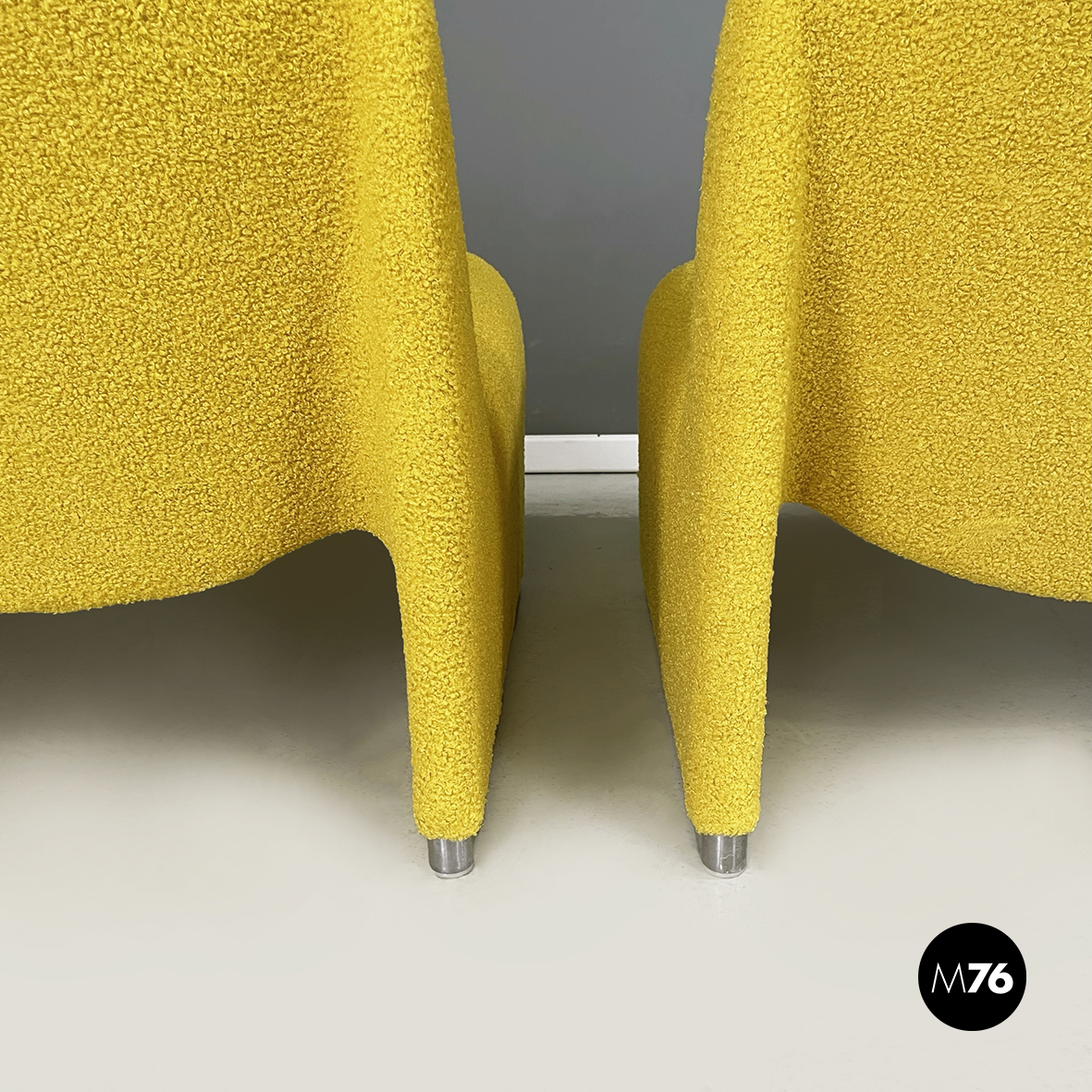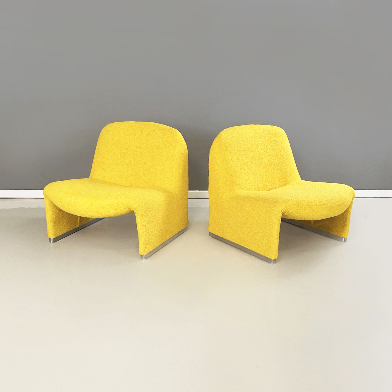 Coppia di poltrone modello Alky in morbido tessuto teddy giallo. La struttura monoscocca è provvista da entrambi i lati di piedini in alluminio satinato.