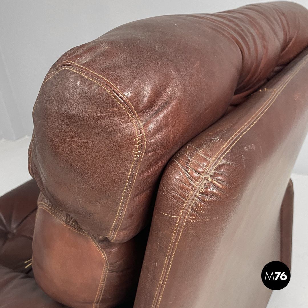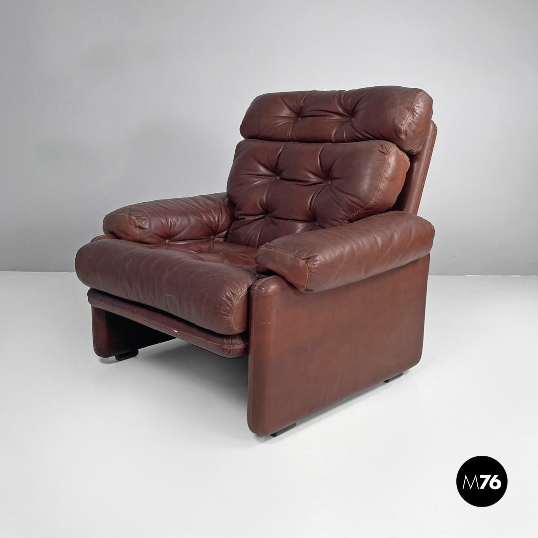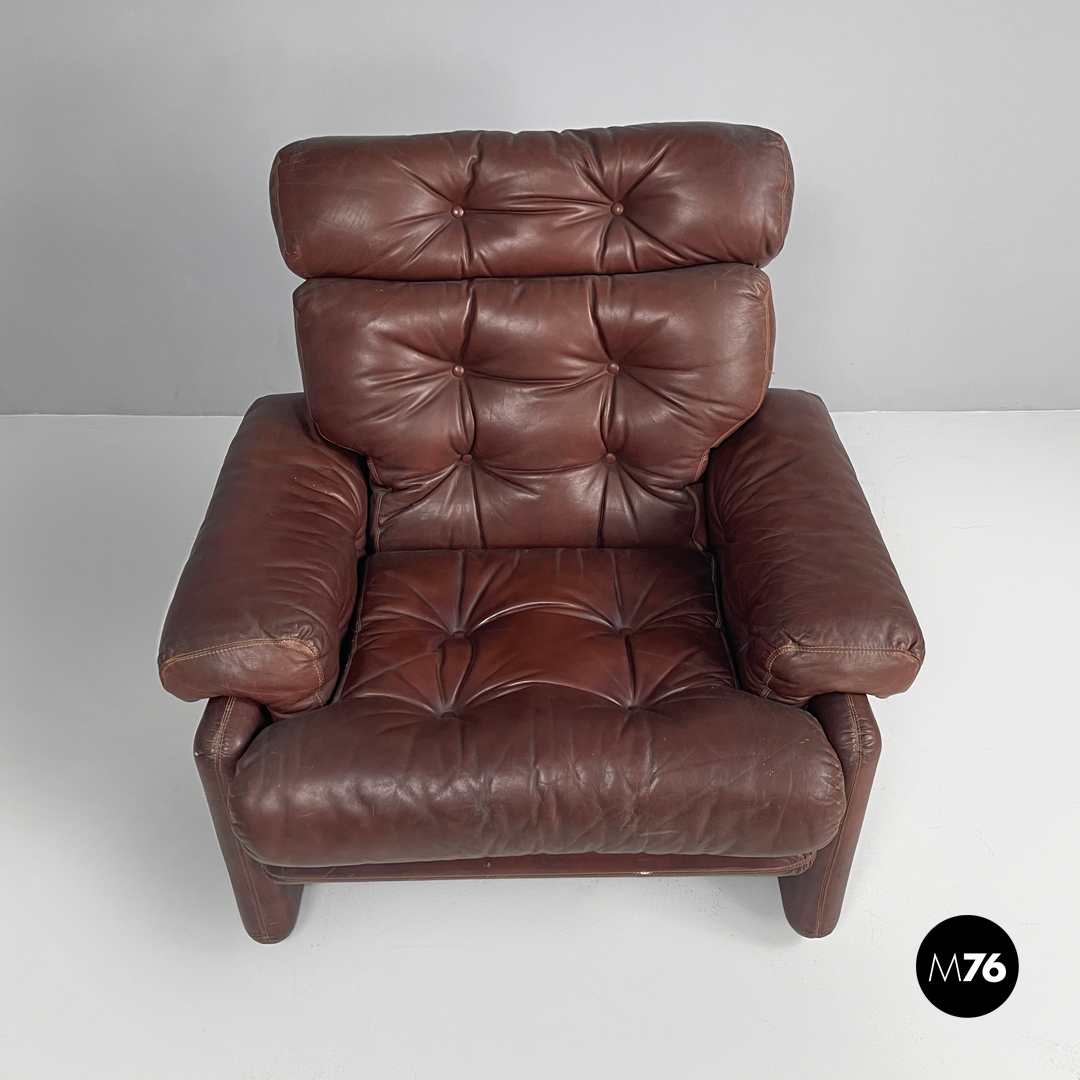 Coppia di poltrone modello Coronado in pelle marrone con schienale alto. La seduta i braccioli e lo schienale hanno linee curve e morbide con bottoni. La struttura esterna della seduta è rigida e anch’essa rivestita in pelle. Presenta quattro piedini cilindrici in plastica marrone.