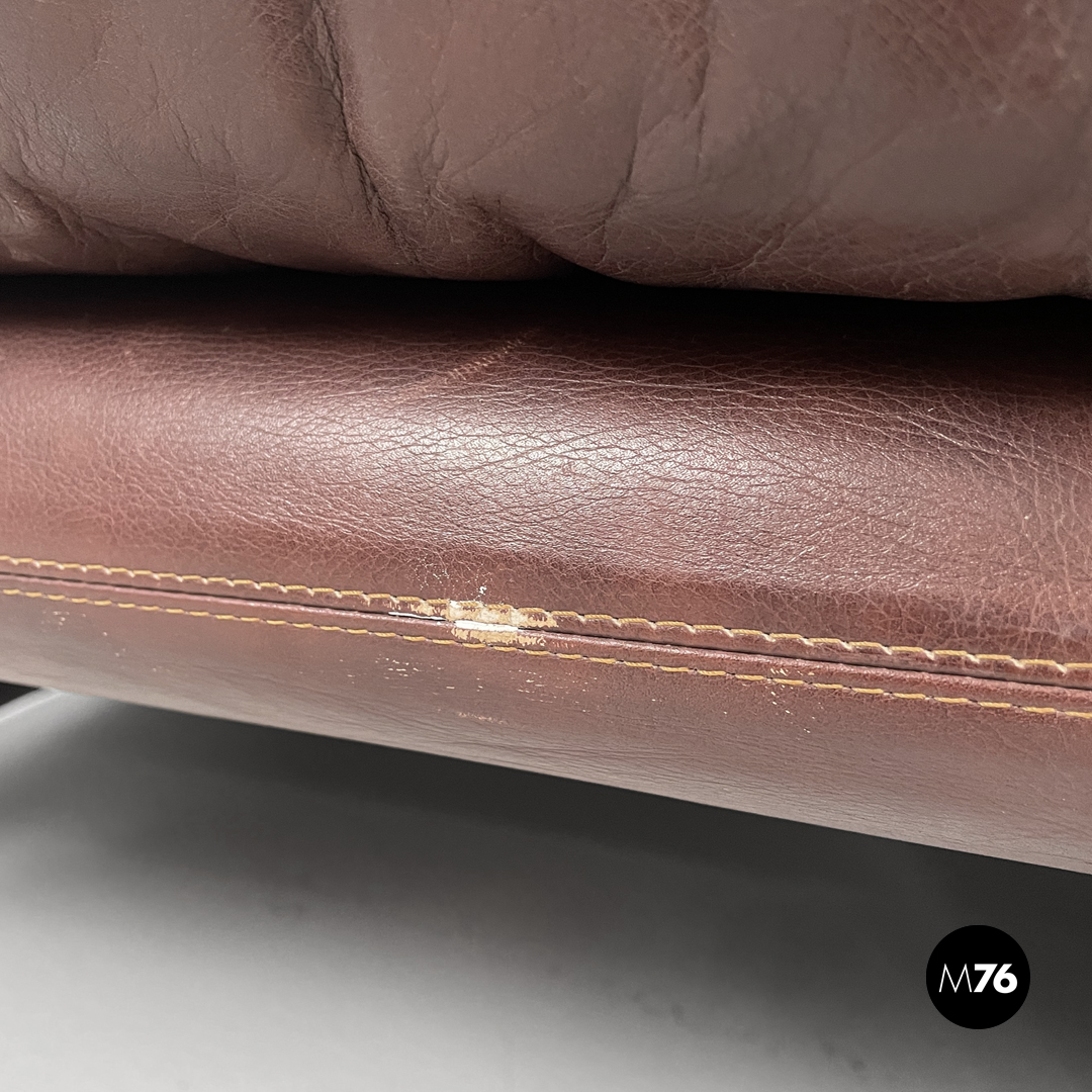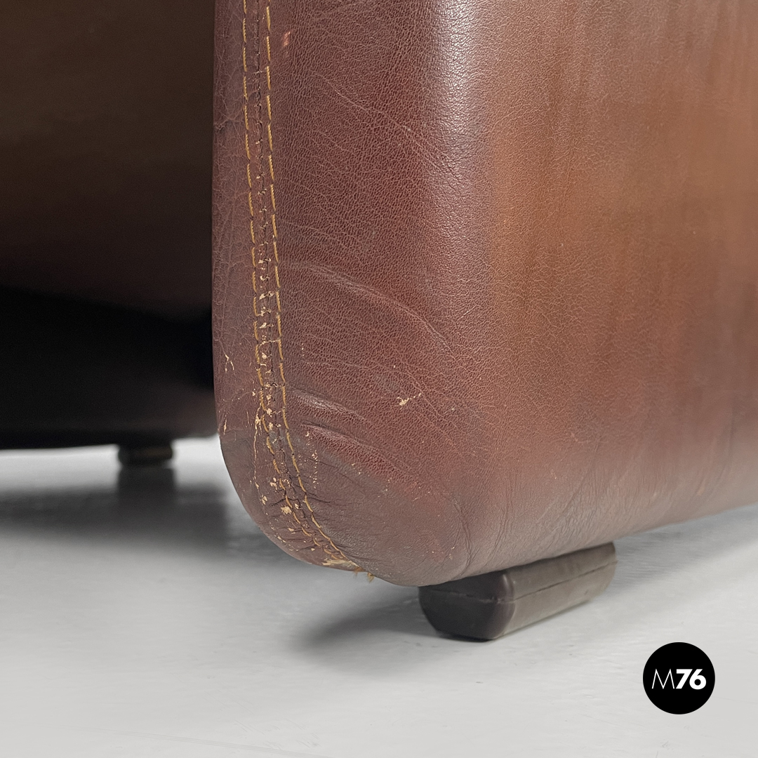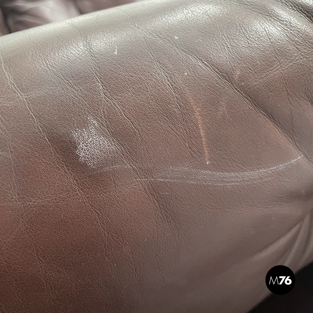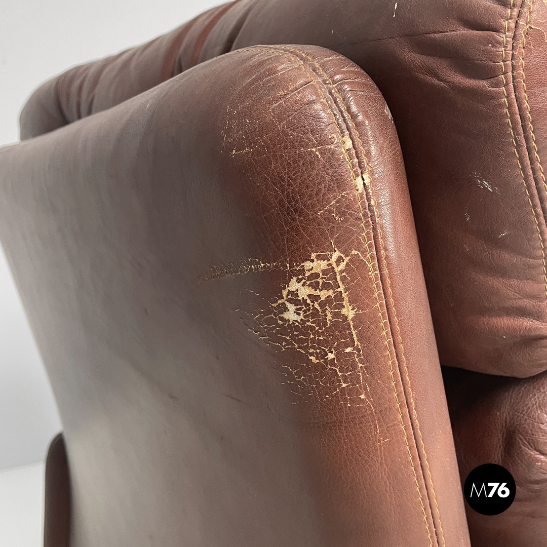 Coppia di poltrone modello Coronado in pelle marrone con schienale alto. La seduta i braccioli e lo schienale hanno linee curve e morbide con bottoni. La struttura esterna della seduta è rigida e anch’essa rivestita in pelle. Presenta quattro piedini cilindrici in plastica marrone.