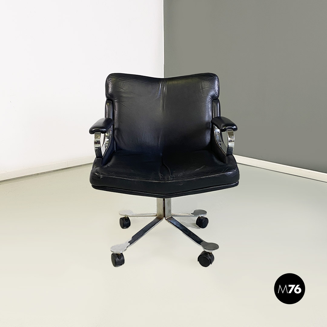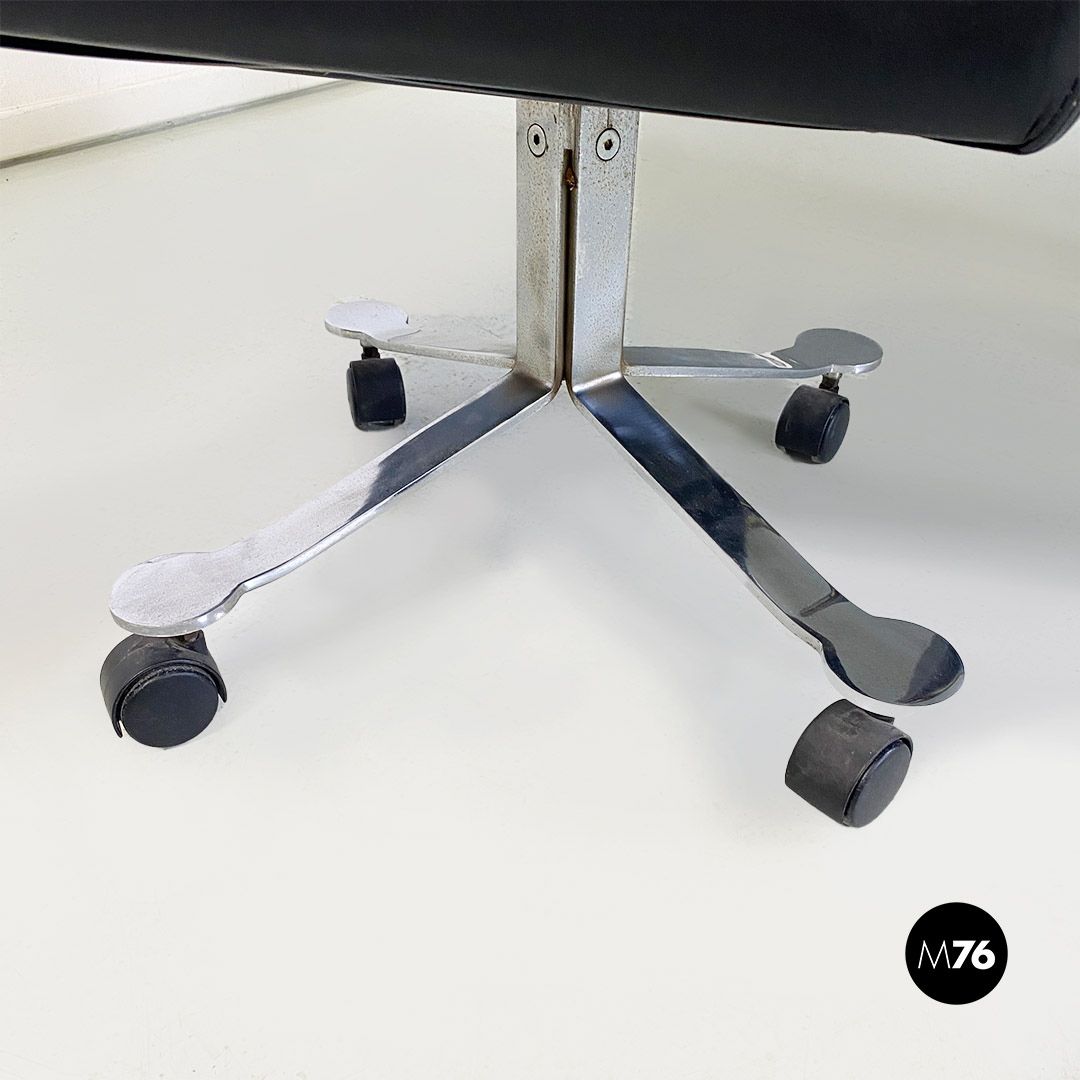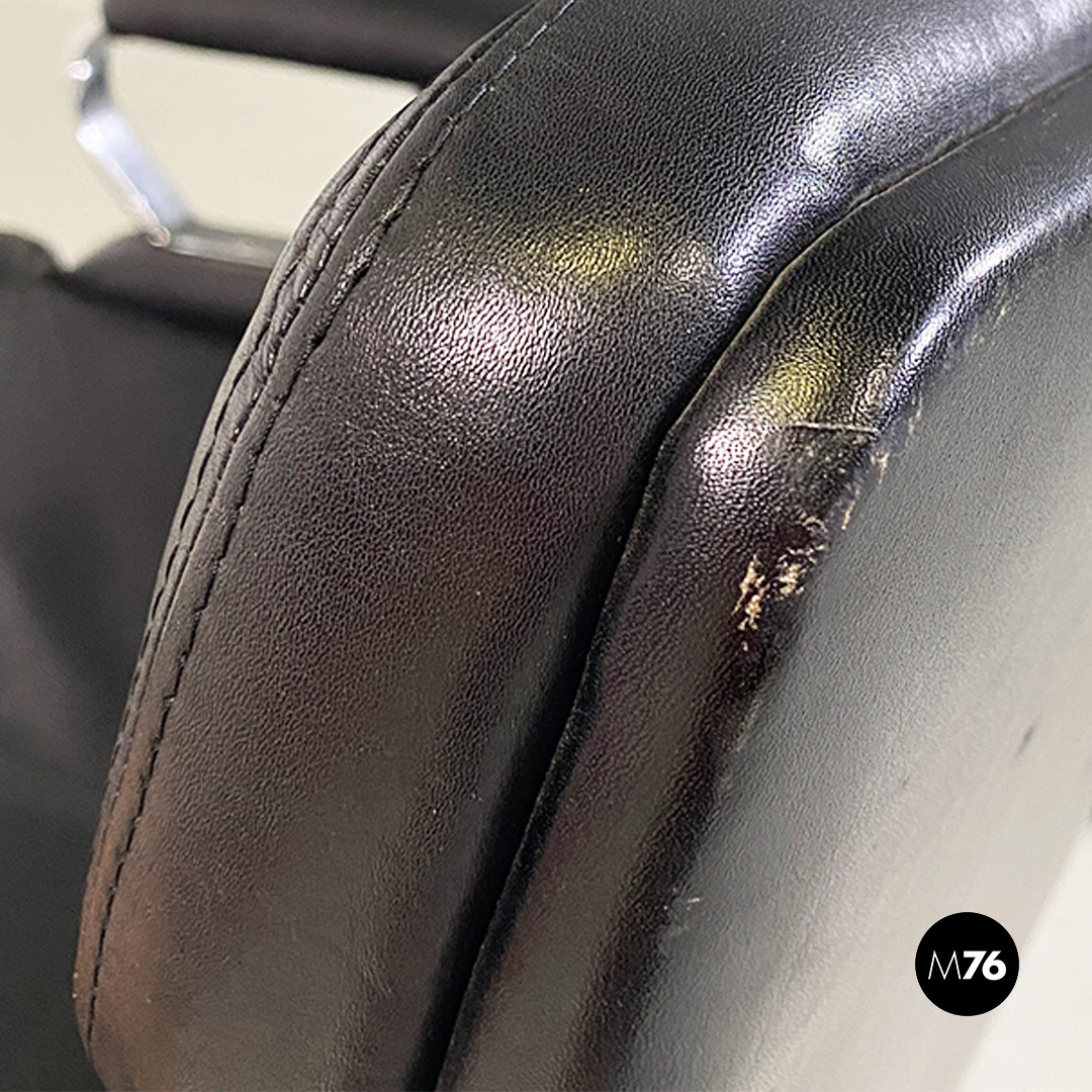 Coppia di poltrone o sedie da ufficio con base della sedia in acciaio a quattro razze su ruote e braccioli curvati, con parte d’appoggio dritta rivestita in pelle, imbottita e rivestita nella sua pelle nera originale nera.