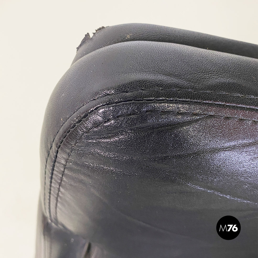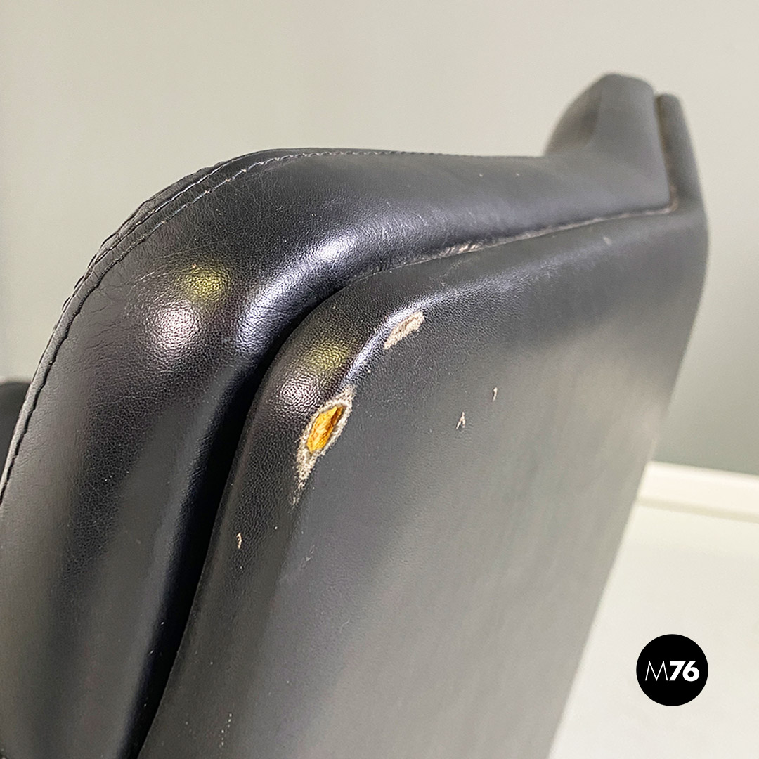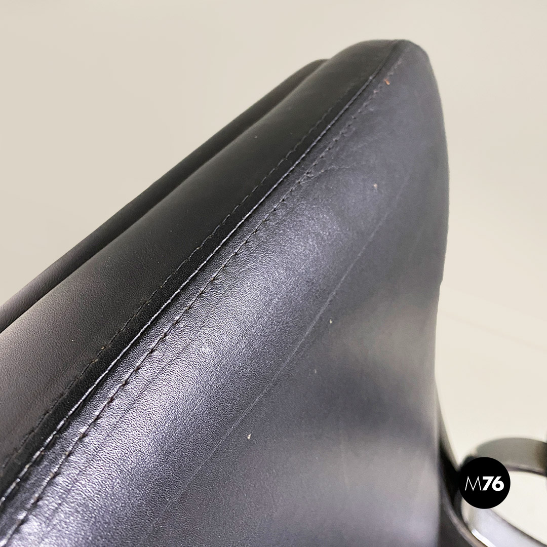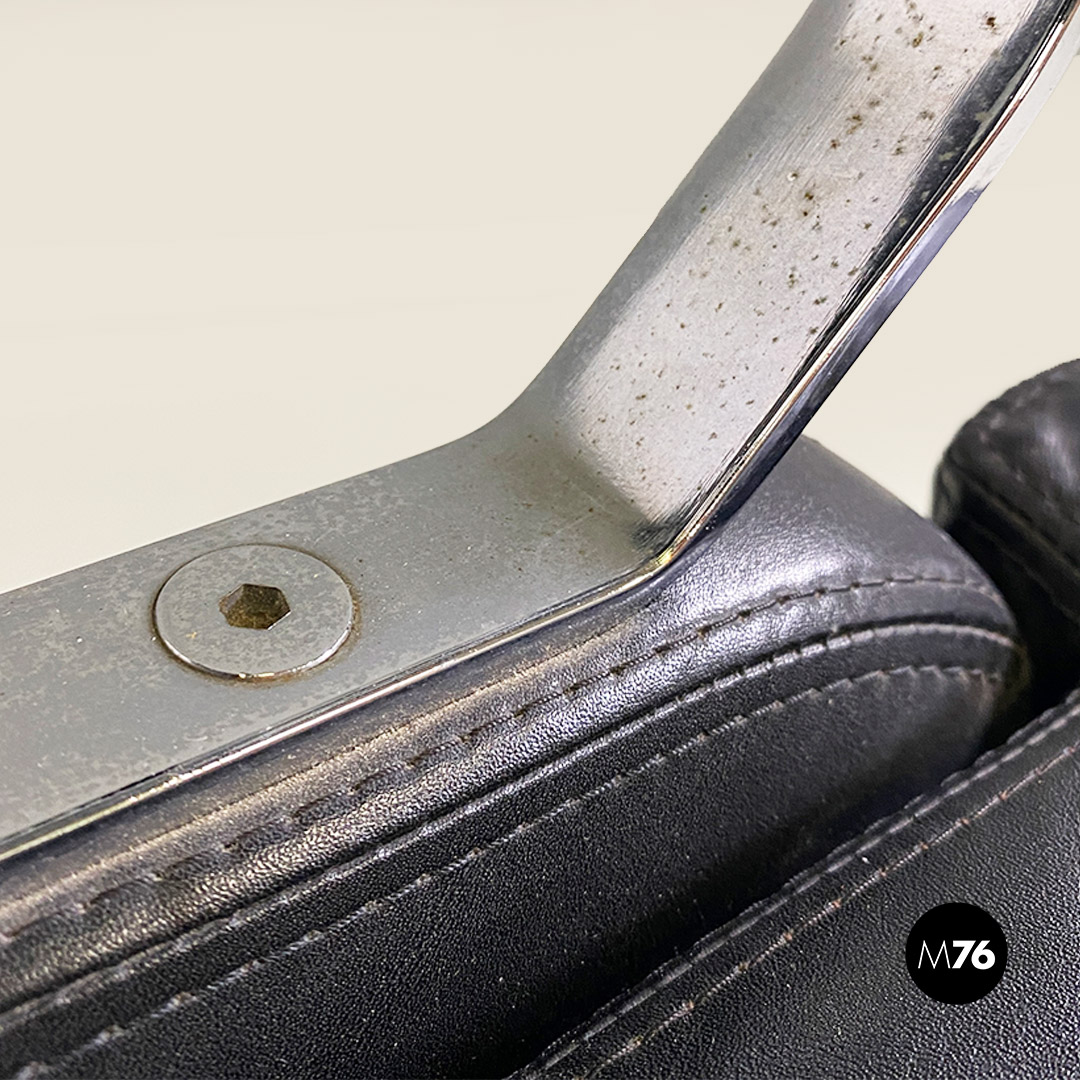 Coppia di poltrone o sedie da ufficio con base della sedia in acciaio a quattro razze su ruote e braccioli curvati, con parte d’appoggio dritta rivestita in pelle, imbottita e rivestita nella sua pelle nera originale nera.