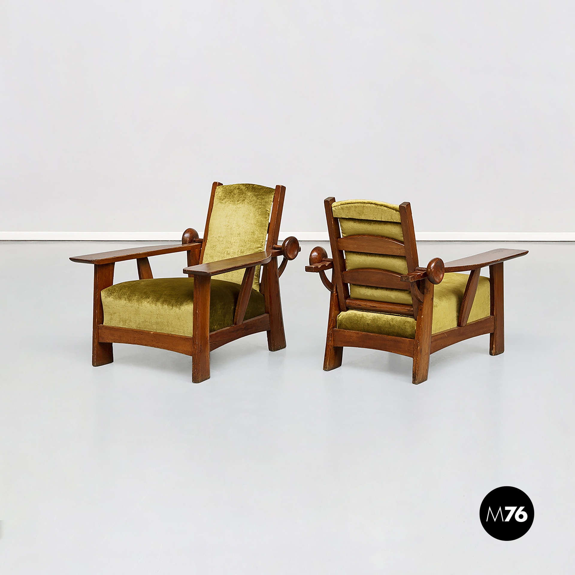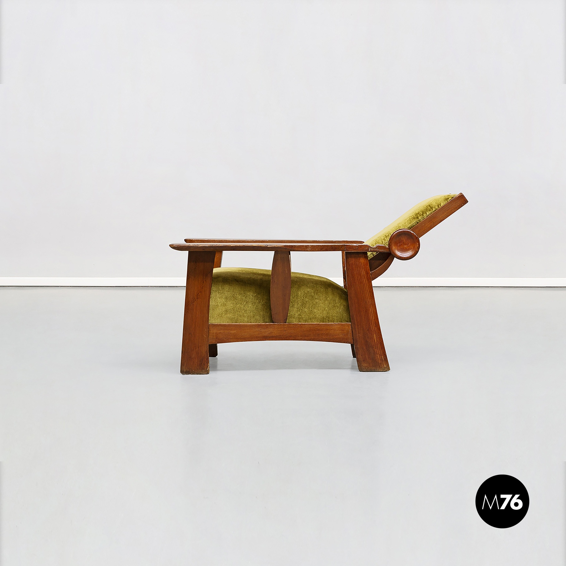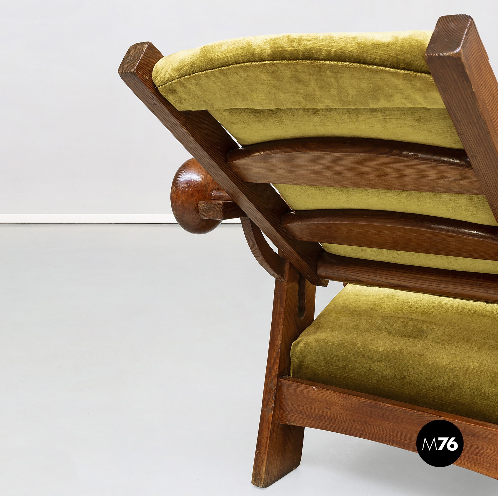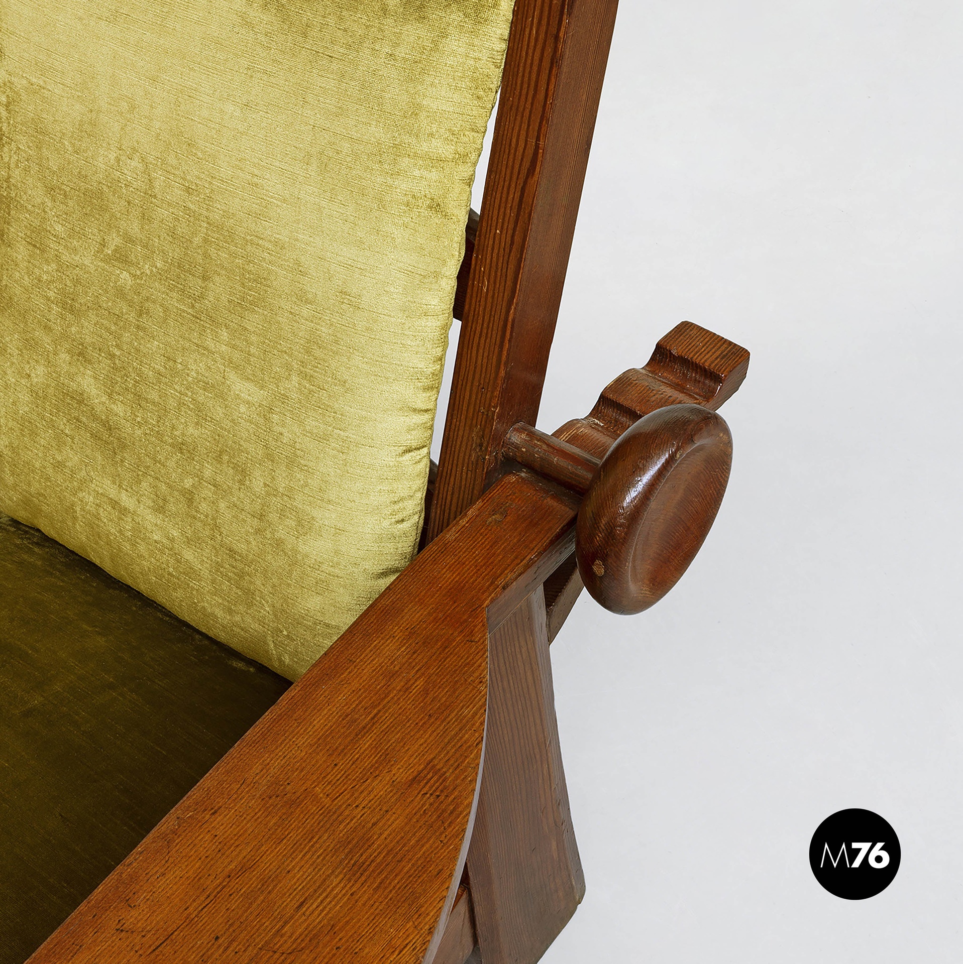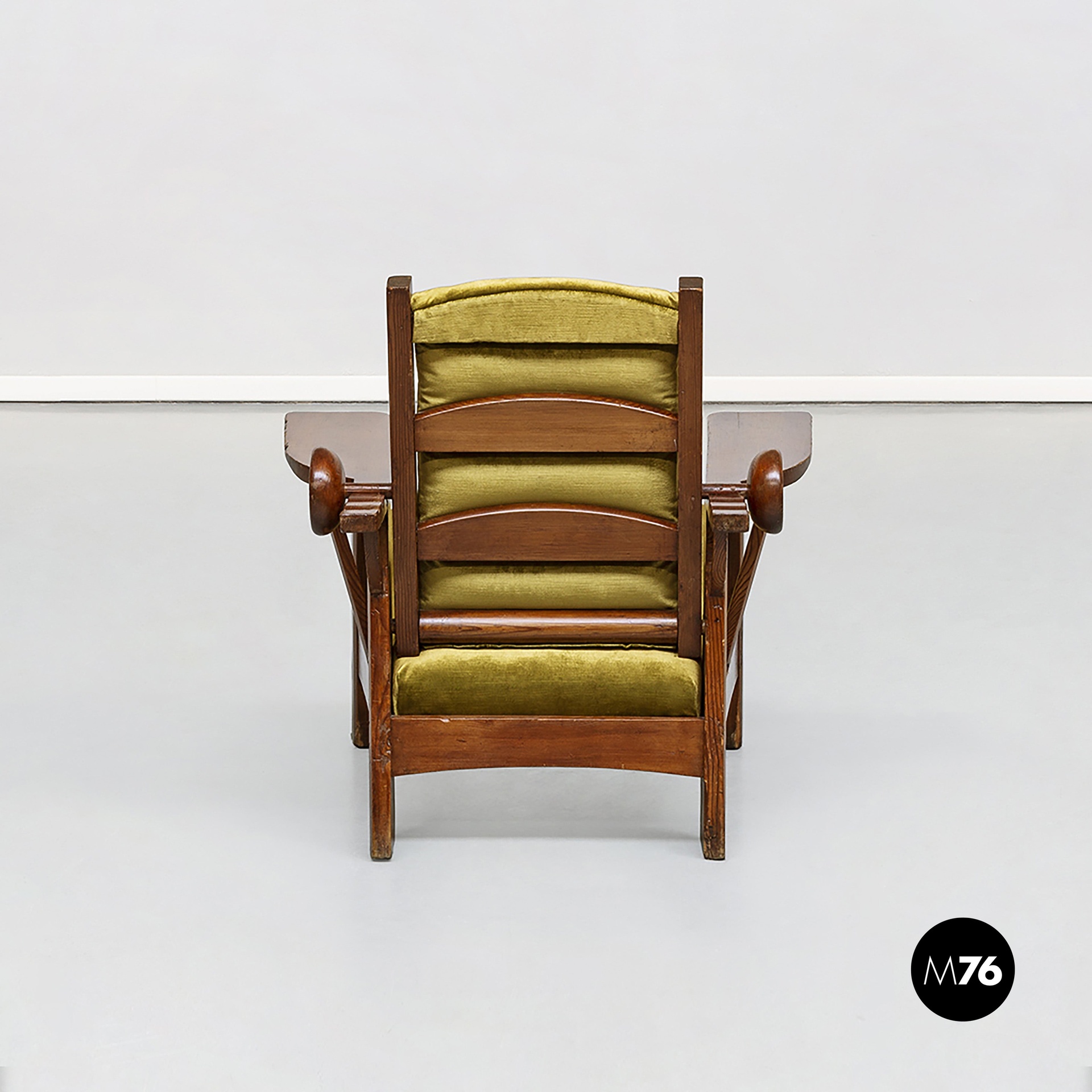 Coppia di poltrone uniche con struttura in legno massello e seduta rettangolare in velluto verde brillante schienale rivestito in velluto e regolabile in tre diverse posizioni grazie a due maniglie tornite raggiungendo un’estensione massima di 117 cm. Listelli in legno sullo schienale permettono a traspirazione del velluto.