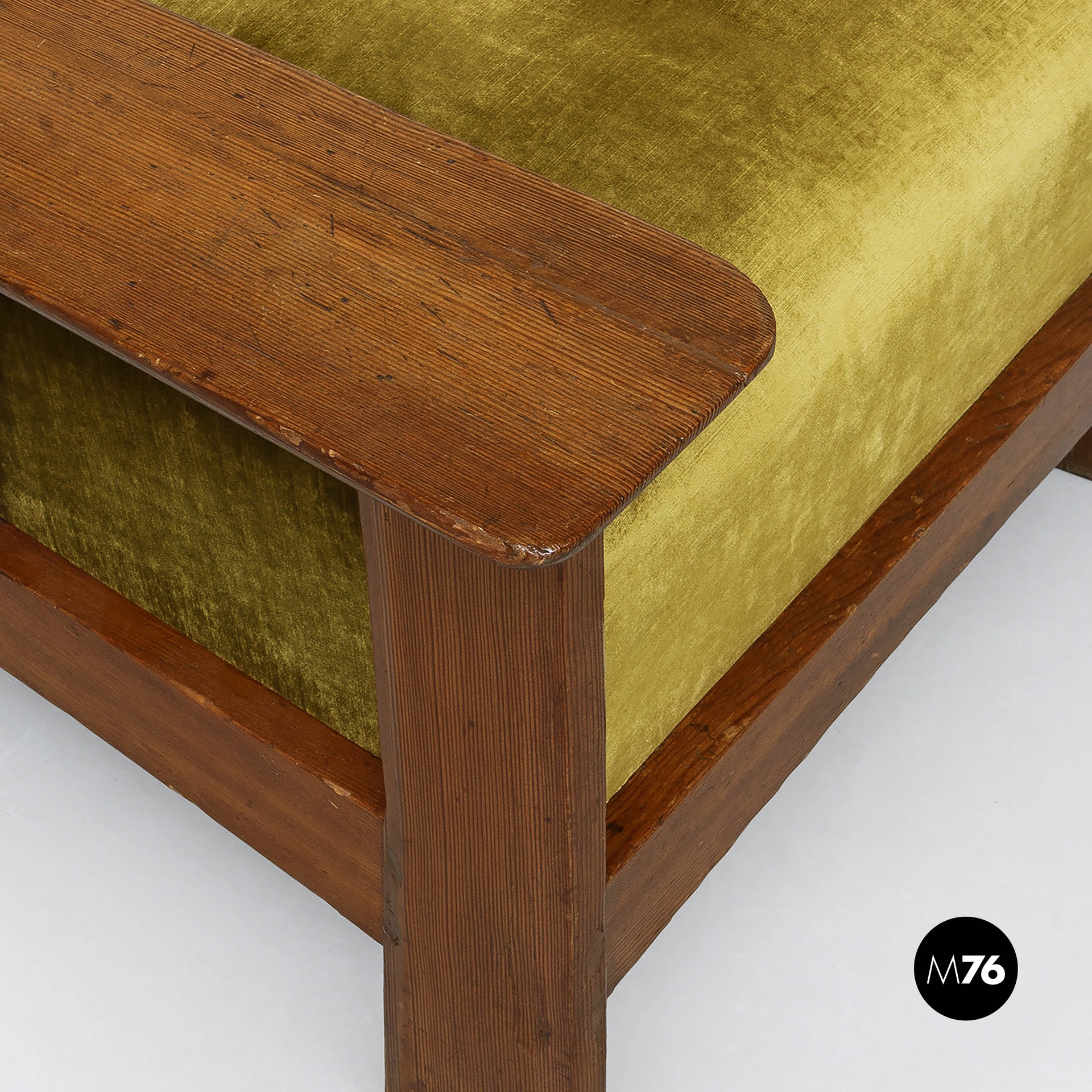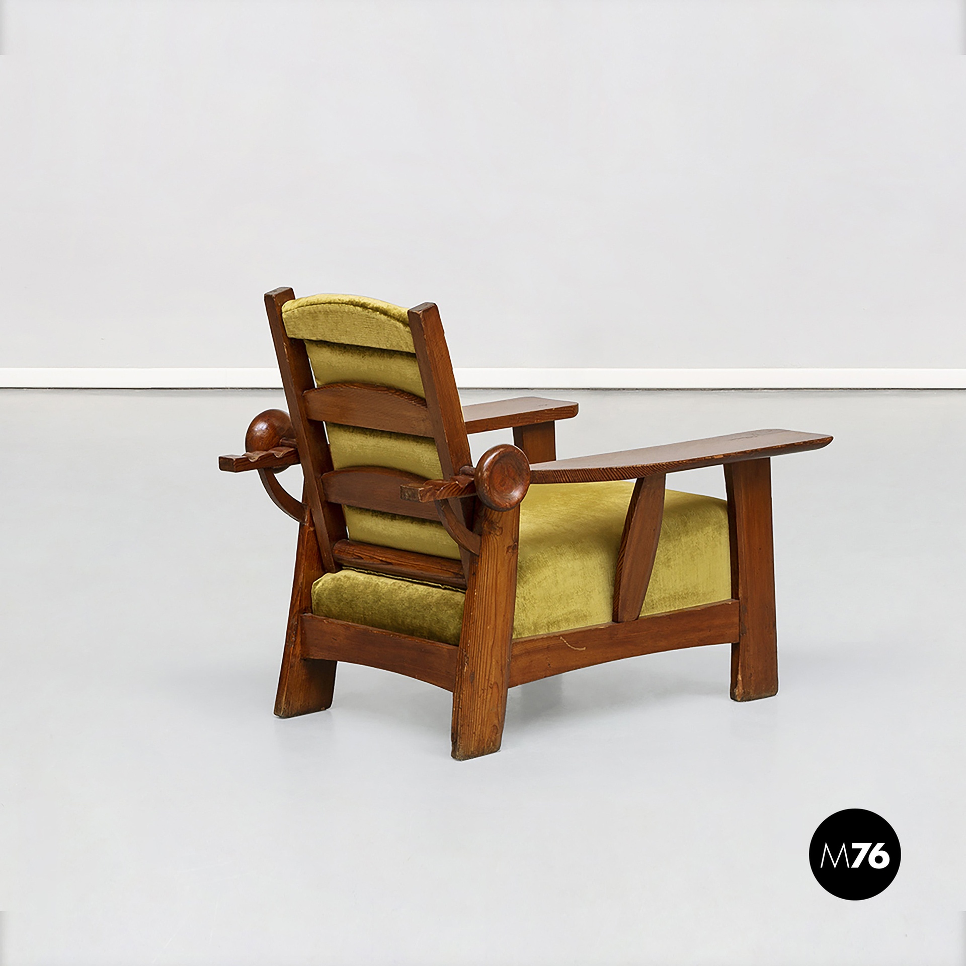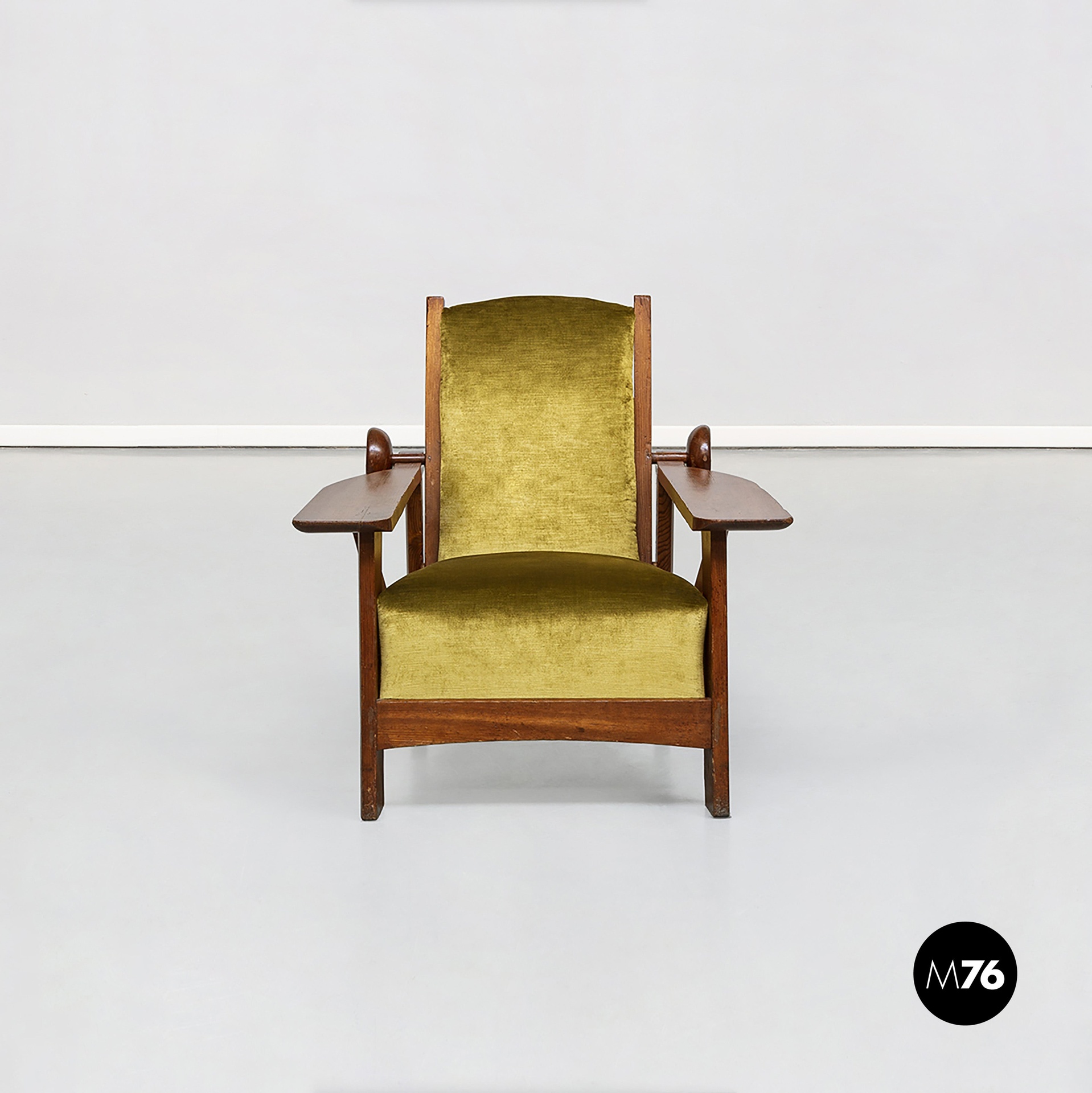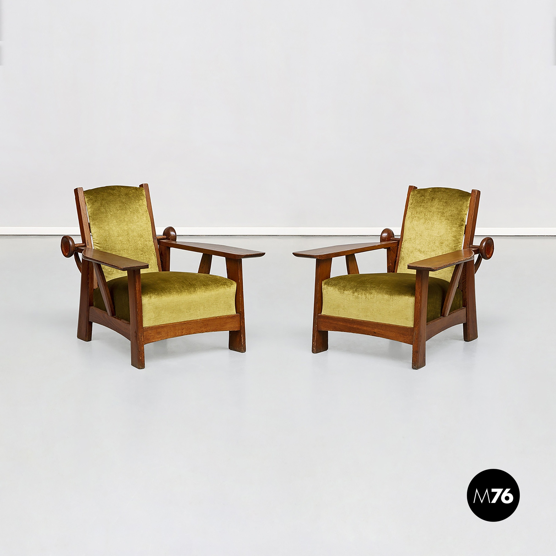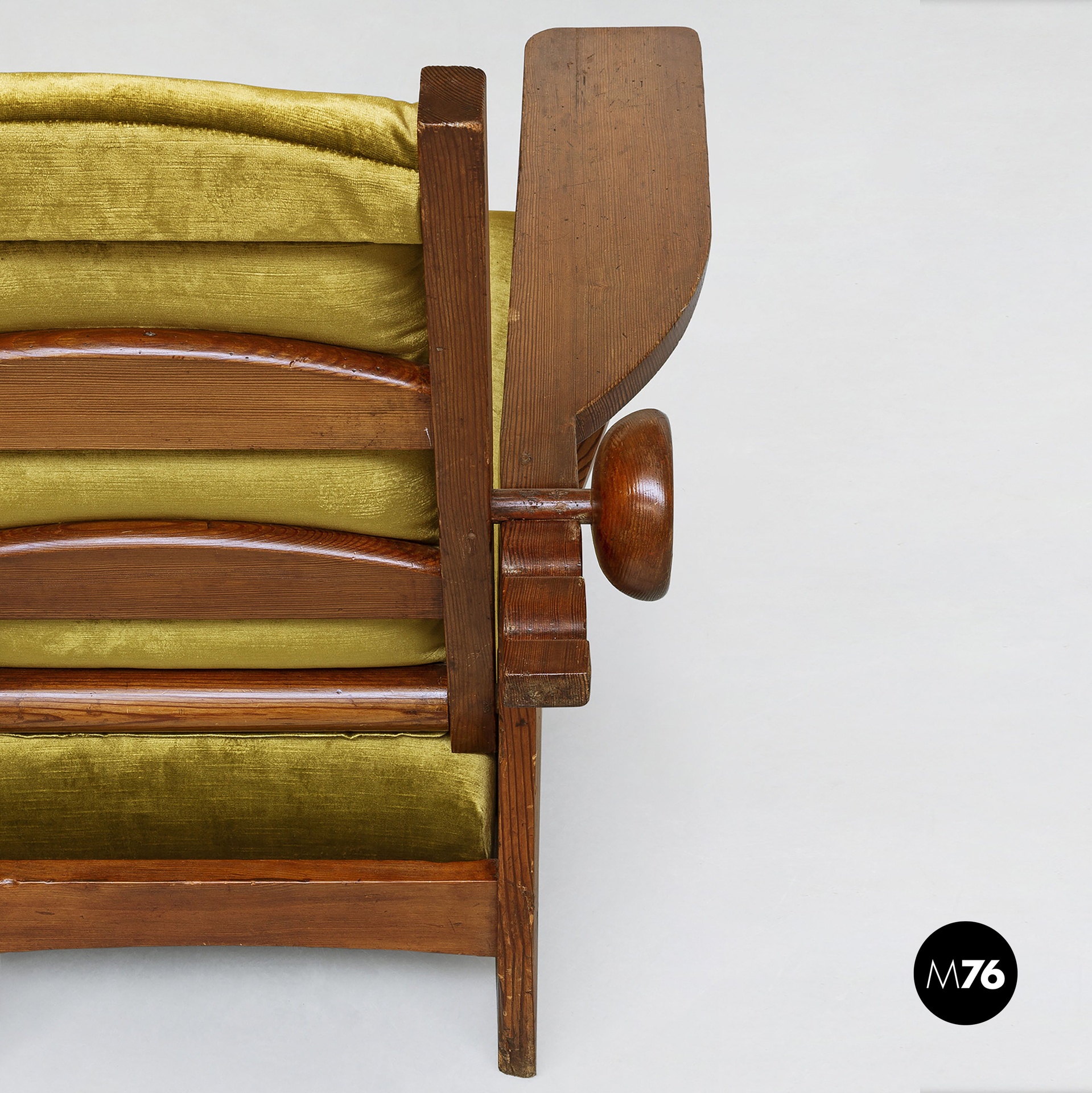 Coppia di poltrone uniche con struttura in legno massello e seduta rettangolare in velluto verde brillante schienale rivestito in velluto e regolabile in tre diverse posizioni grazie a due maniglie tornite raggiungendo un’estensione massima di 117 cm. Listelli in legno sullo schienale permettono a traspirazione del velluto.