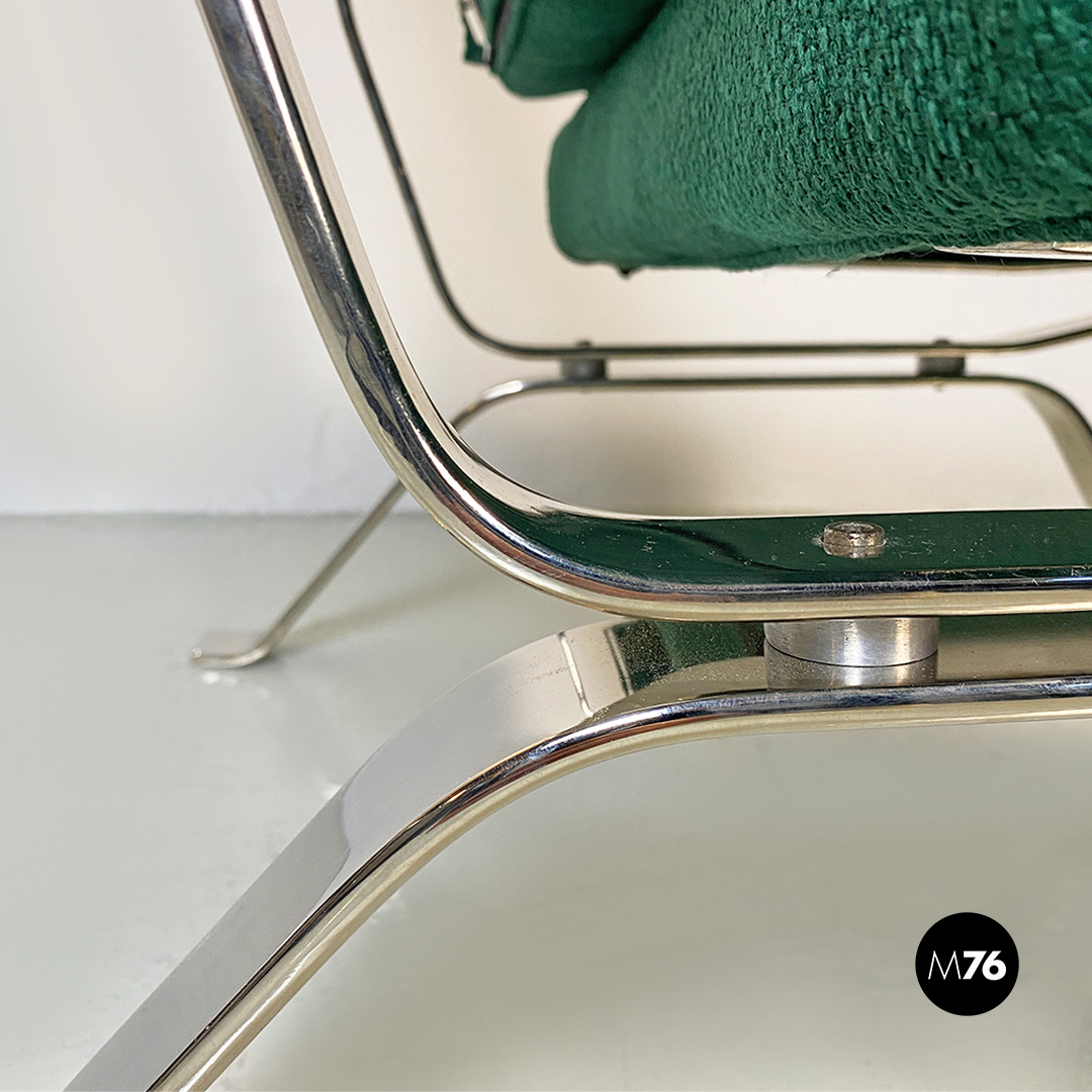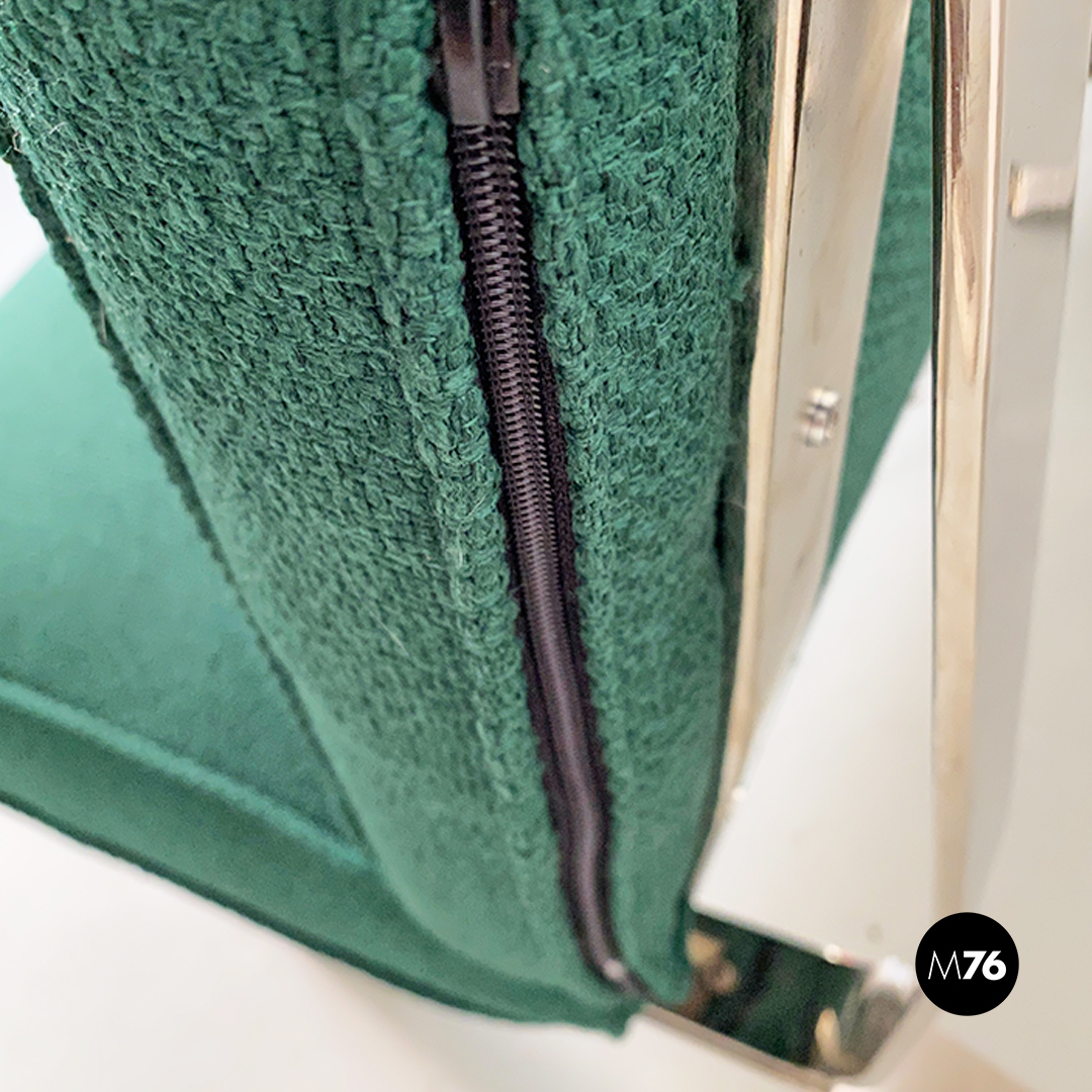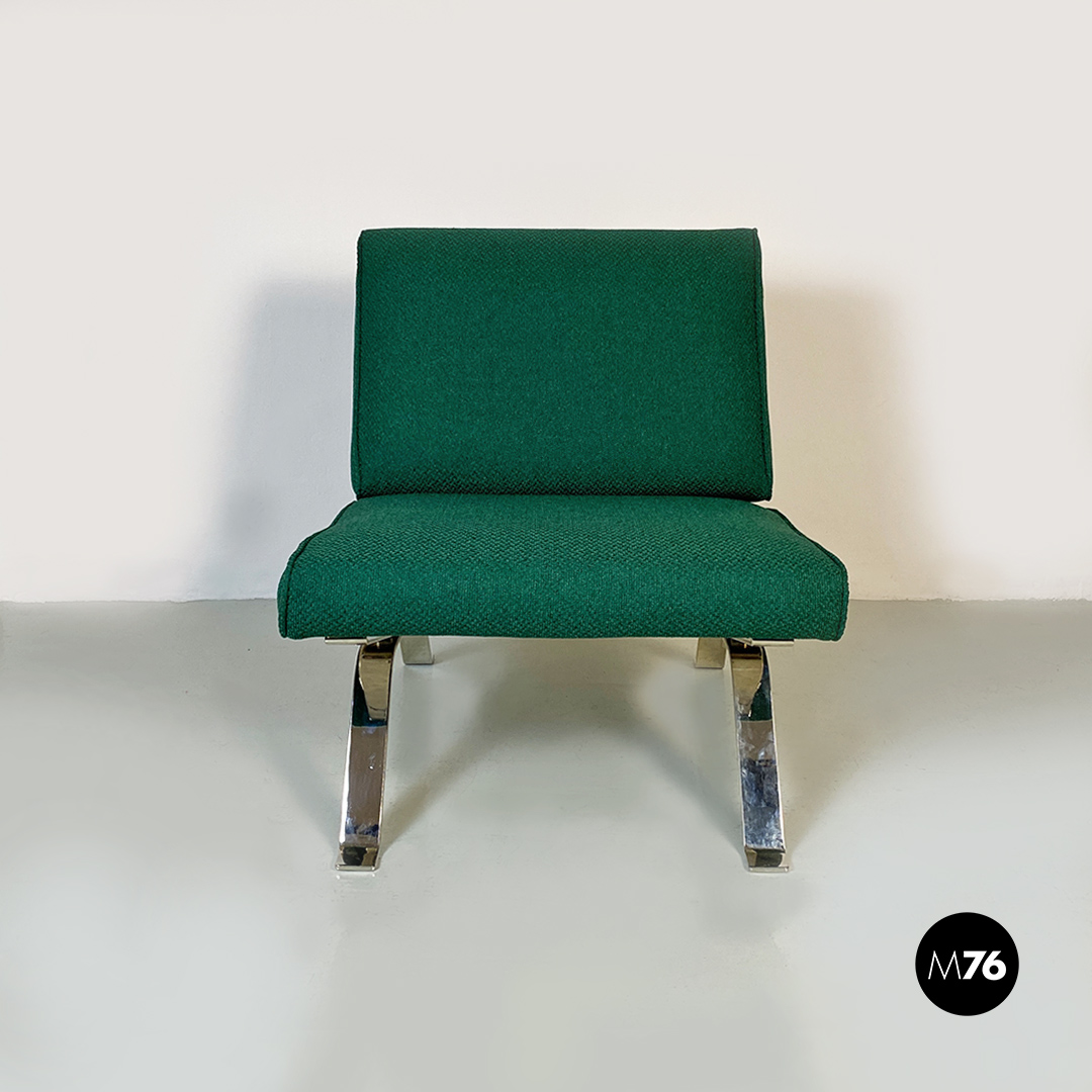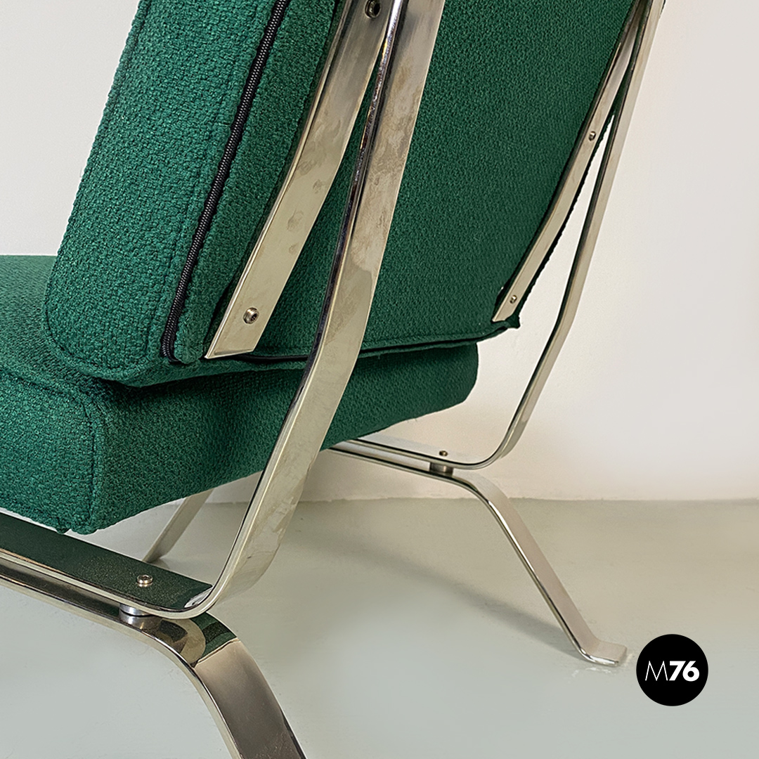 Coppia di poltrone con seduta e schienale imbottiti e rivestiti in cotone verde bosco struttura e zampe in acciaio cromato. Una delle due poltrone mantiene seduta e schienale lievemente sfalsati.