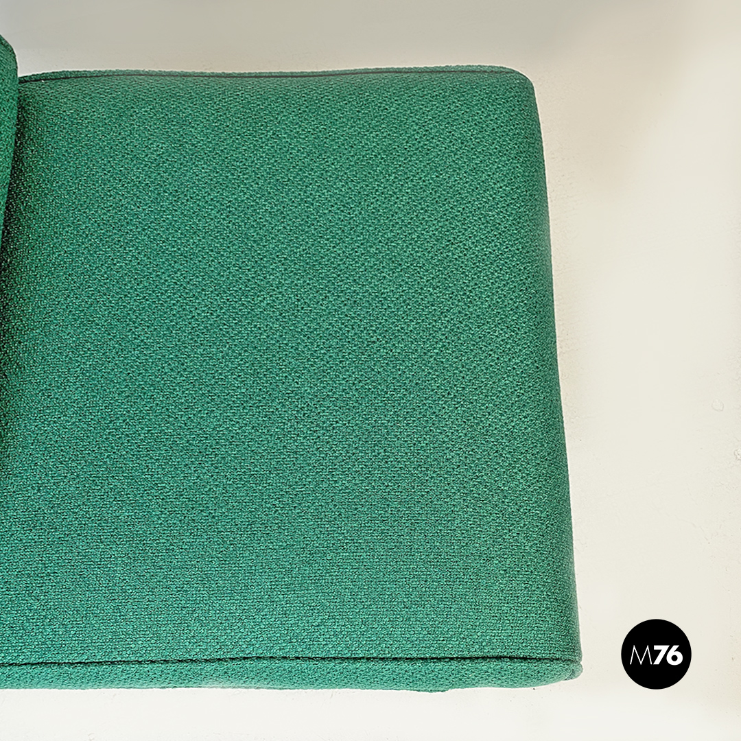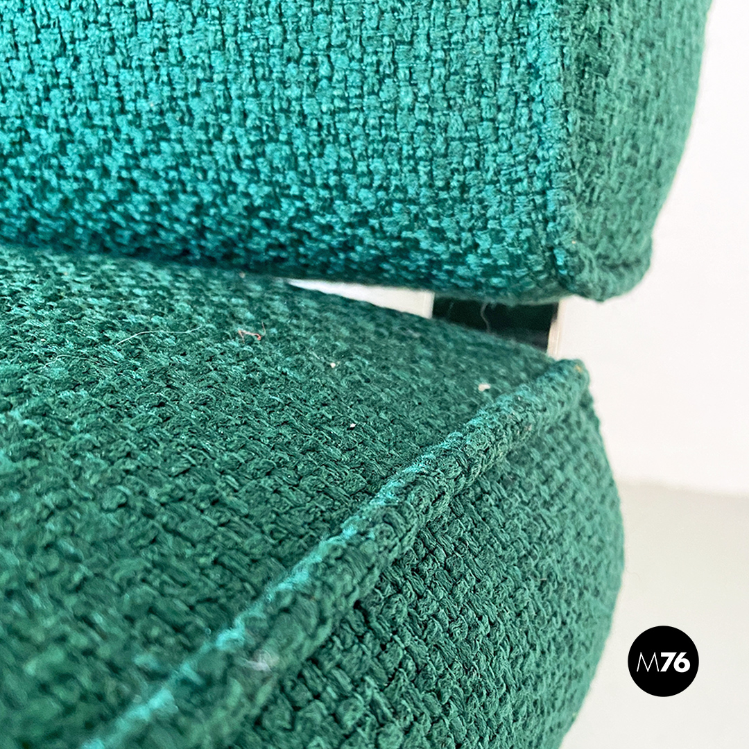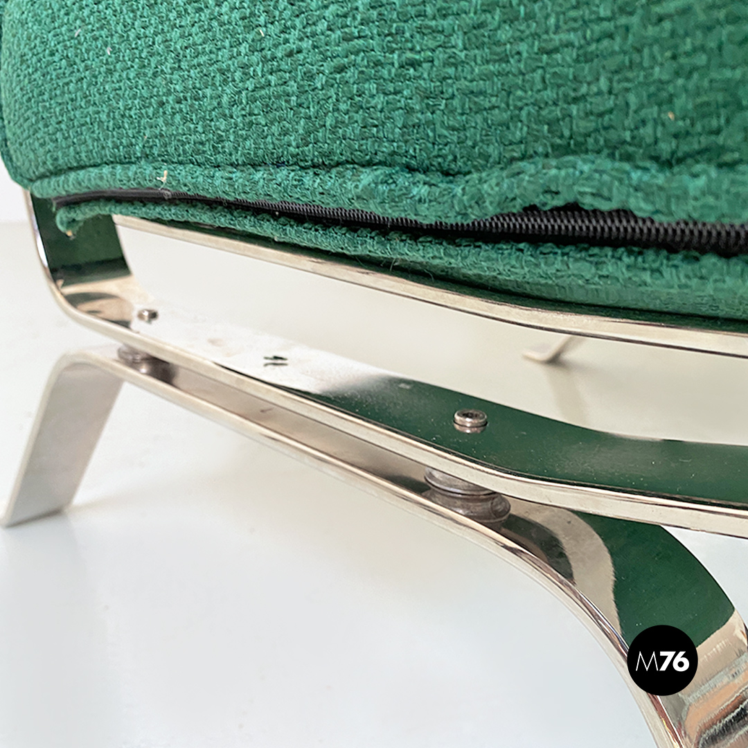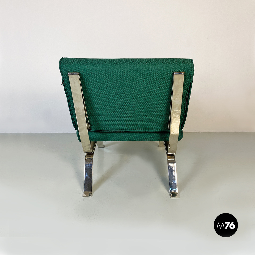 Coppia di poltrone con seduta e schienale imbottiti e rivestiti in cotone verde bosco struttura e zampe in acciaio cromato. Una delle due poltrone mantiene seduta e schienale lievemente sfalsati.