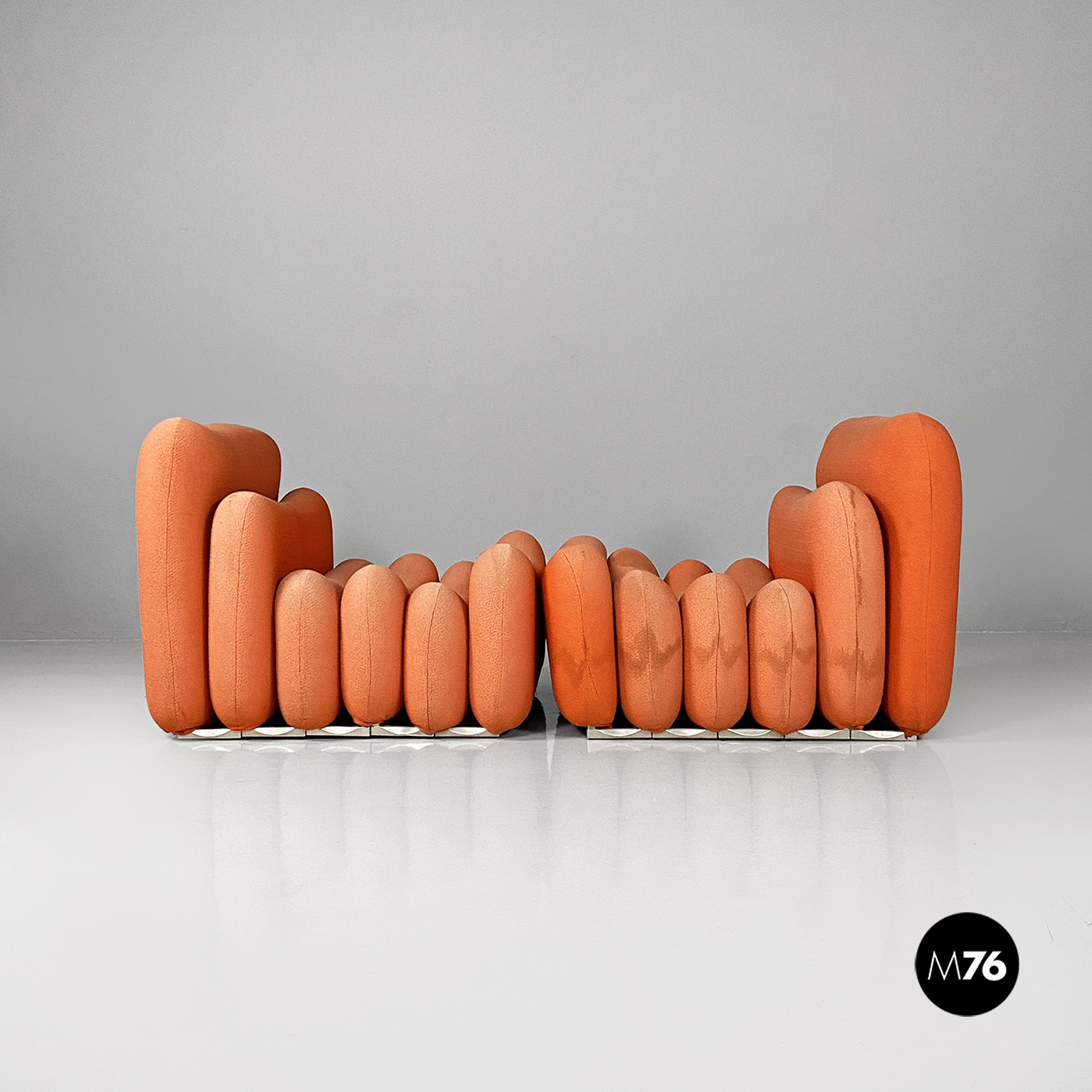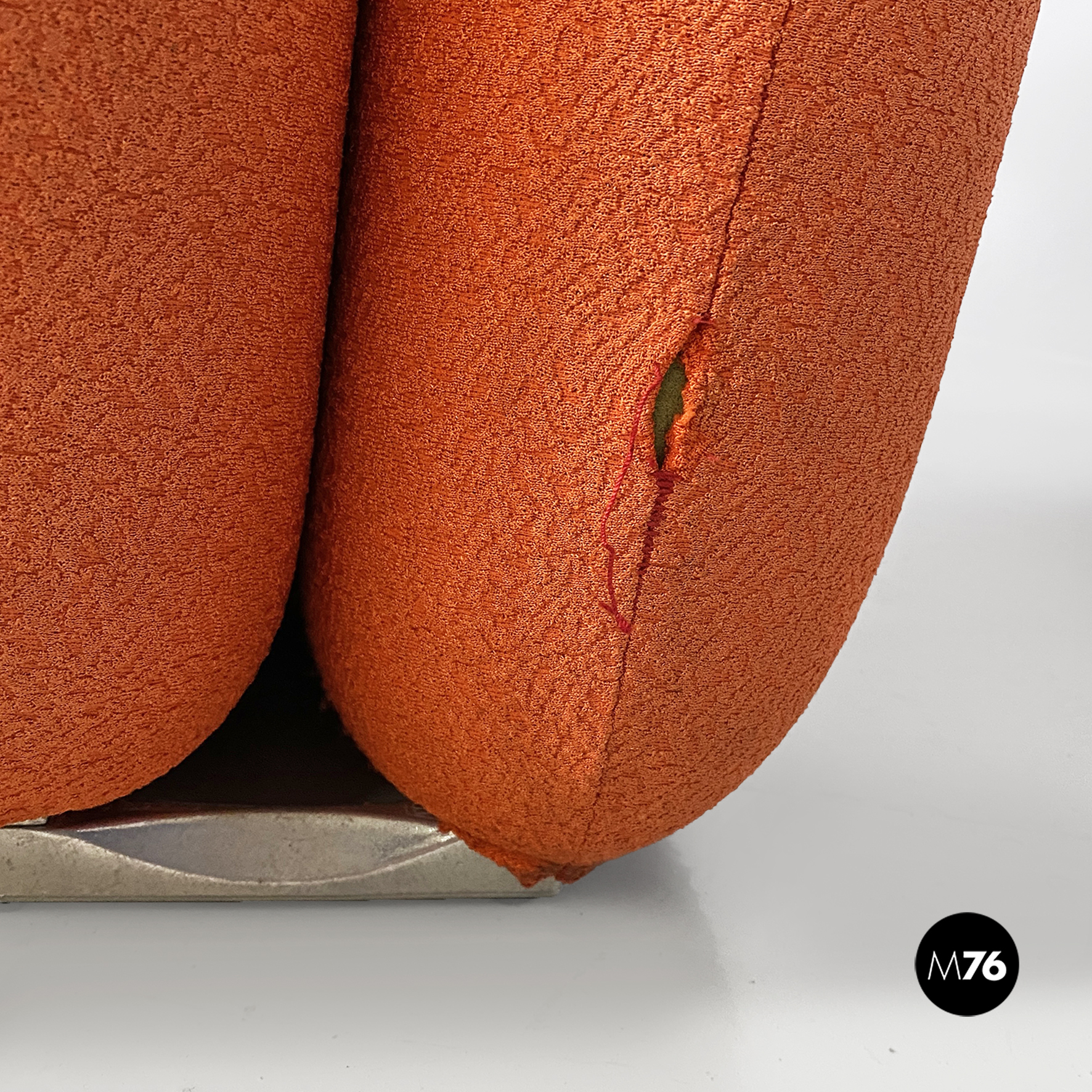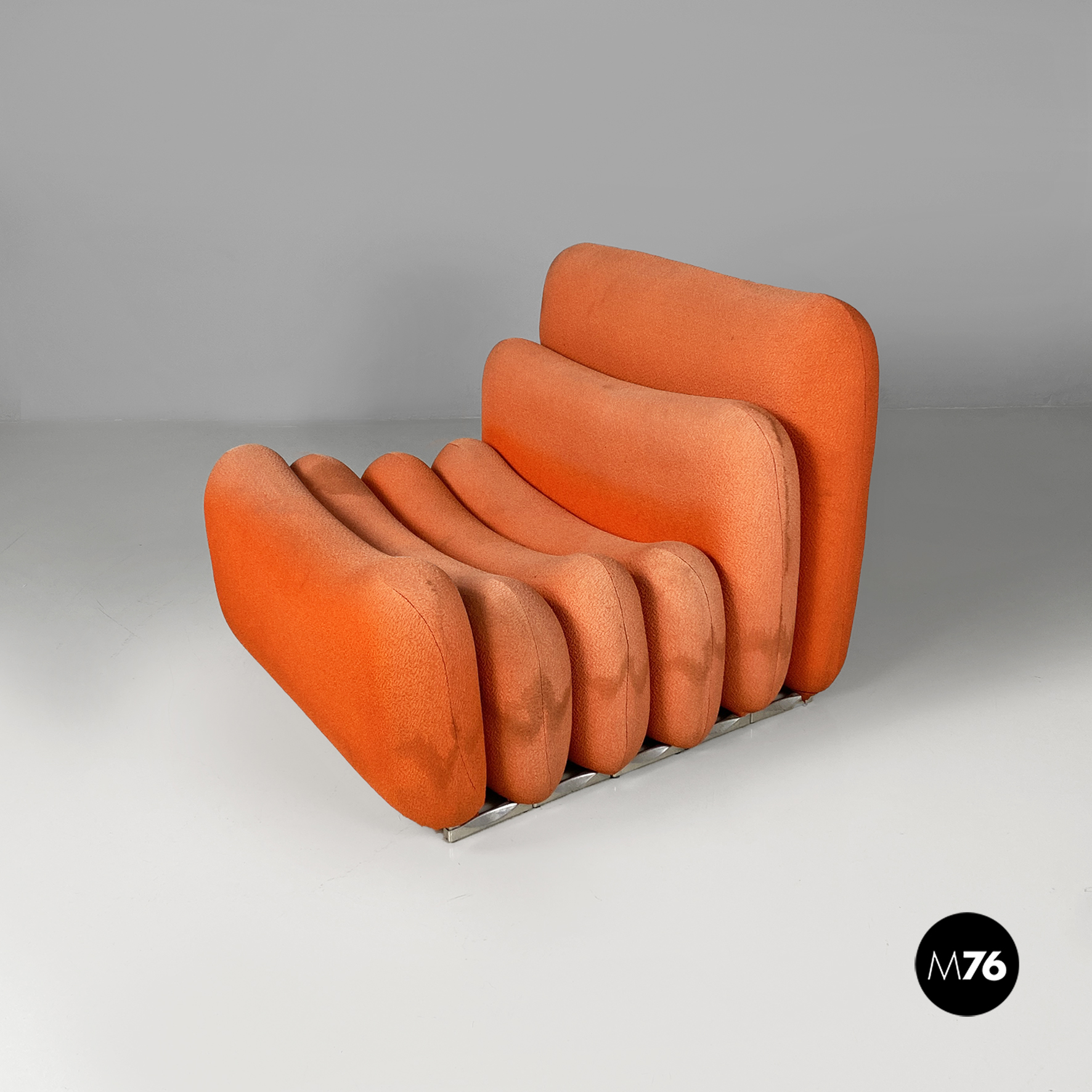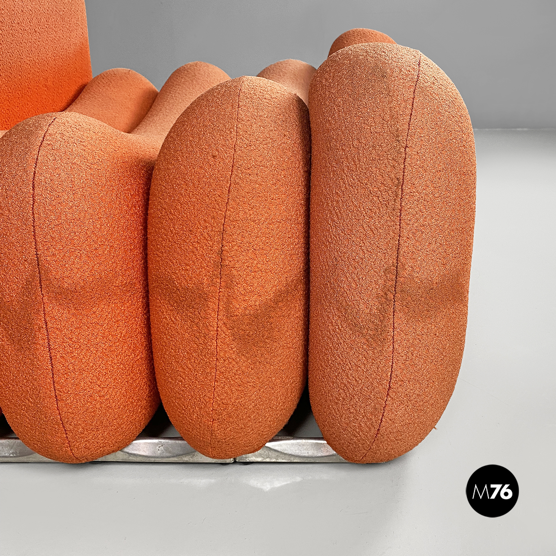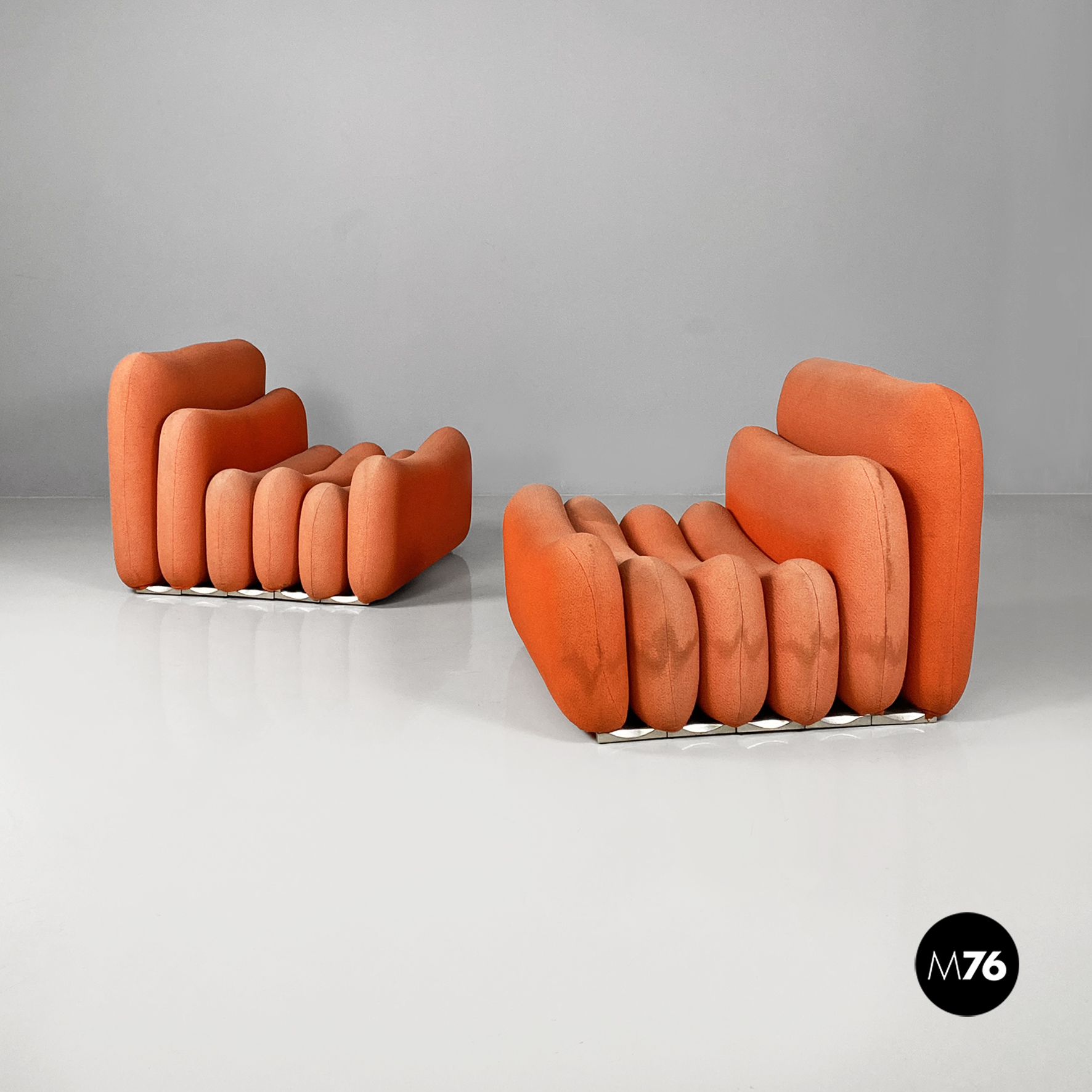 Coppia di poltrone composta da moduli rettangolari dai bordi arrotondati di diverse dimensioni affiancati l’uno all’altro. Questi sono imbottiti e rivestiti in tessuto color arancio/rosa salmone. La struttura modulare è in alluminio. Utilizzabili anche come divano a due posti.