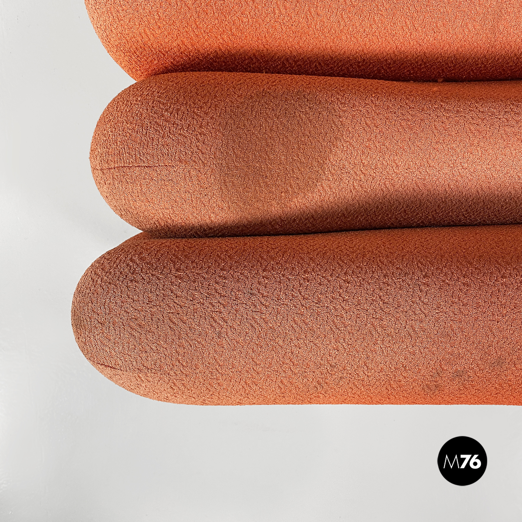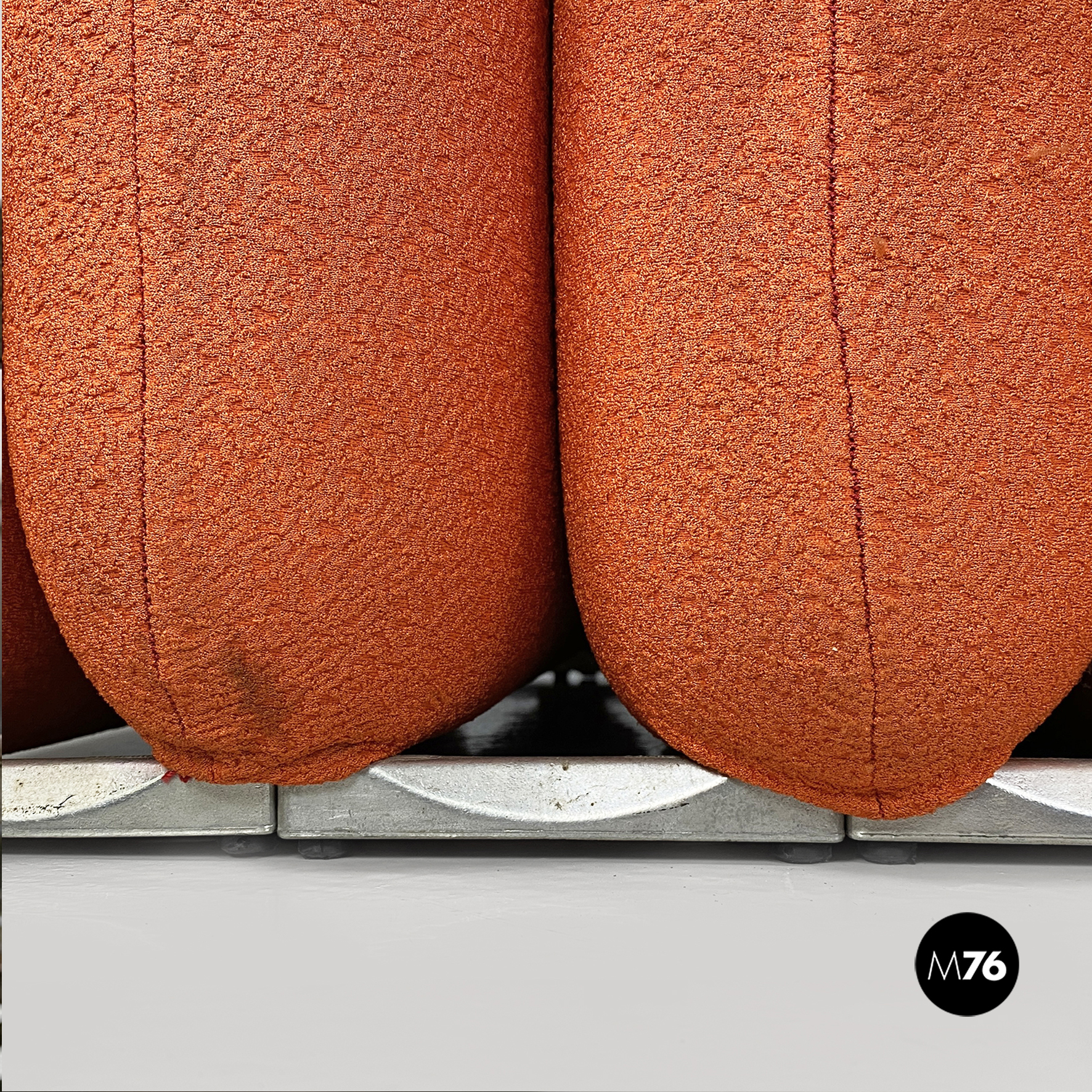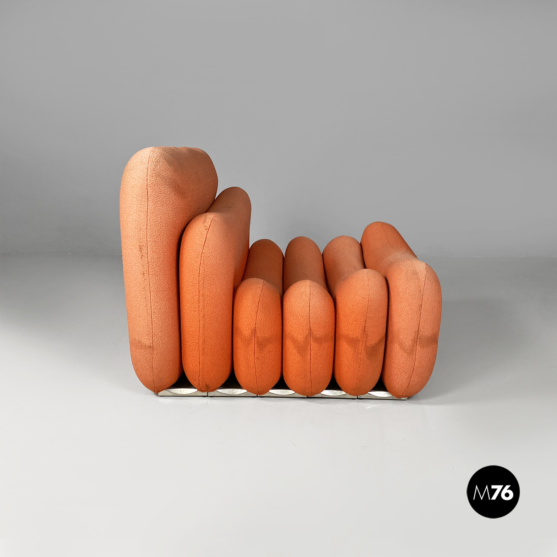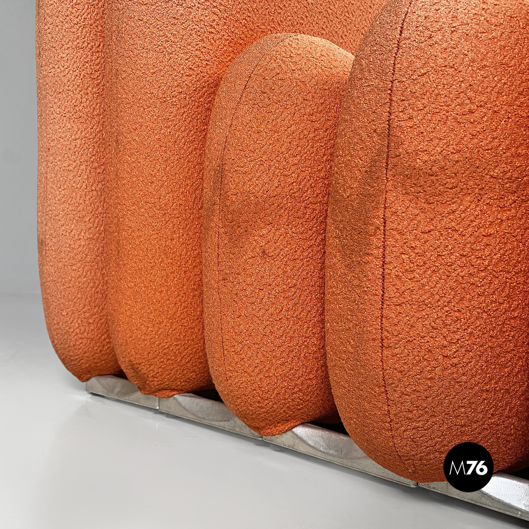 Coppia di poltrone composta da moduli rettangolari dai bordi arrotondati di diverse dimensioni affiancati l’uno all’altro. Questi sono imbottiti e rivestiti in tessuto color arancio/rosa salmone. La struttura modulare è in alluminio. Utilizzabili anche come divano a due posti.