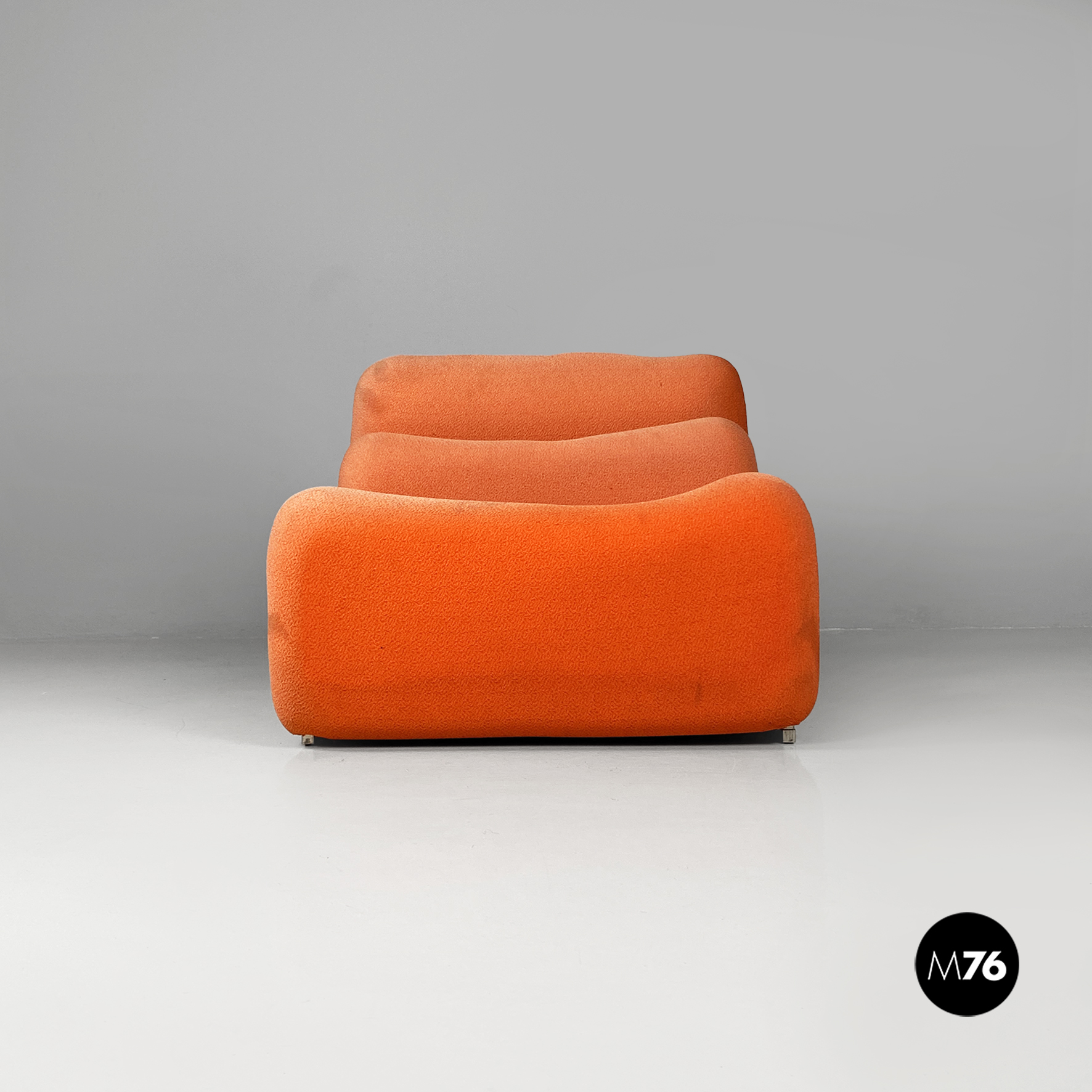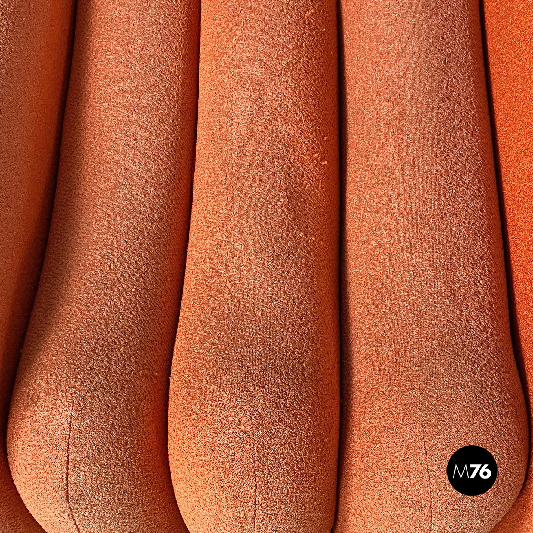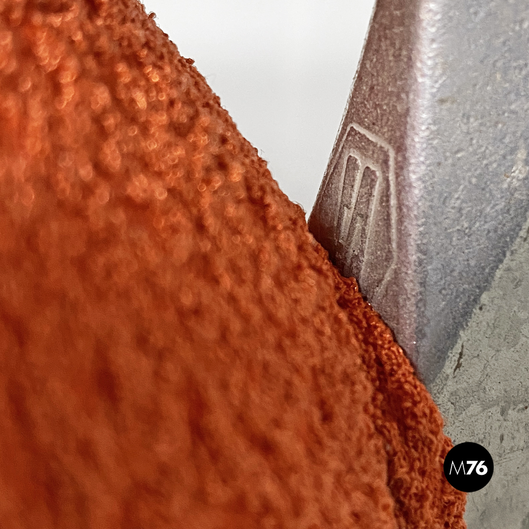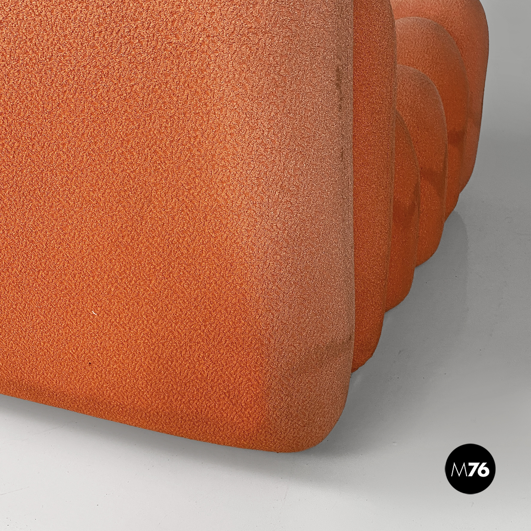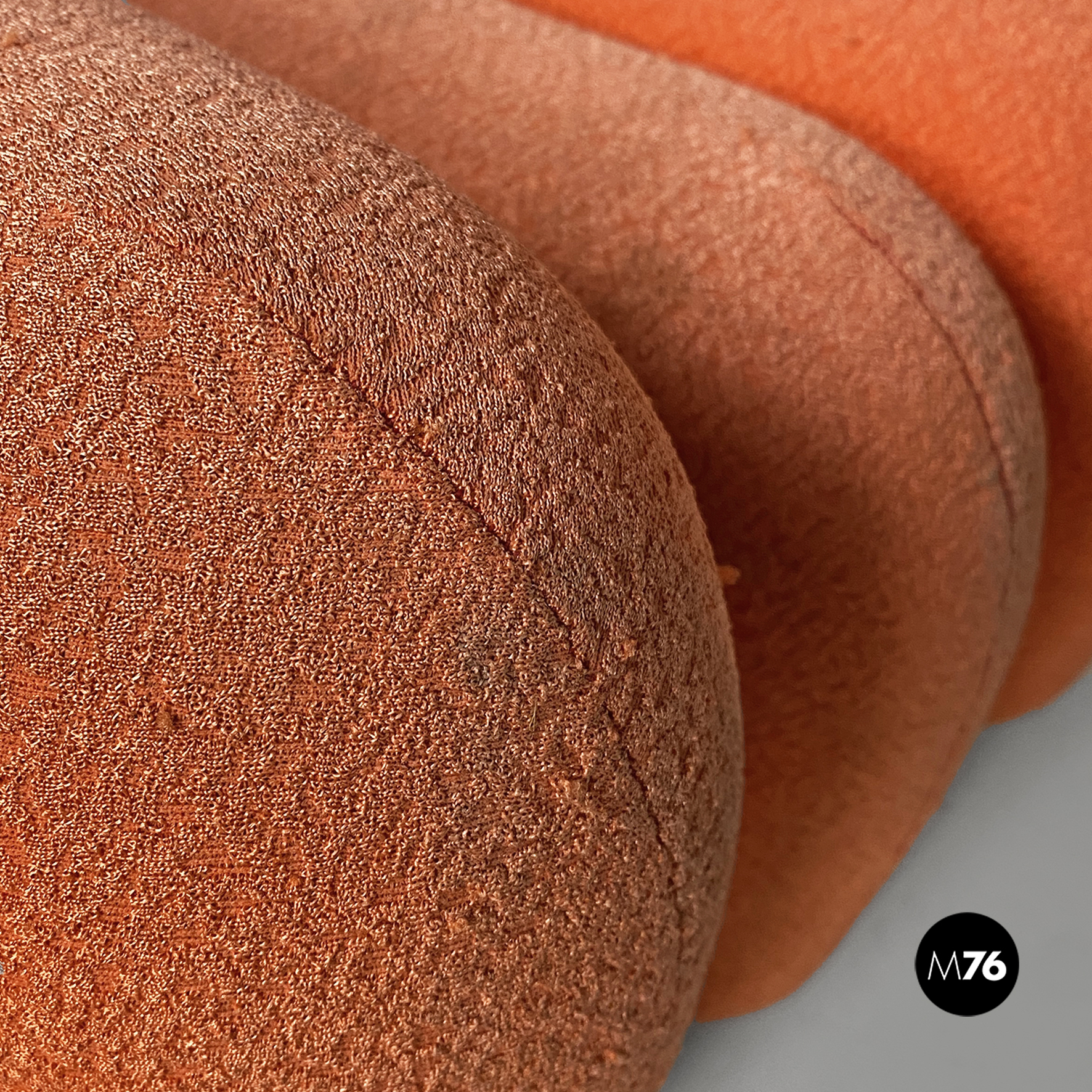 Coppia di poltrone composta da moduli rettangolari dai bordi arrotondati di diverse dimensioni affiancati l’uno all’altro. Questi sono imbottiti e rivestiti in tessuto color arancio/rosa salmone. La struttura modulare è in alluminio. Utilizzabili anche come divano a due posti.