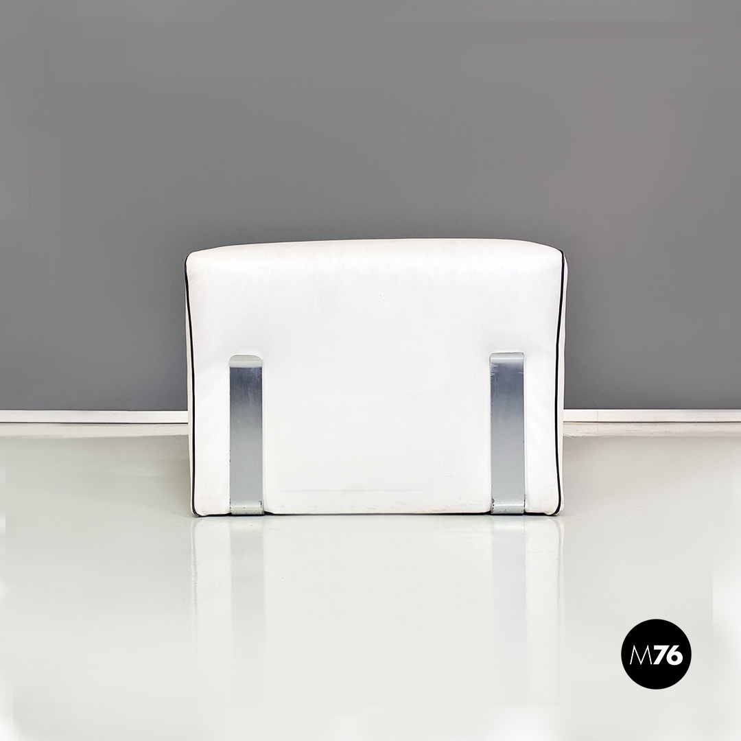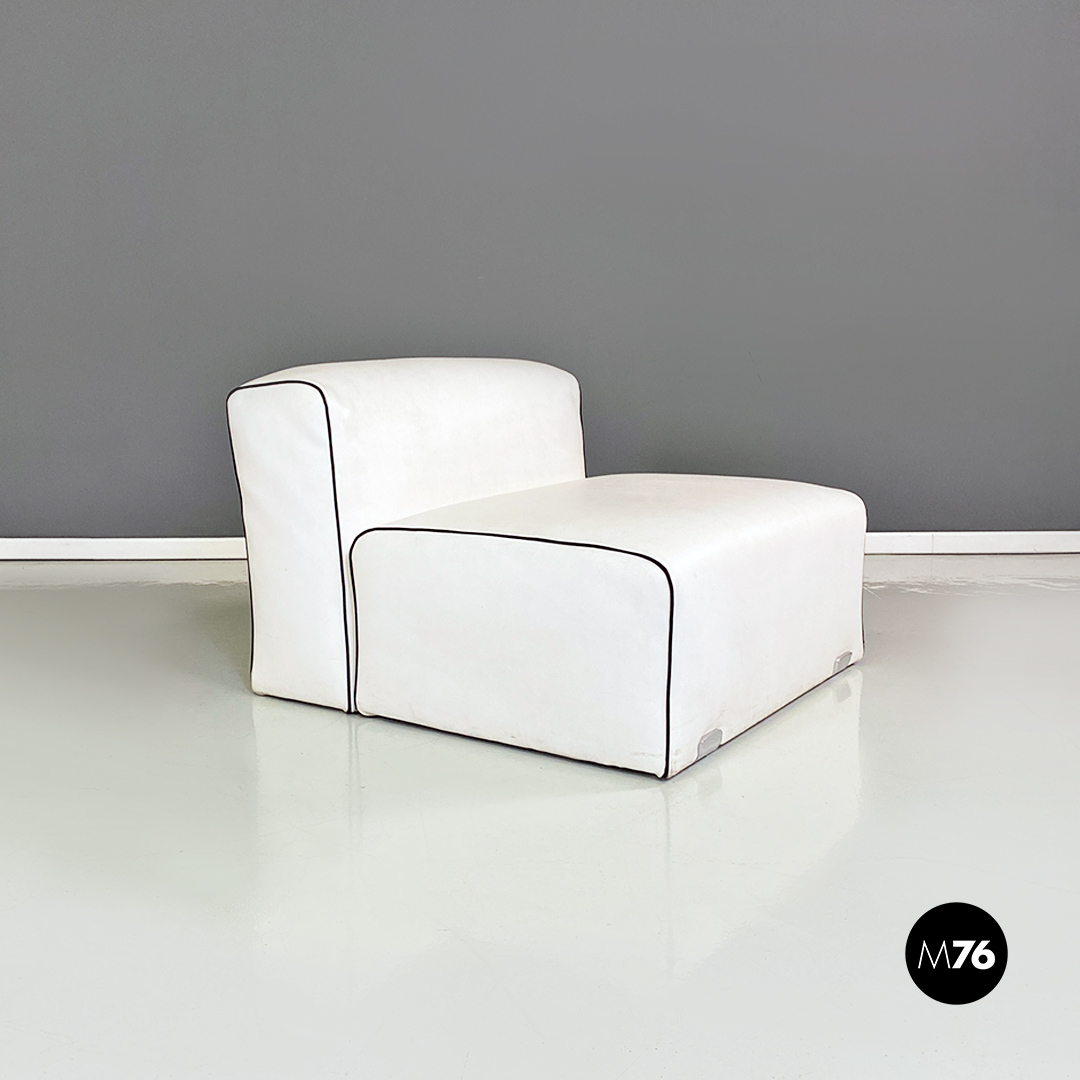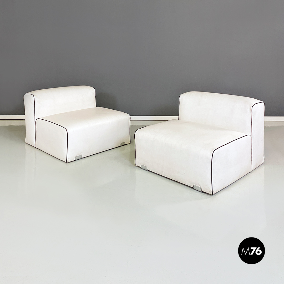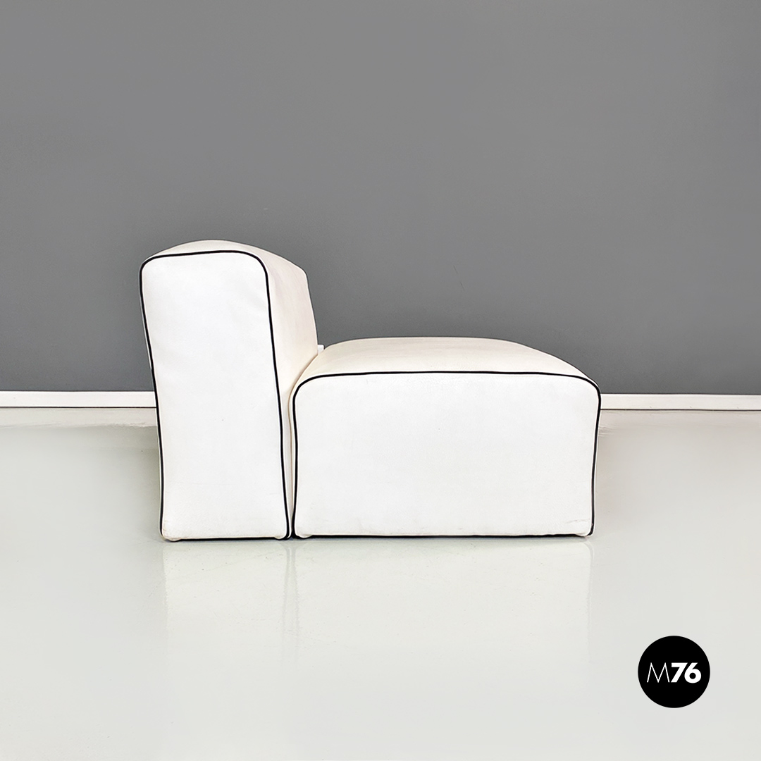 Coppia di poltrone in pelle bianca con cordino nero sul profilo con dettagli in acciaio satinato. Insieme compongono un divanetto due posti grazie anche al loro peso che le rende molto stabili.