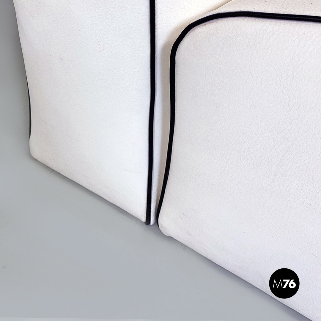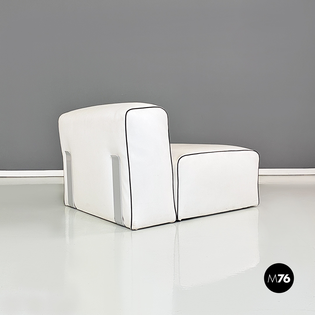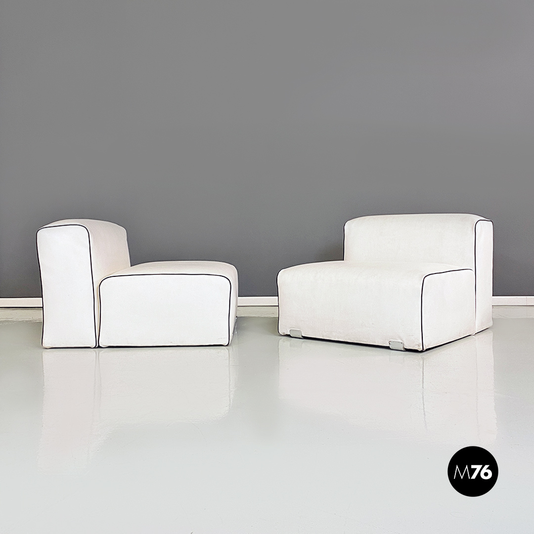 Coppia di poltrone in pelle bianca con cordino nero sul profilo con dettagli in acciaio satinato. Insieme compongono un divanetto due posti grazie anche al loro peso che le rende molto stabili.
