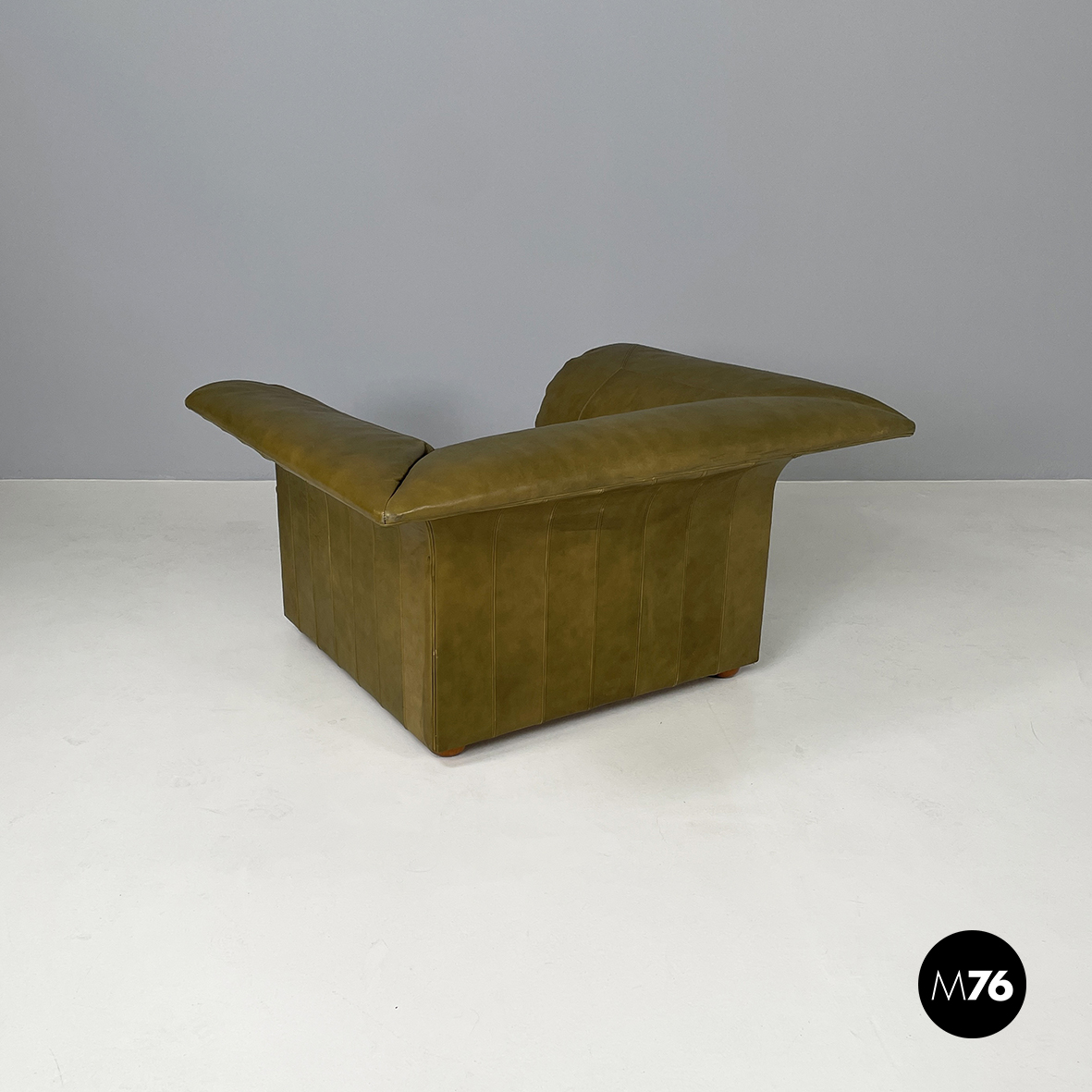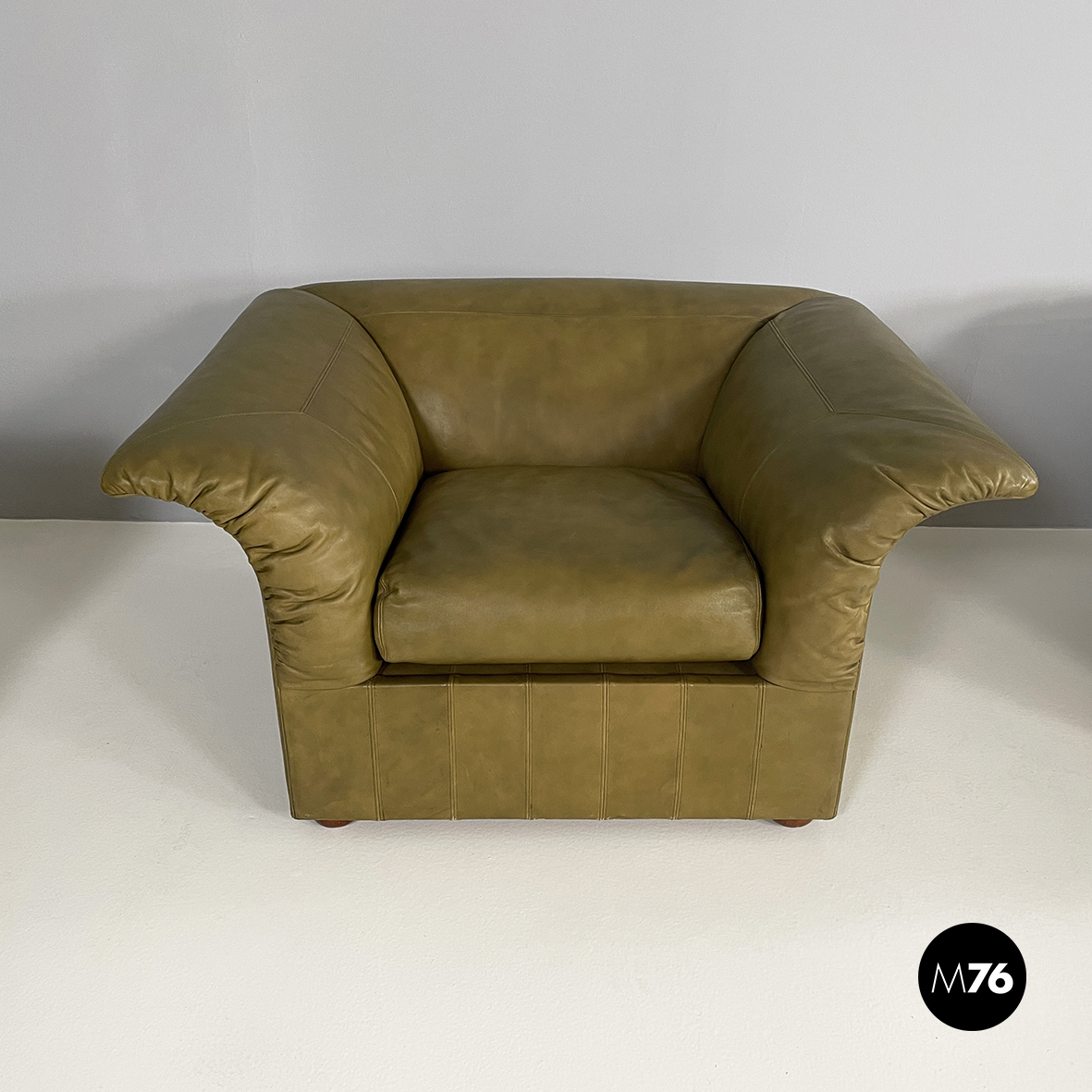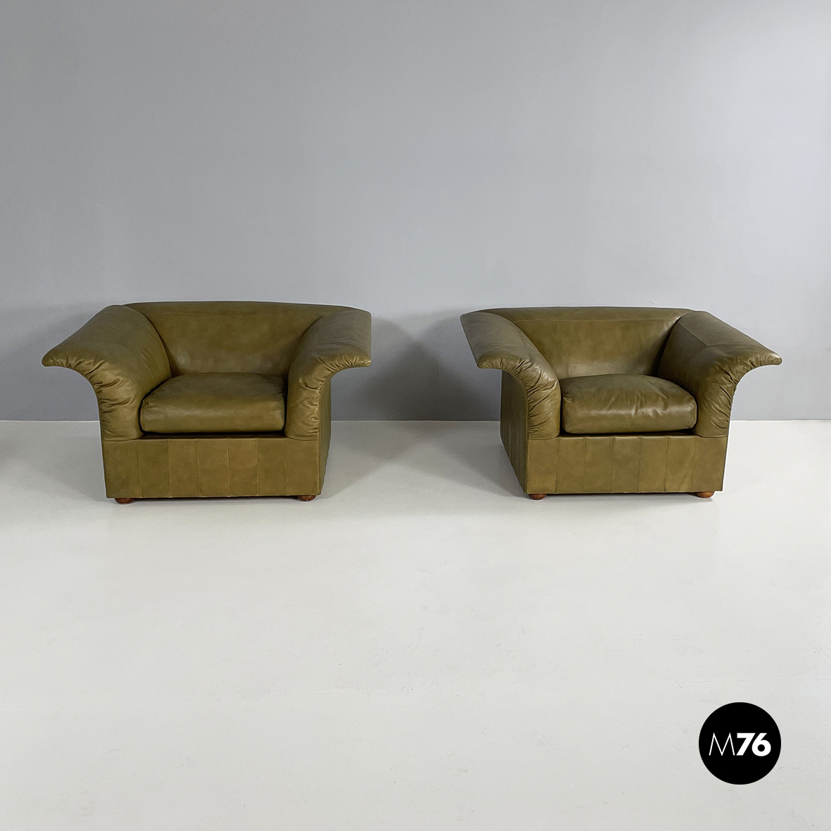 Coppia di poltrone interamente imbottite e rivestite in pelle verde scuro. La seduta è composta da un cuscino imbottito. Lo schienale e i braccioli a sbalzo presentano rifiniture decorative. I lati della poltrona sono lavorati con strisce di pelle verde. Piedini tondi in legno.