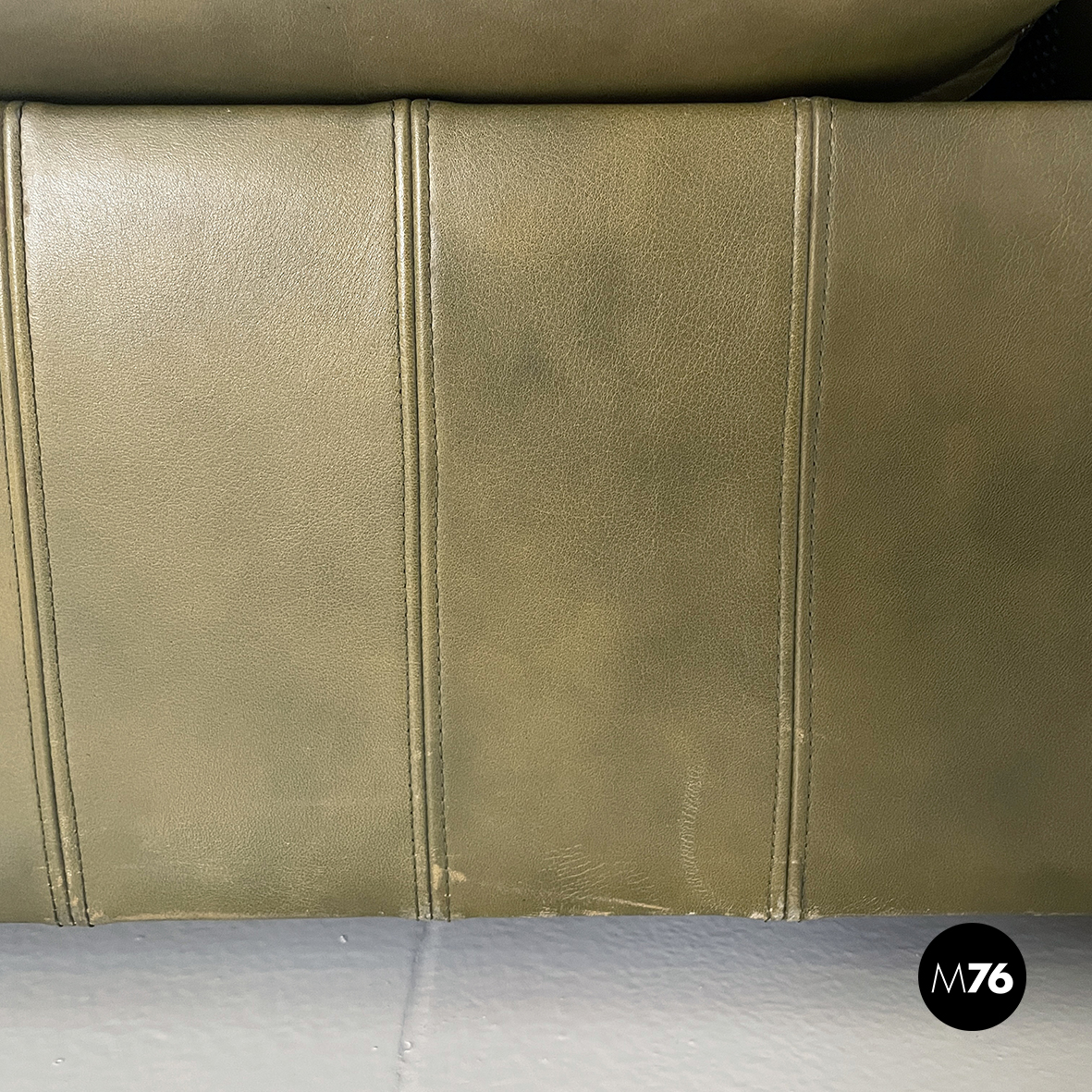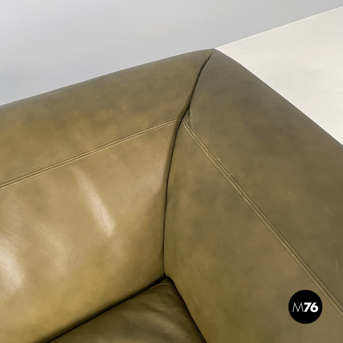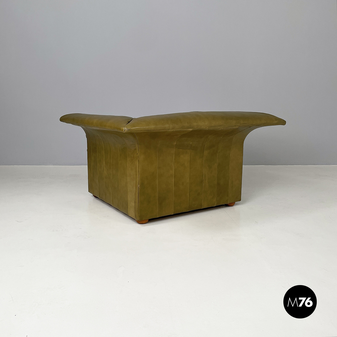 Coppia di poltrone interamente imbottite e rivestite in pelle verde scuro. La seduta è composta da un cuscino imbottito. Lo schienale e i braccioli a sbalzo presentano rifiniture decorative. I lati della poltrona sono lavorati con strisce di pelle verde. Piedini tondi in legno.