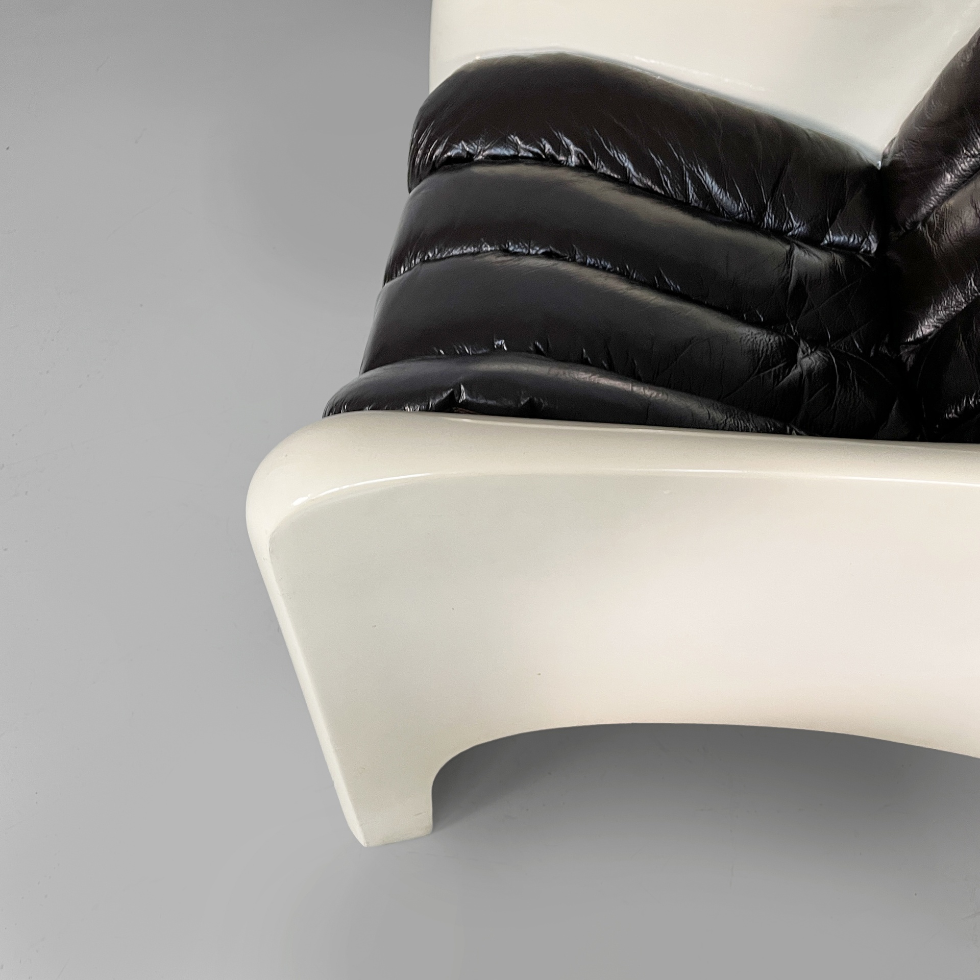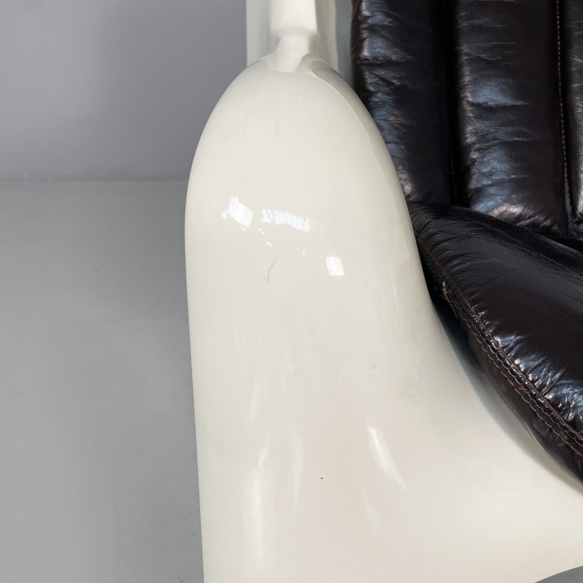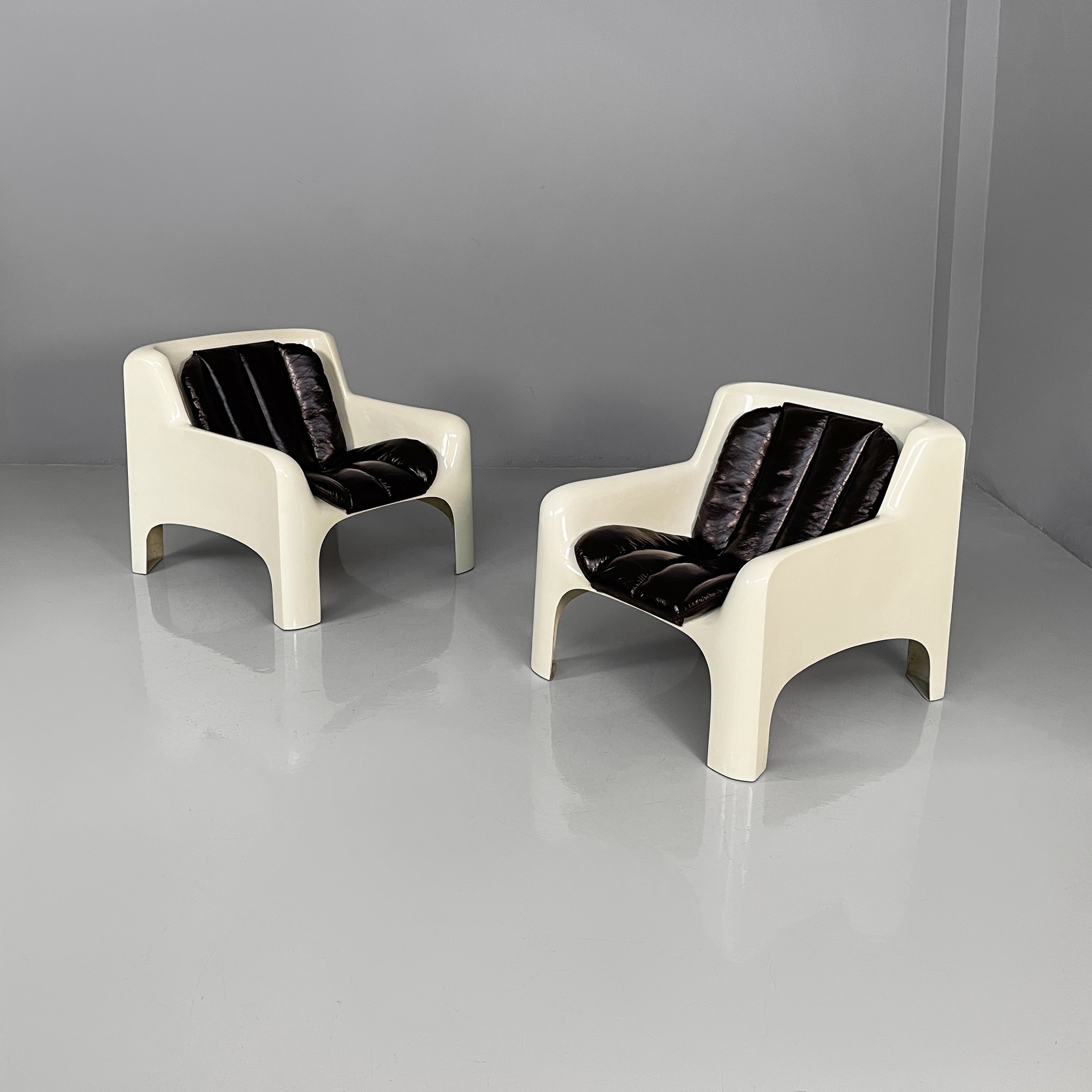 Coppia di poltrone modello Gaia con seduta e schienali imbottiti e rivestiti in pelle marrone scuro tendente al nero. La struttura, i braccioli e le zampe sono in vetroresina bianca. Space Age