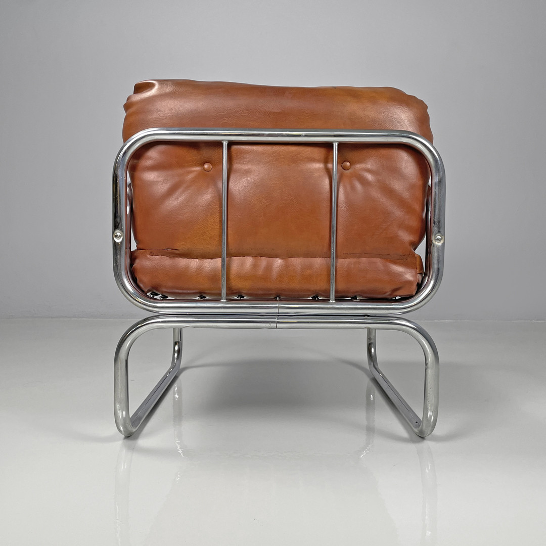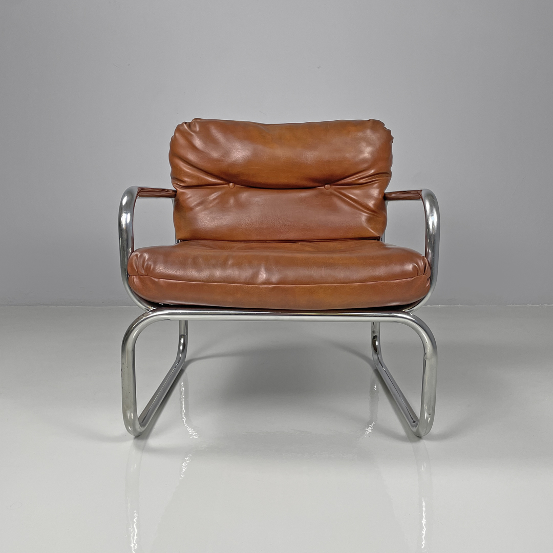 Poltrone in finta pelle marrone e metallo cromato, 1970 ca.