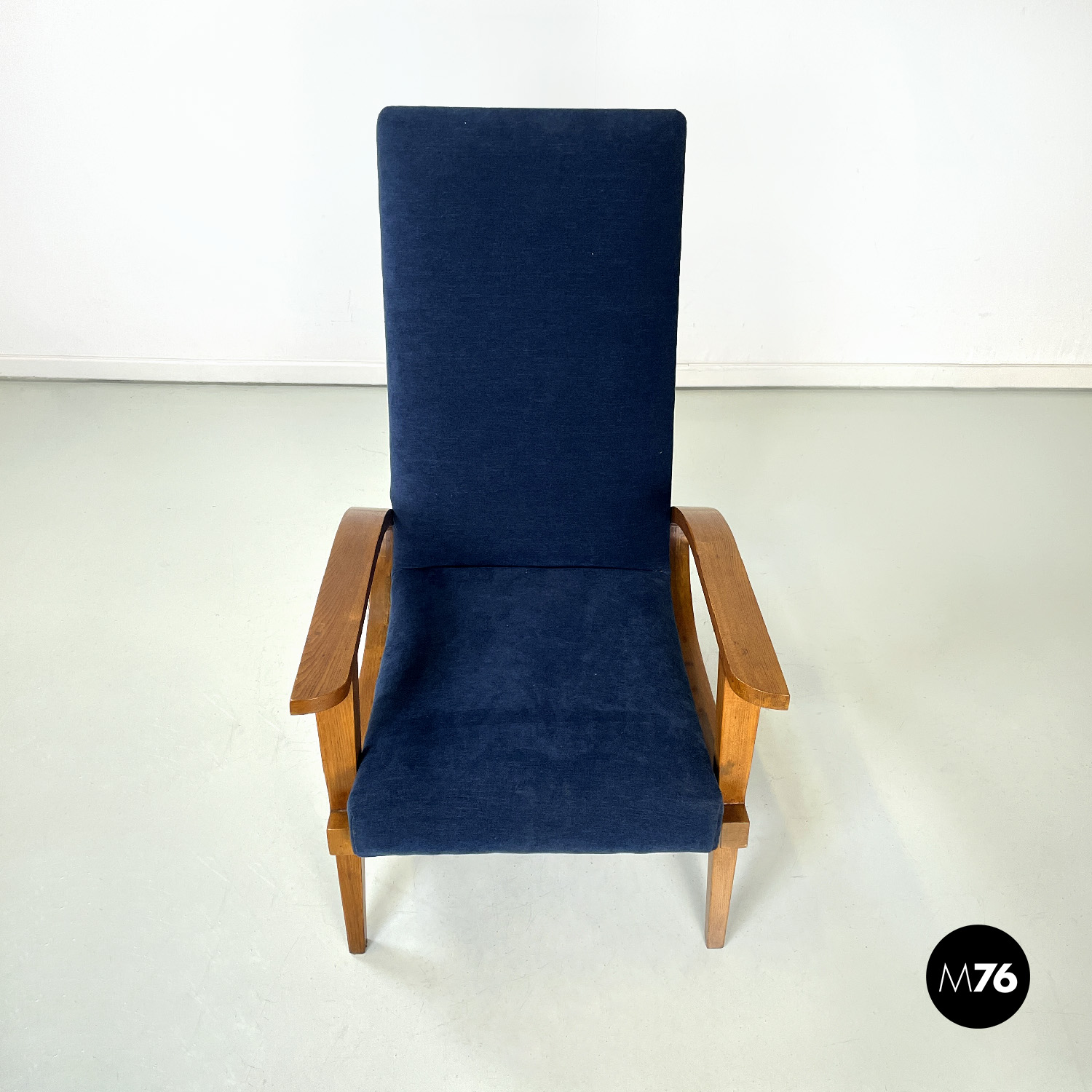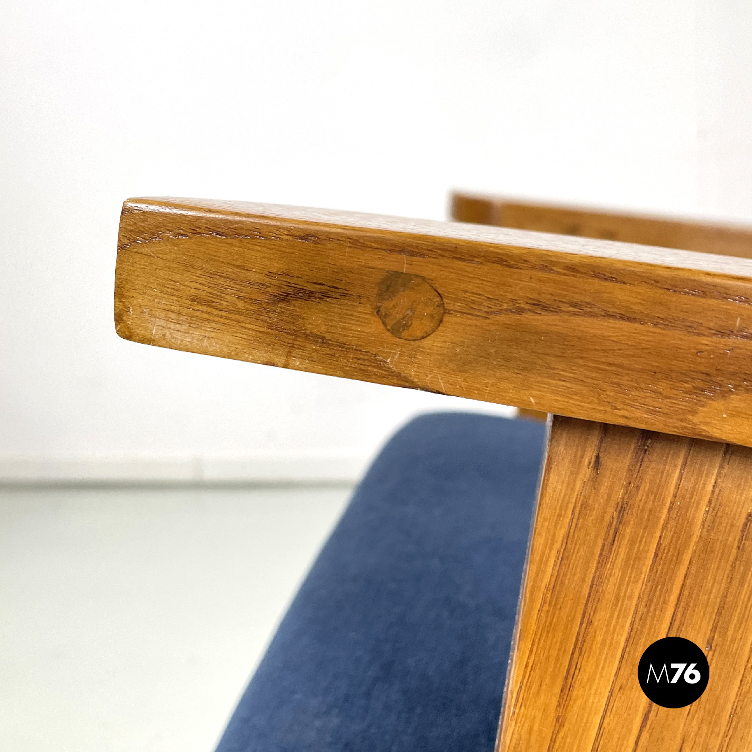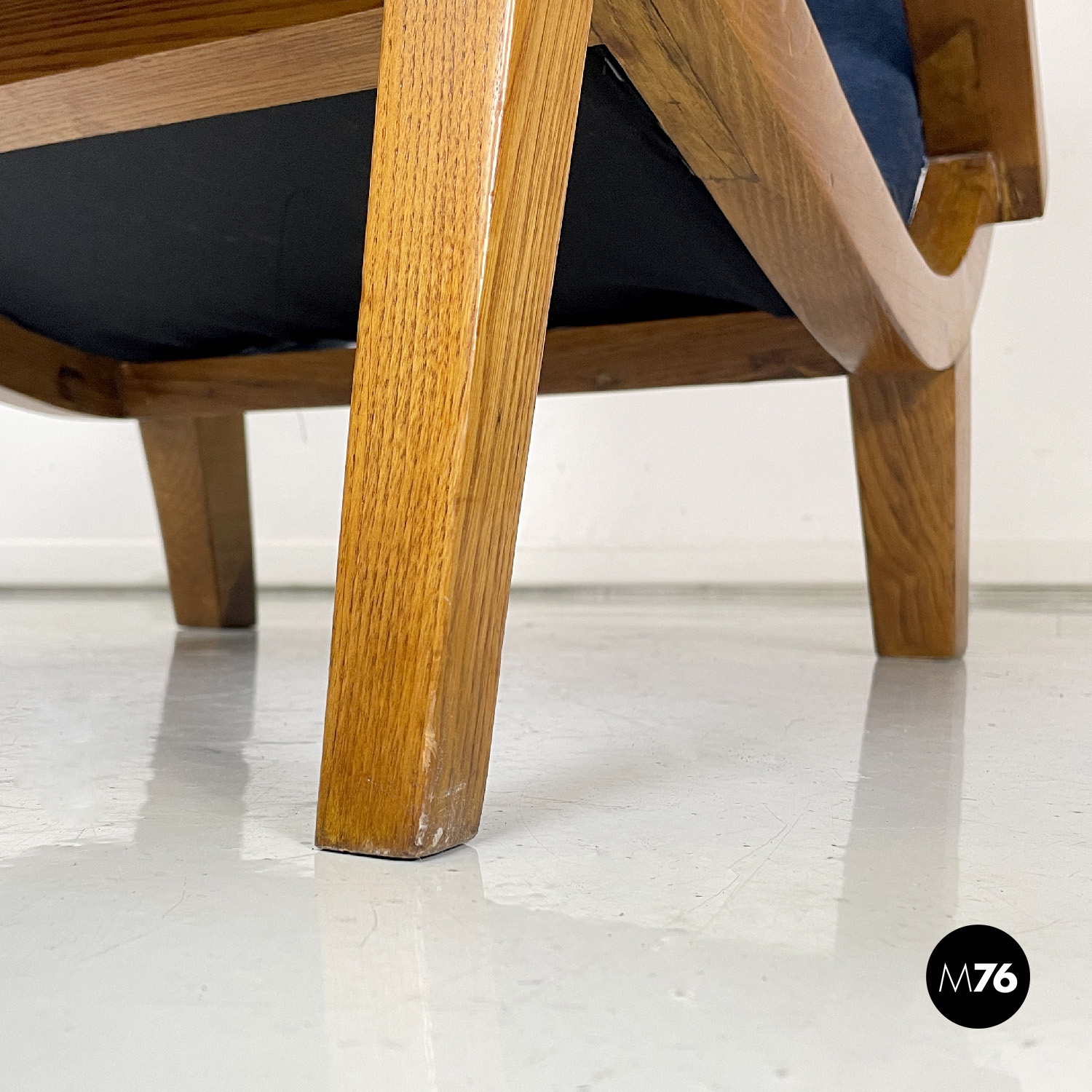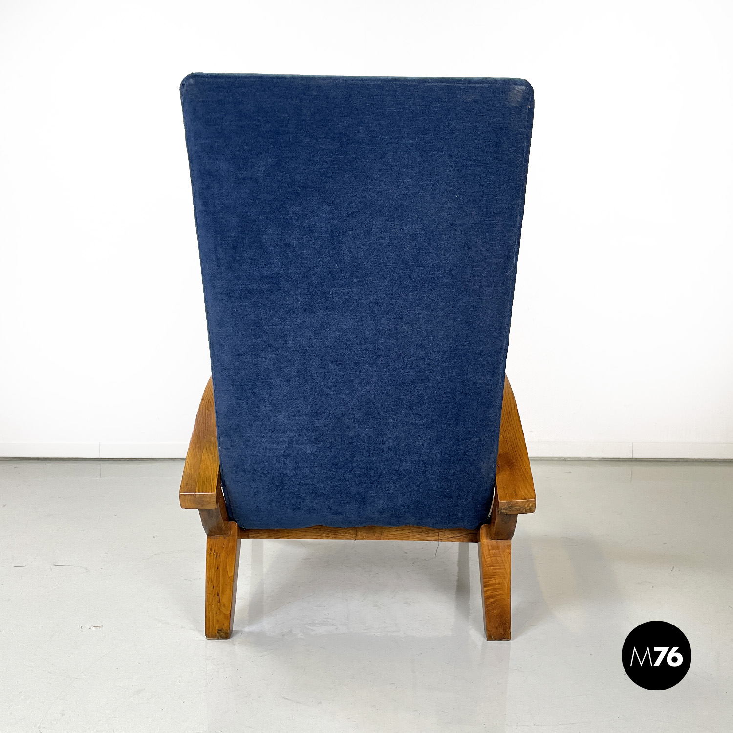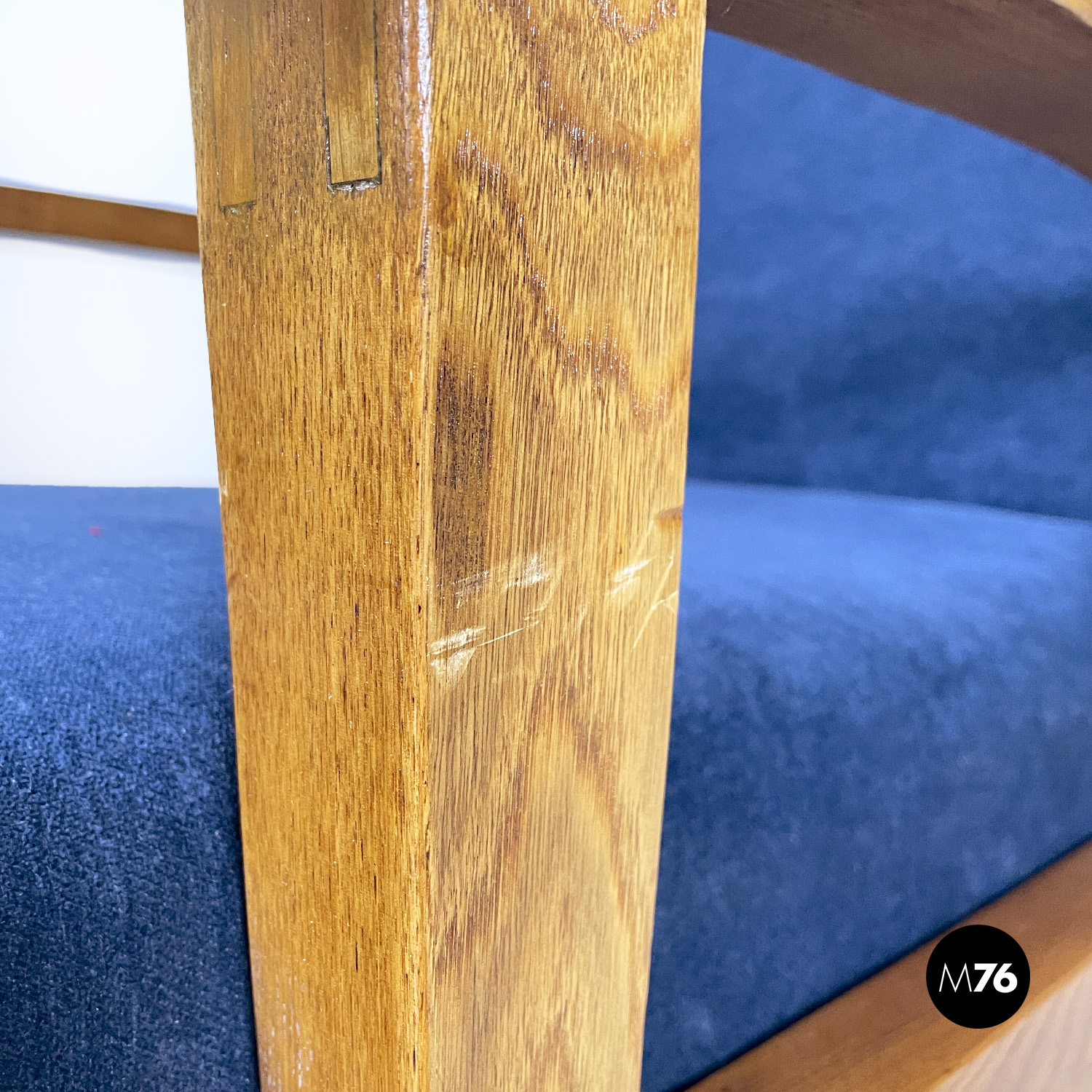 Coppia di poltrone con struttura in legno e tessuto blu profondo. La struttura è a sezione quadrata i braccioli curvano verso lo schienale e si unisce alla struttura della seduta. Le due gambe frontali si stringono verso l’appoggio a terra le due posteriori sono più spesse.