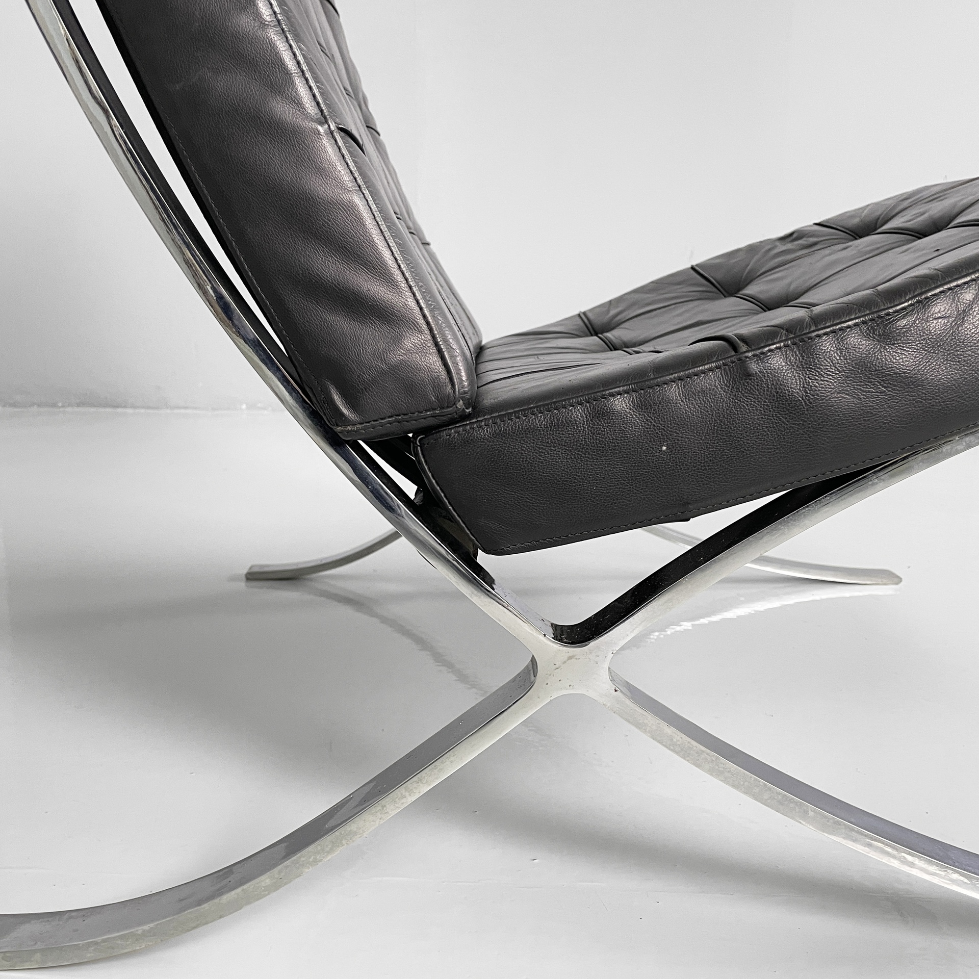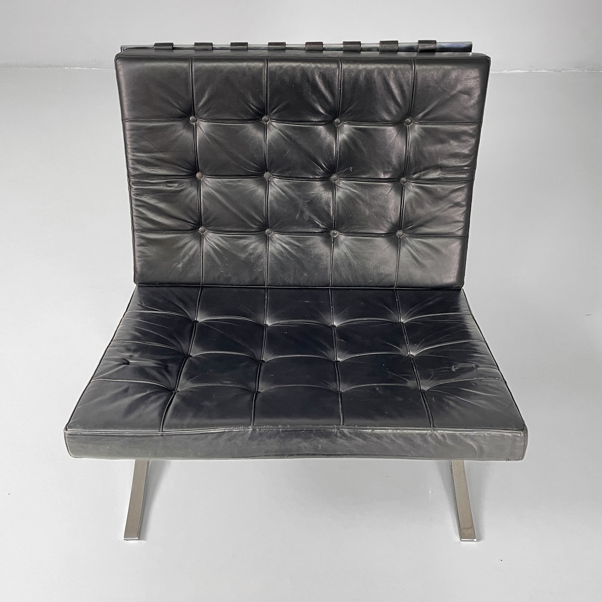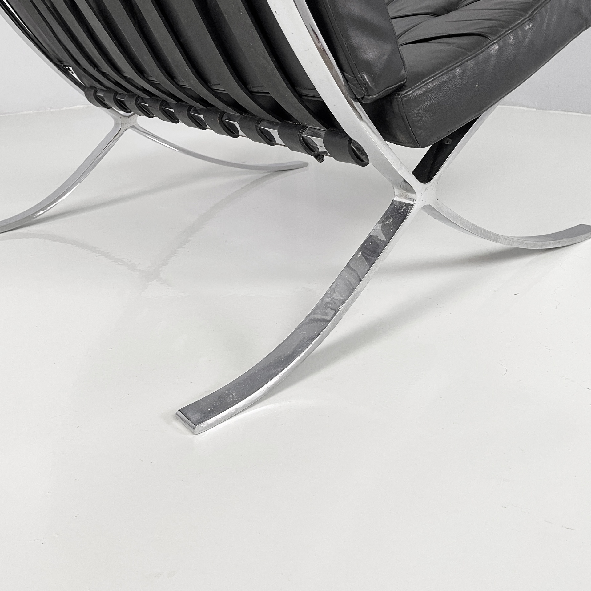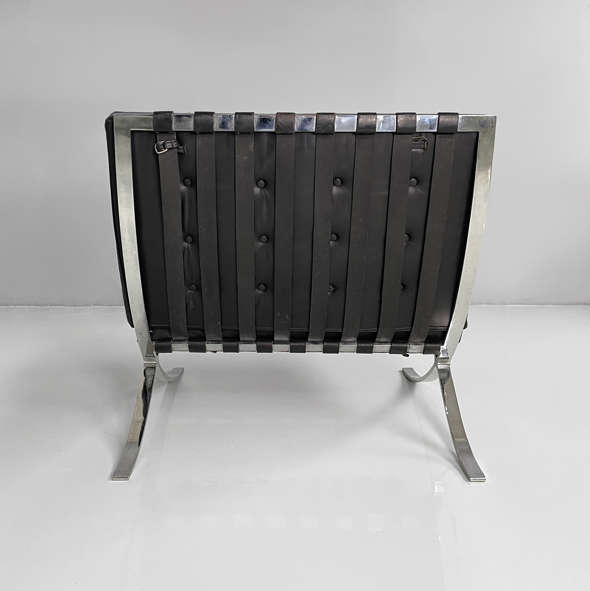 Coppia di poltrone in pelle nera e acciaio. Lo seduta e schienale sono due cuscini squadrati rivestiti in pelle nera con bottoni tondi, i quali sono sostenuti da cinghie in cuoio. La struttura e le zampe ad X sono composte da listelli in acciaio curvato.
