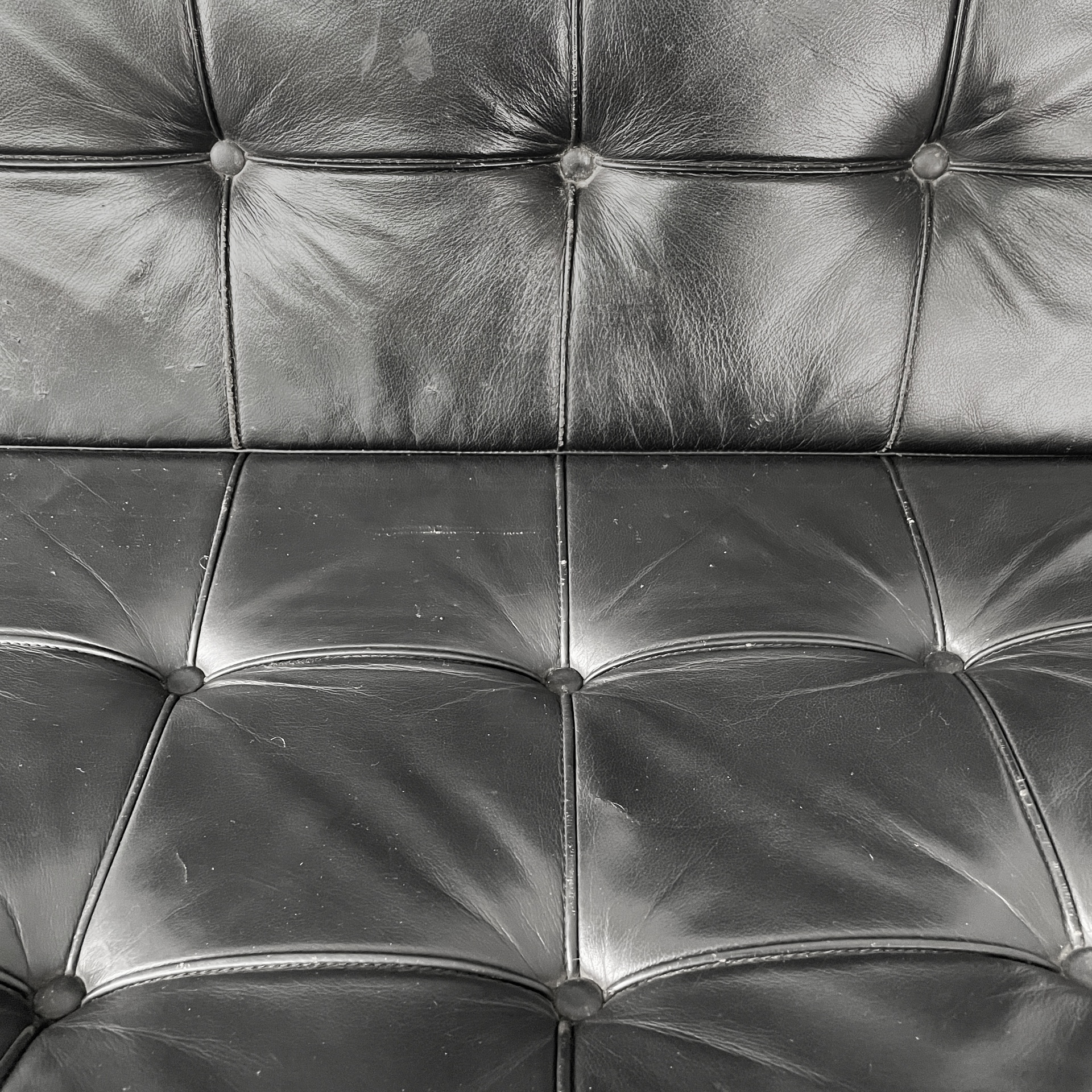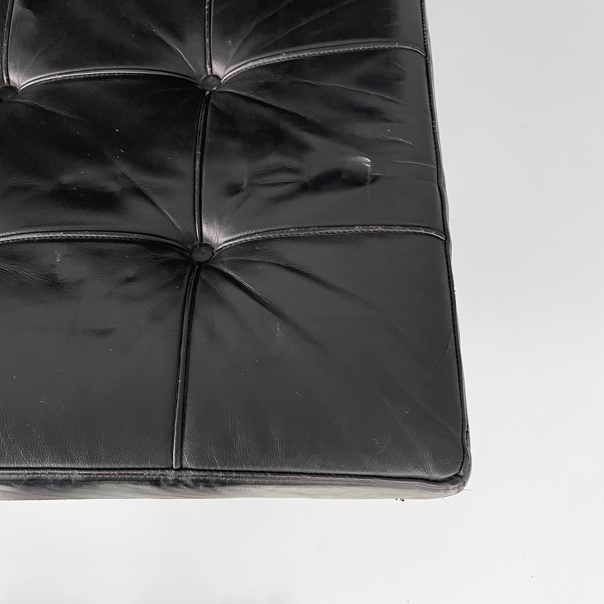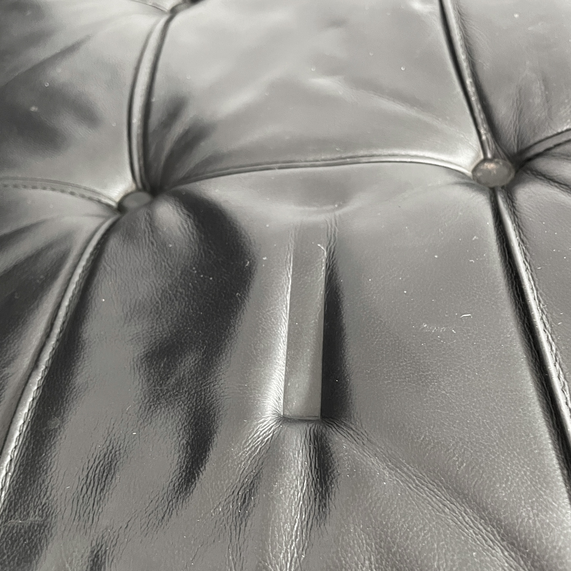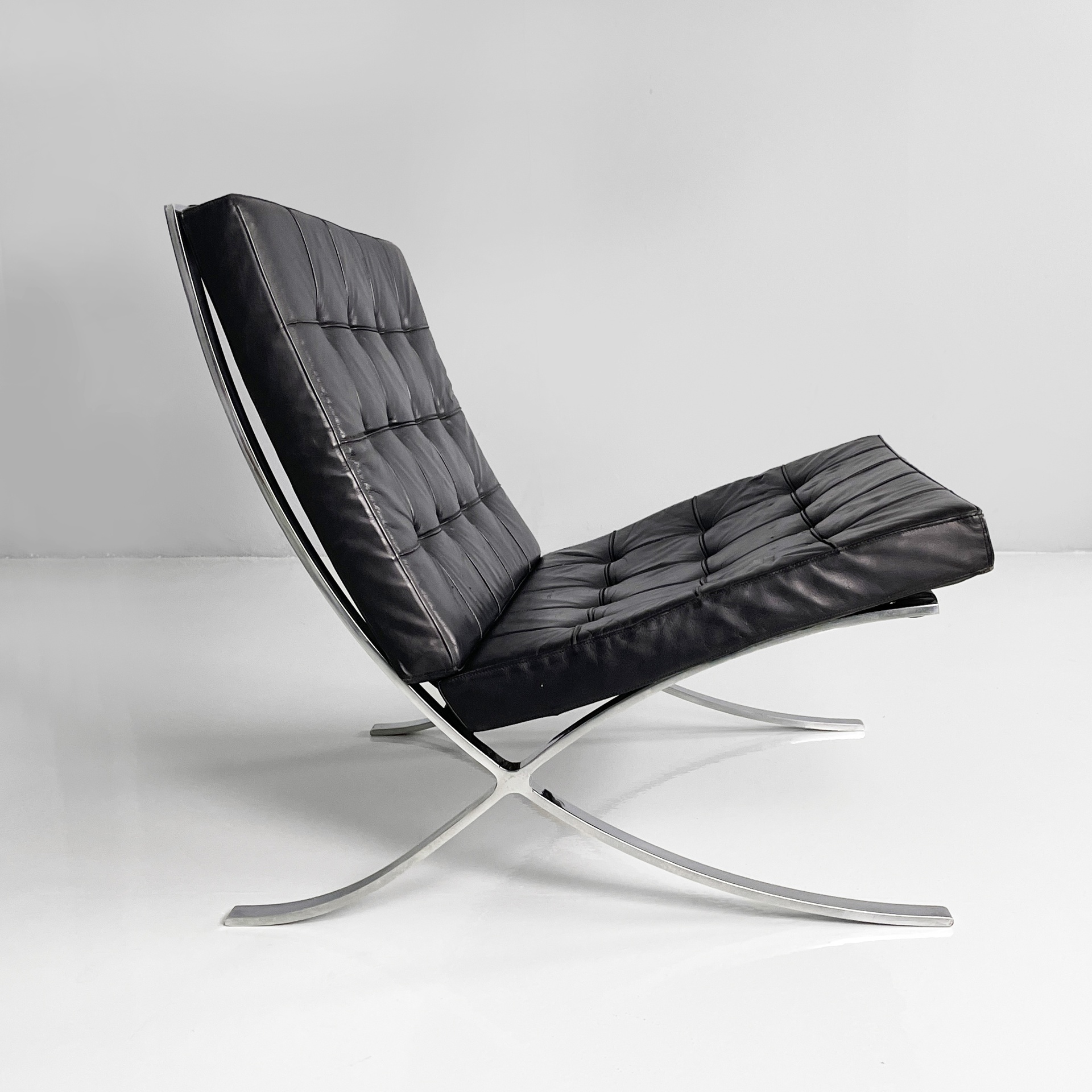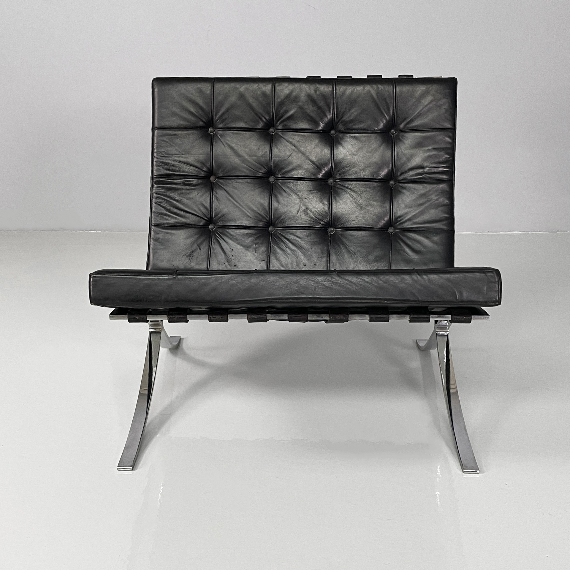 Coppia di poltrone in pelle nera e acciaio. Lo seduta e schienale sono due cuscini squadrati rivestiti in pelle nera con bottoni tondi, i quali sono sostenuti da cinghie in cuoio. La struttura e le zampe ad X sono composte da listelli in acciaio curvato.