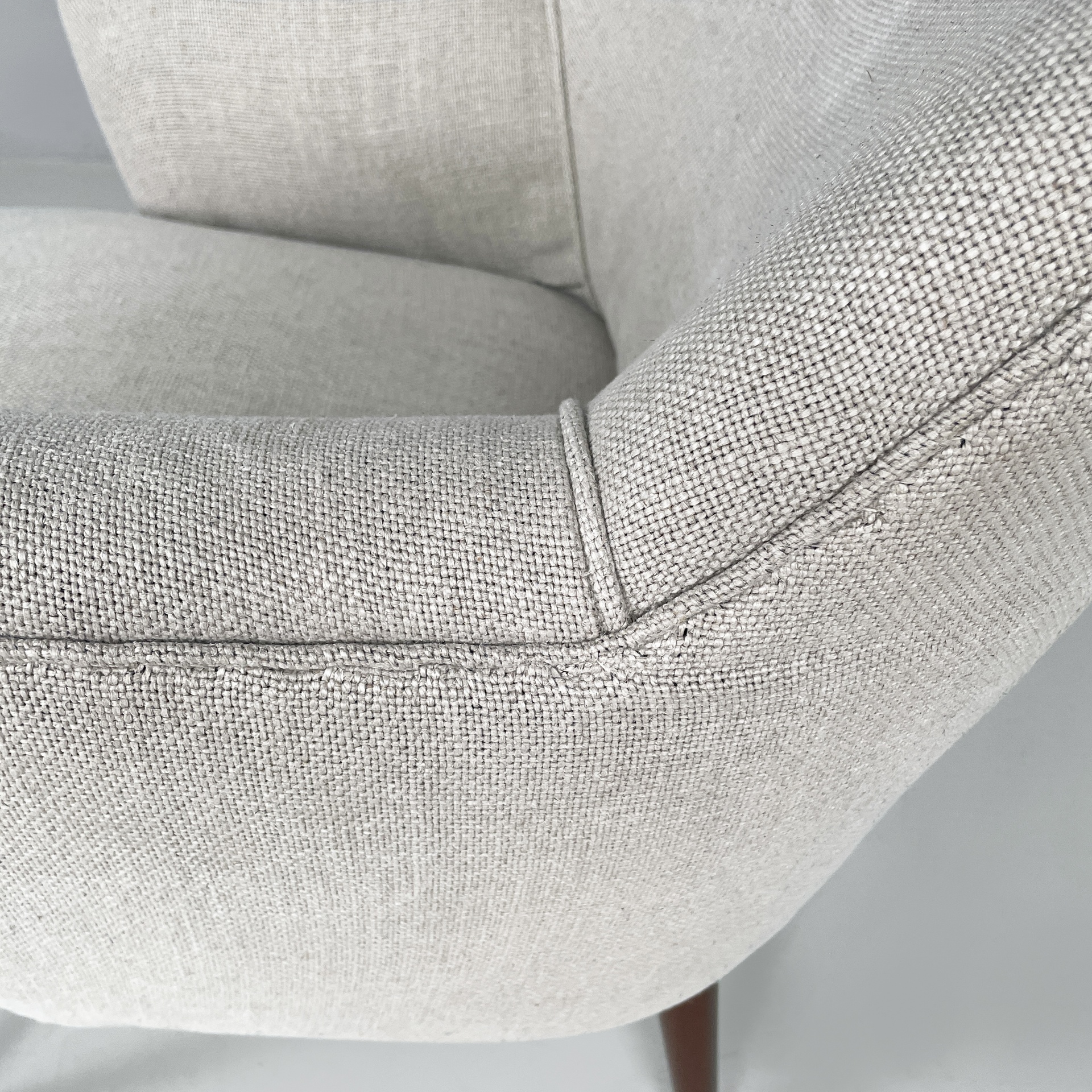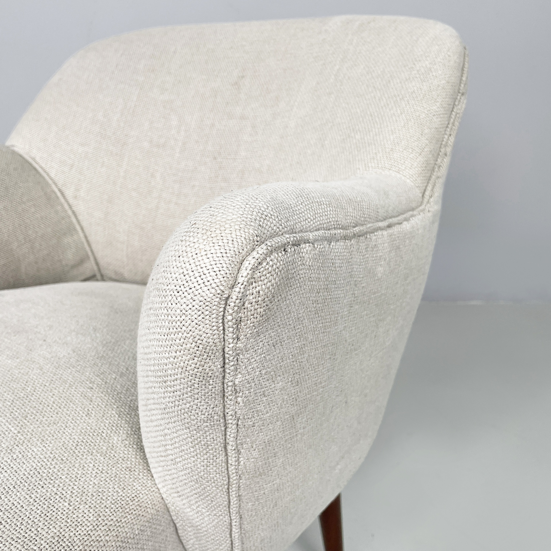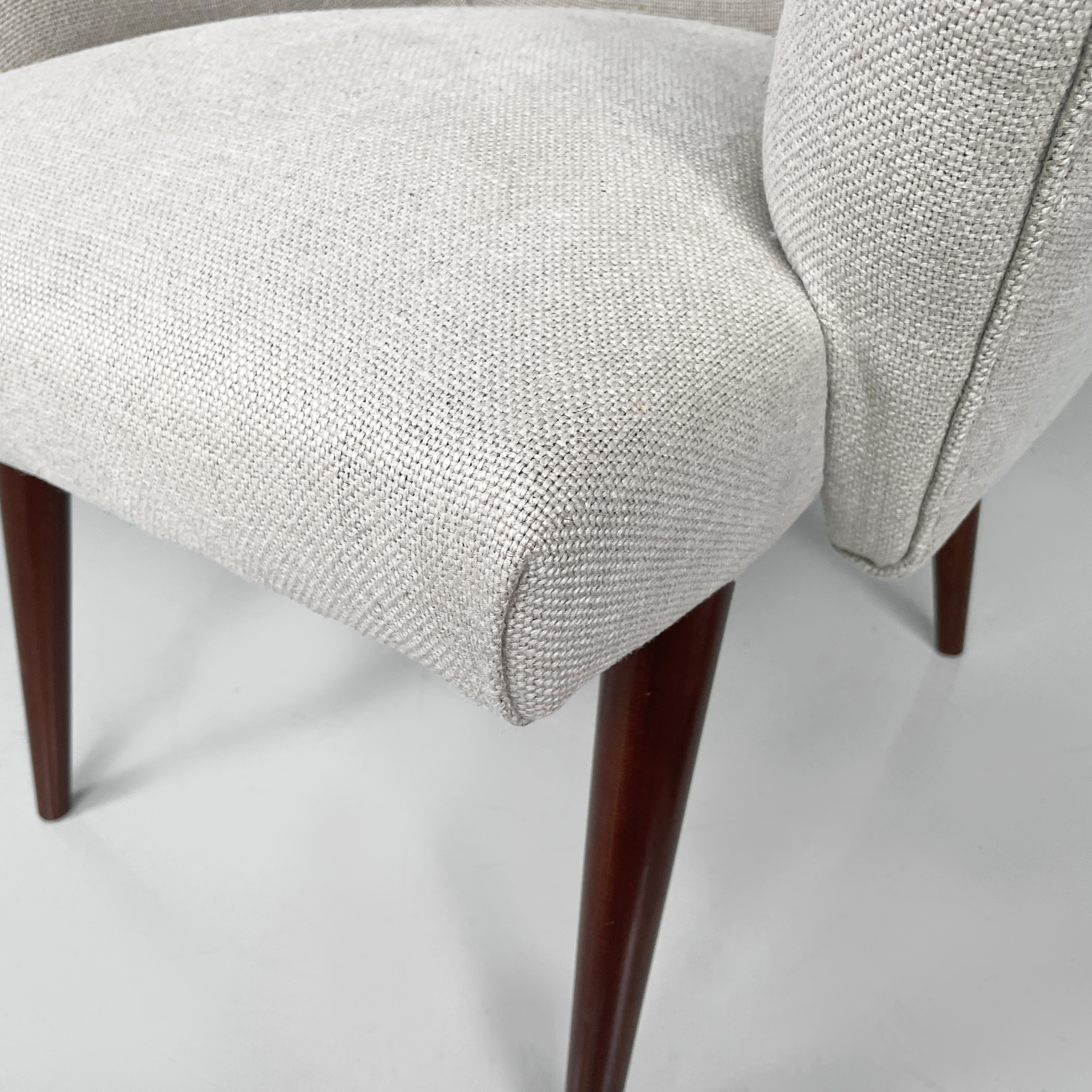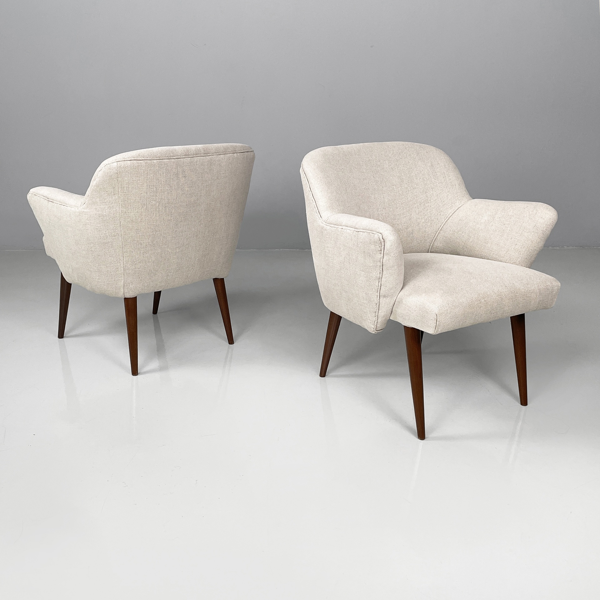 Coppia di poltrone con seduta, schienale e braccioli imbottiti e rivestiti in tessuto bianco-grigio chiaro. Le zampe a sezione tonda sono in legno scuro.