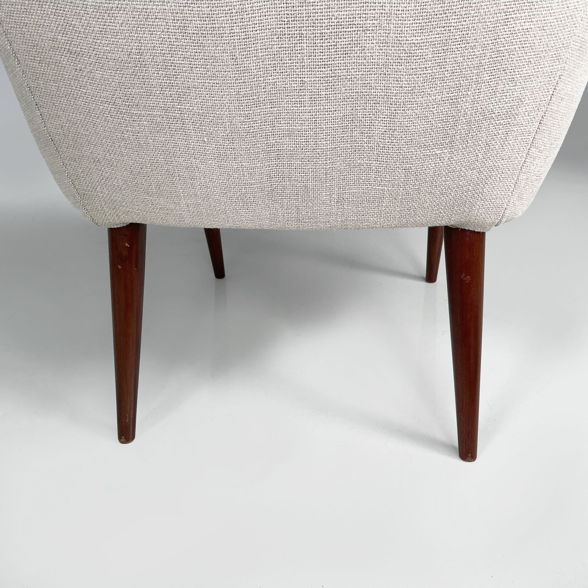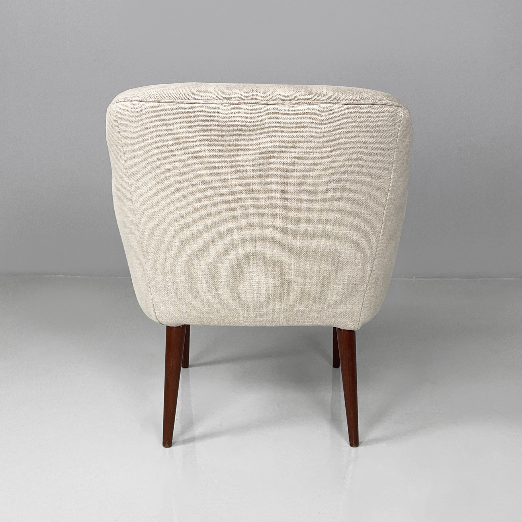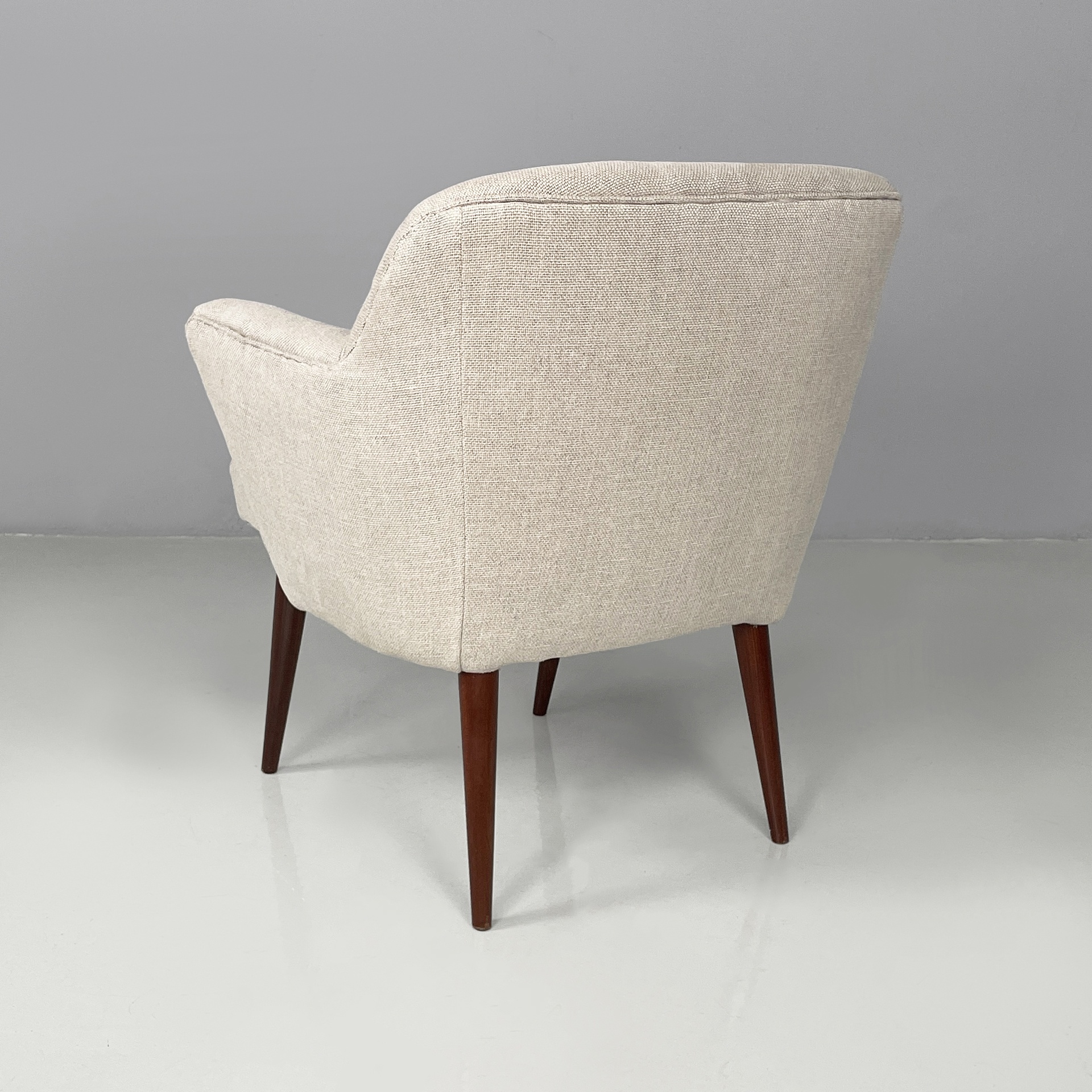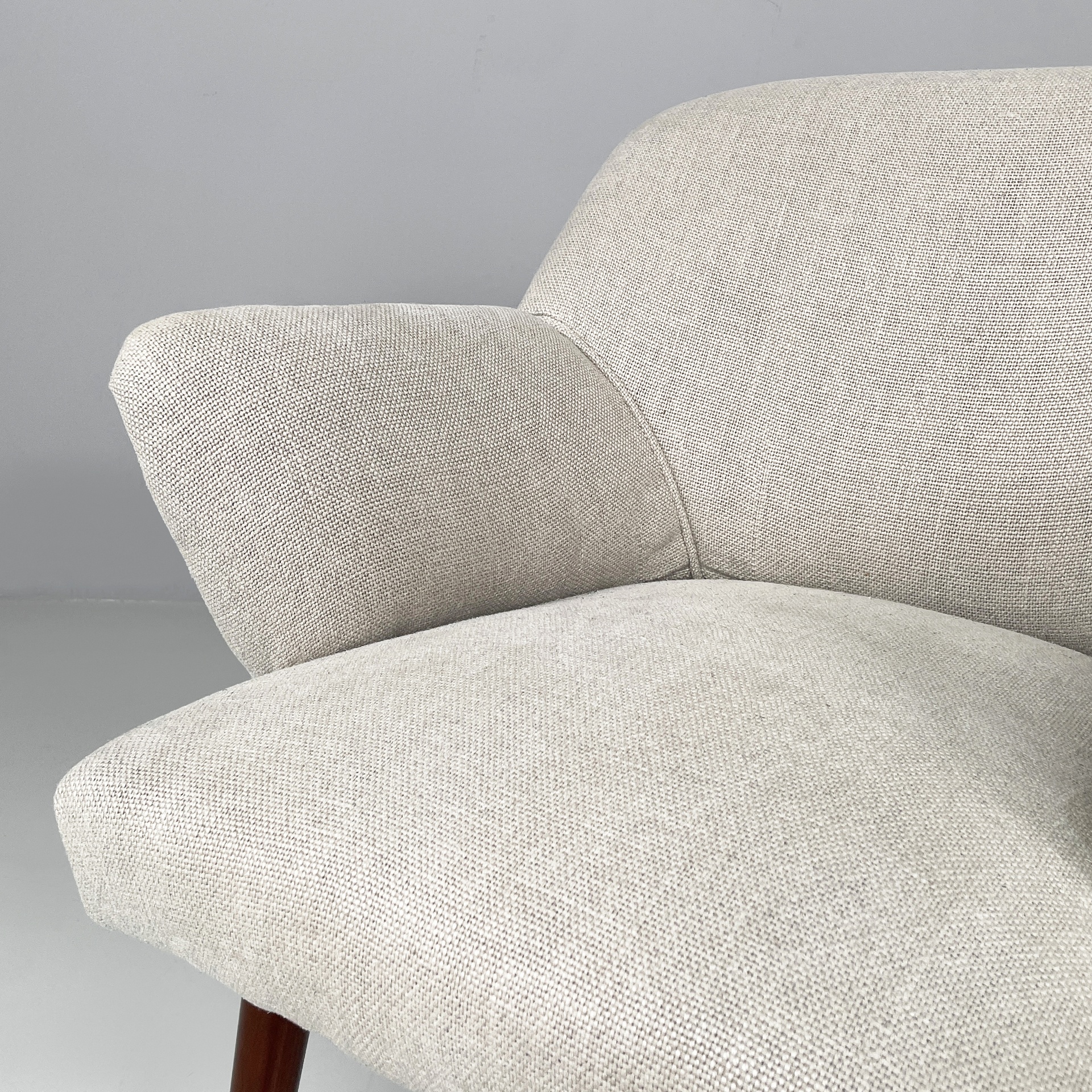 Coppia di poltrone con seduta, schienale e braccioli imbottiti e rivestiti in tessuto bianco-grigio chiaro. Le zampe a sezione tonda sono in legno scuro.