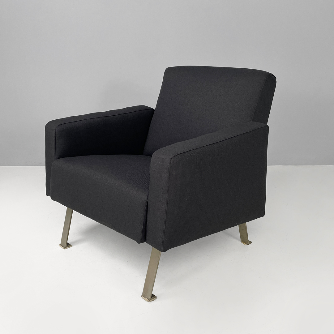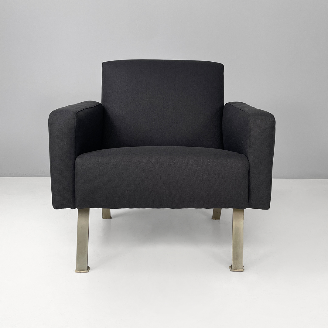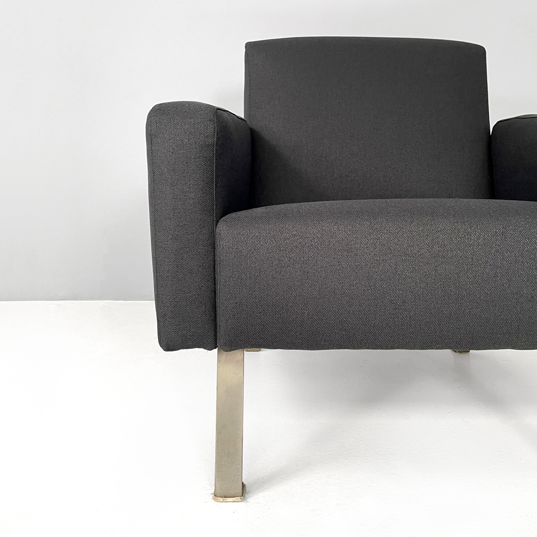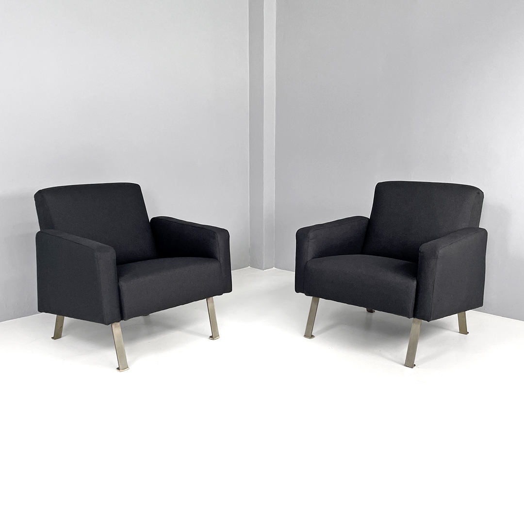 Pair of black fabric armchairs. The seat backrest and armrests have linear squared and essential shapes. The four legs are in chromed metal and have the ground support “bent” inwards for the two in front and outwards for the two in back to create a decoration.