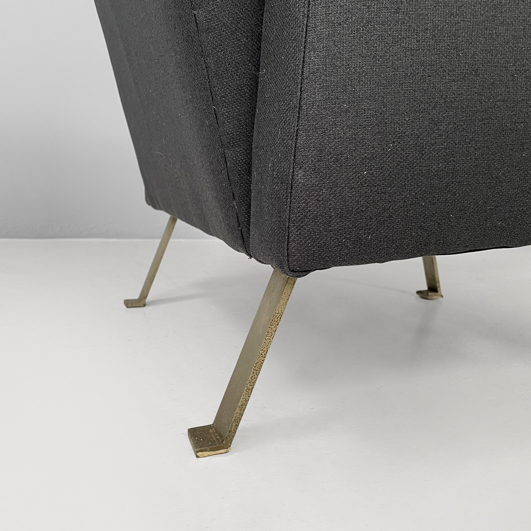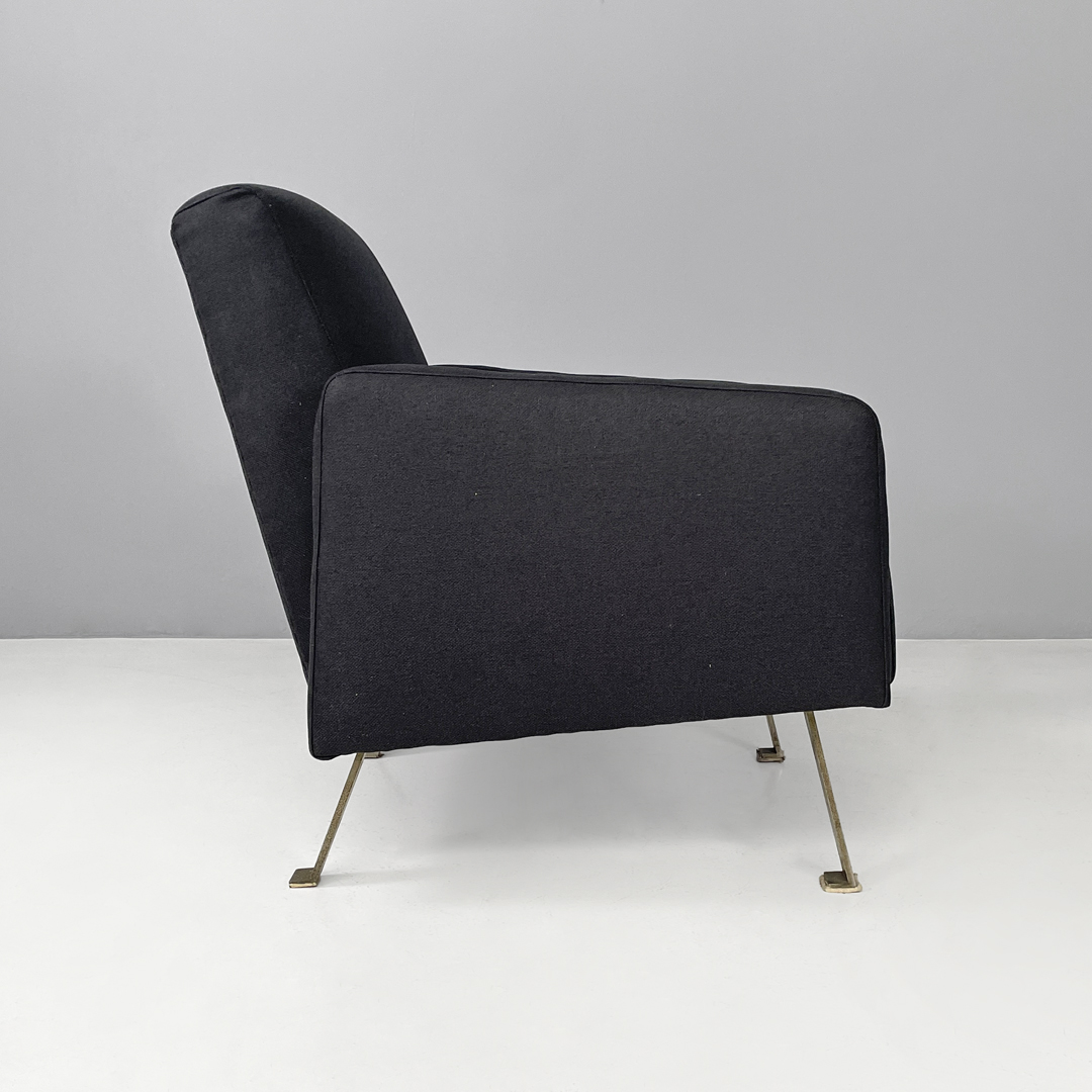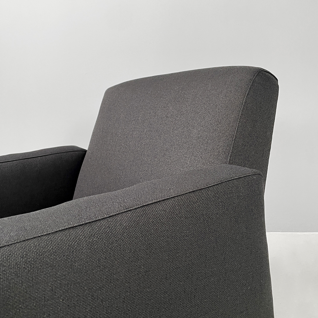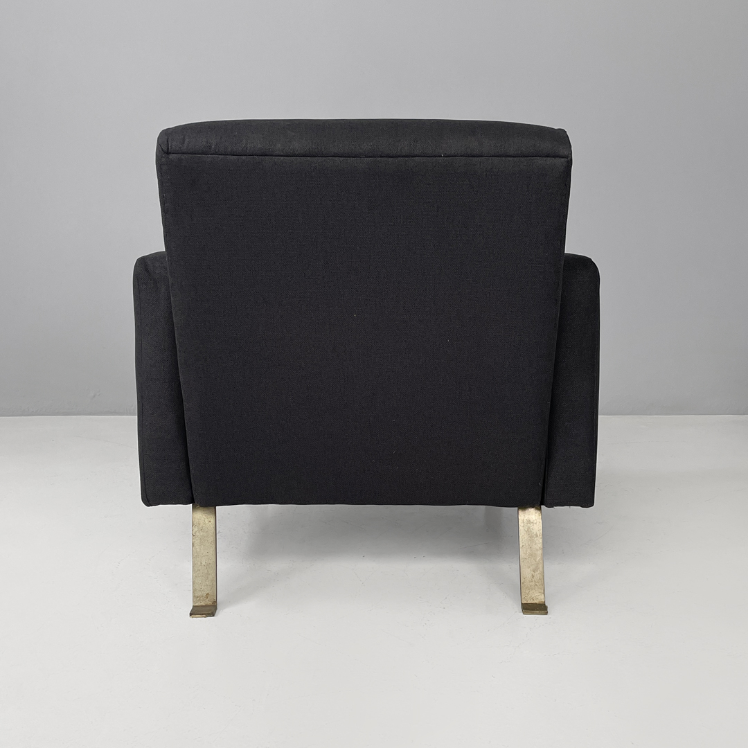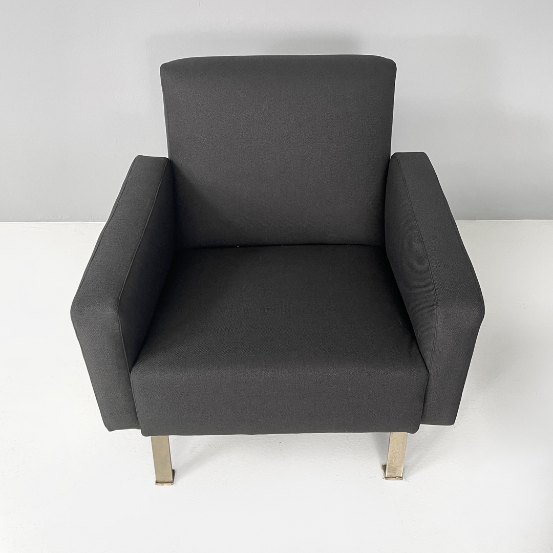 Pair of black fabric armchairs. The seat backrest and armrests have linear squared and essential shapes. The four legs are in chromed metal and have the ground support “bent” inwards for the two in front and outwards for the two in back to create a decoration.